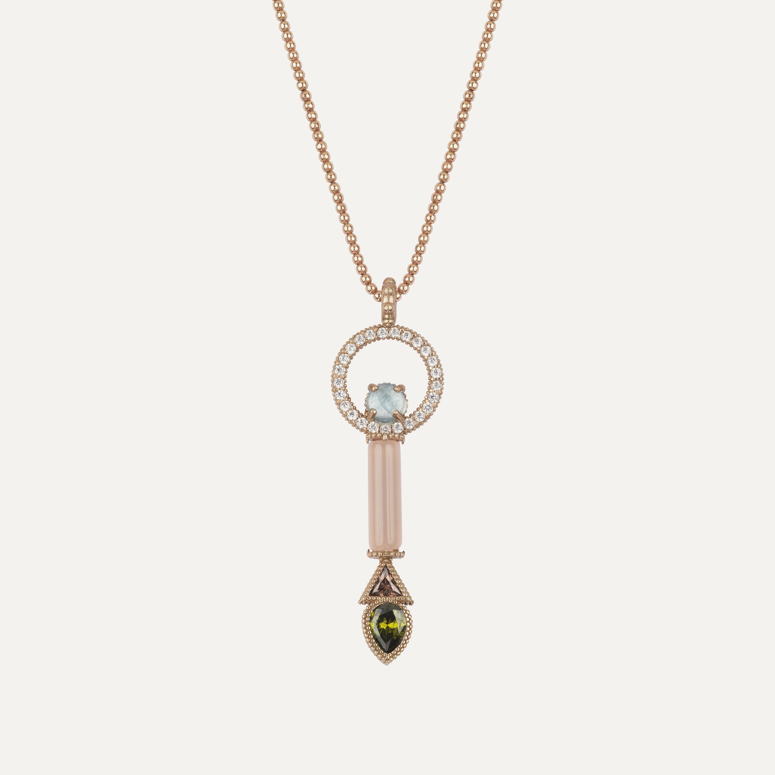 Pendant made of 925 sterling silver with 24kt rose gold plating, rose quartz, aquamarine and zirconia.