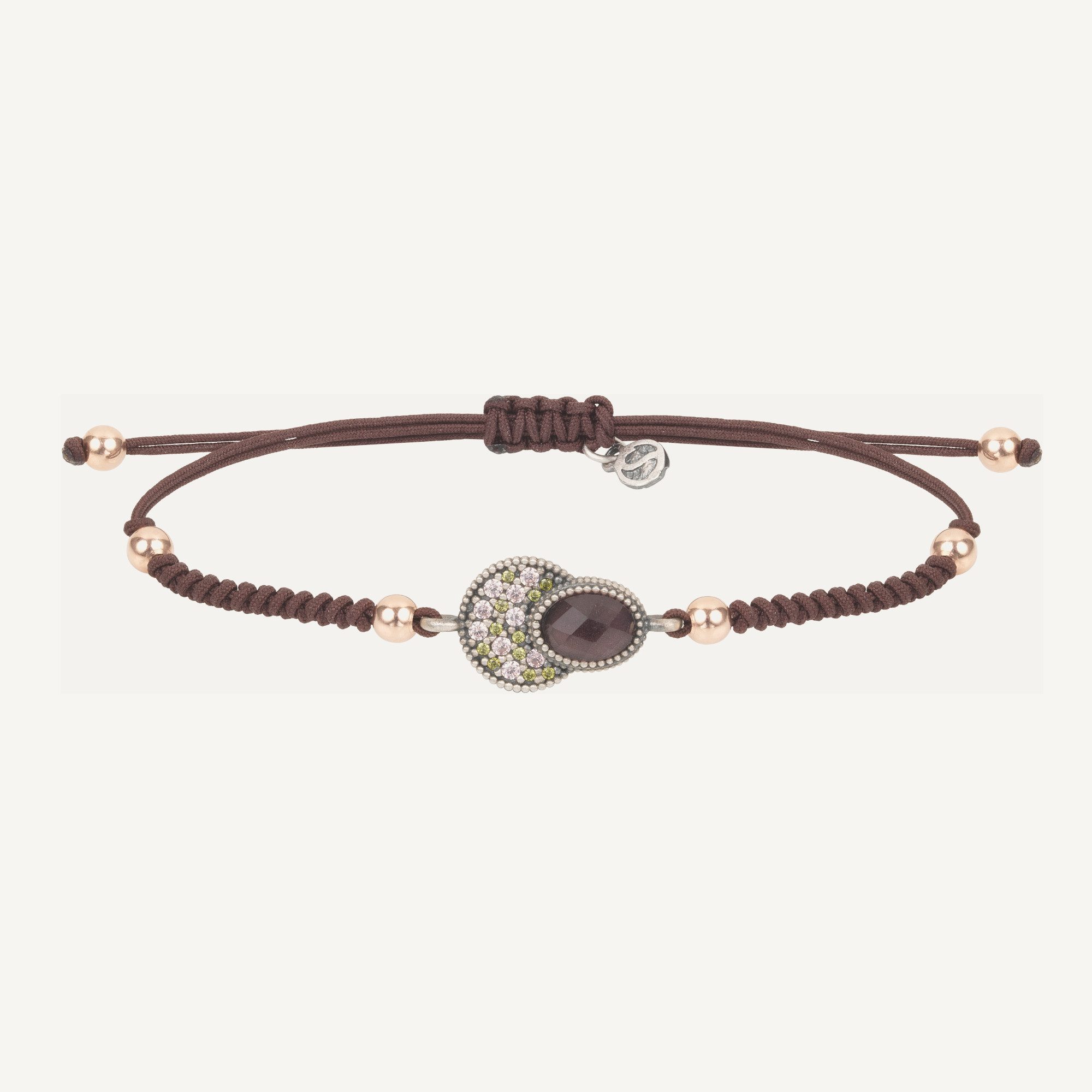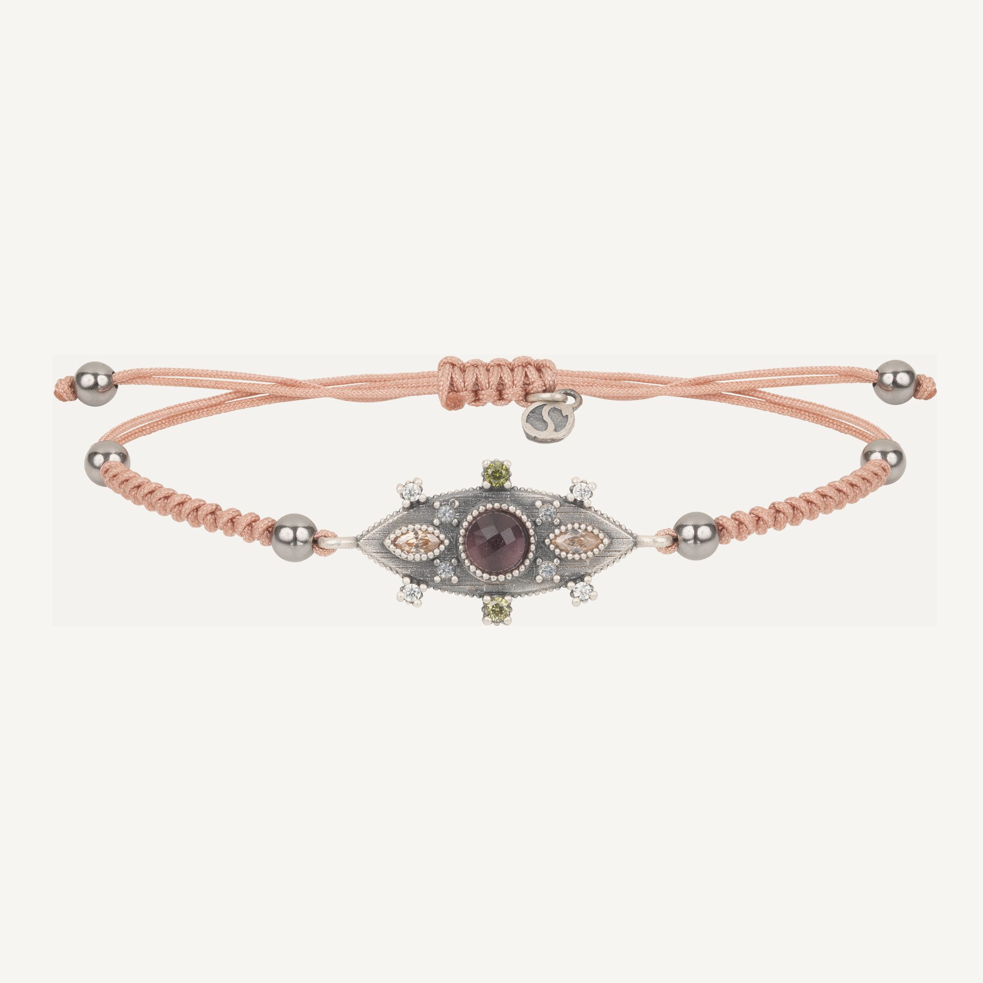 925 sterling silver bracelet with antique finish, pink tourmaline, zirconia and nylon.