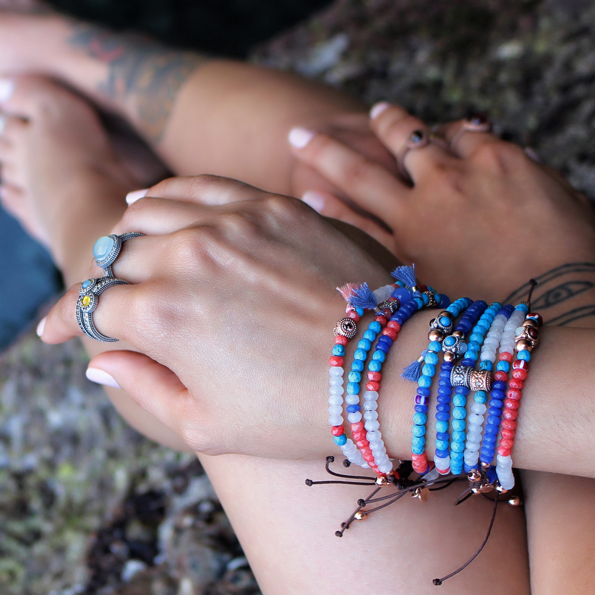 Bracelet made of sterling silver, quartz, turquoise, garnets, zircons, glass beads and nylon.