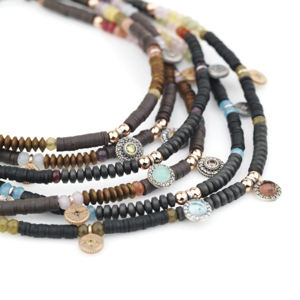 925 sterling silver bracelet with 9kt gold, chalcedony, crystal beads, hematite, rubber and nylon.