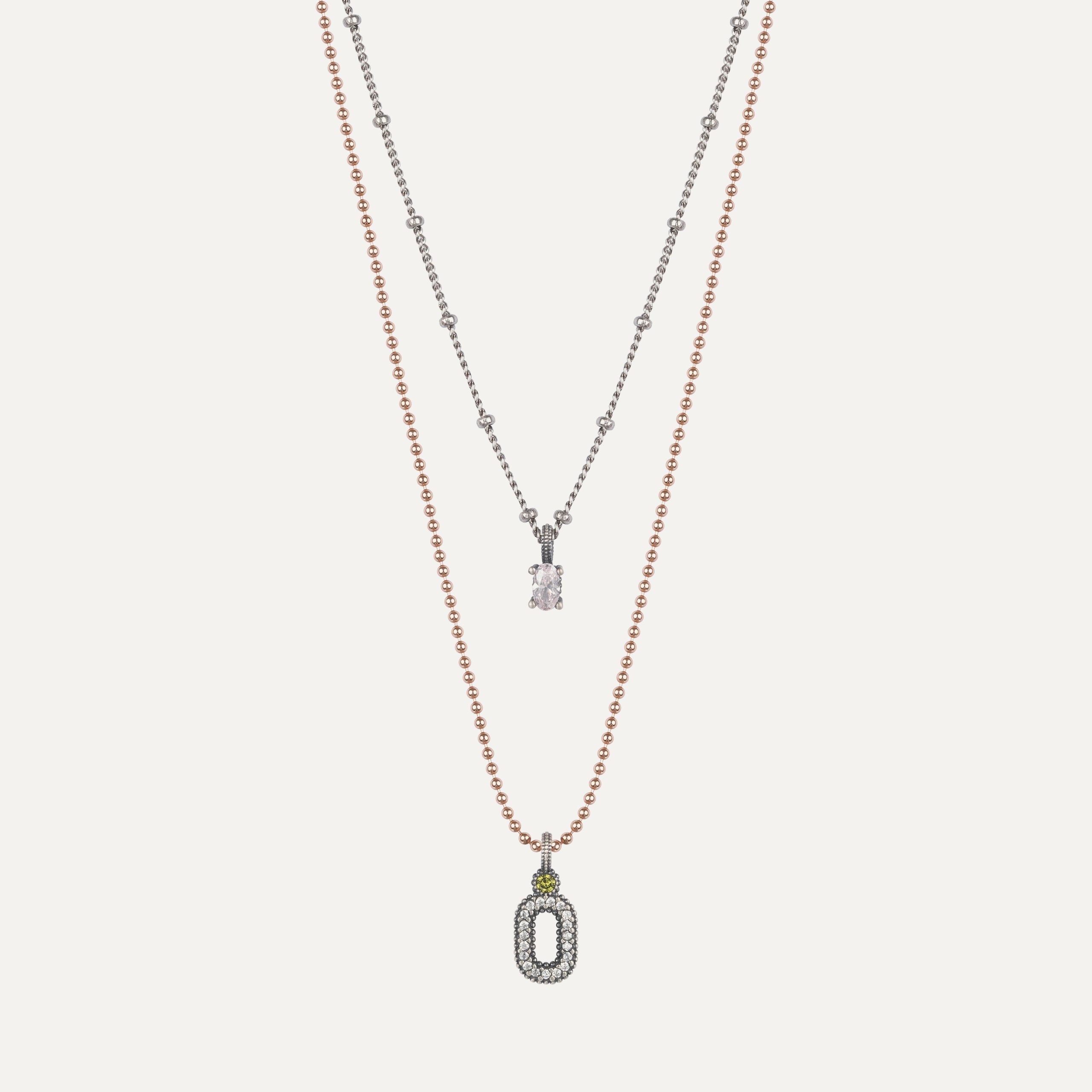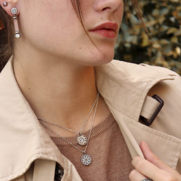 Pendant made of sterling silver, agate, zirconia, glass beads, rubber and nylon.
