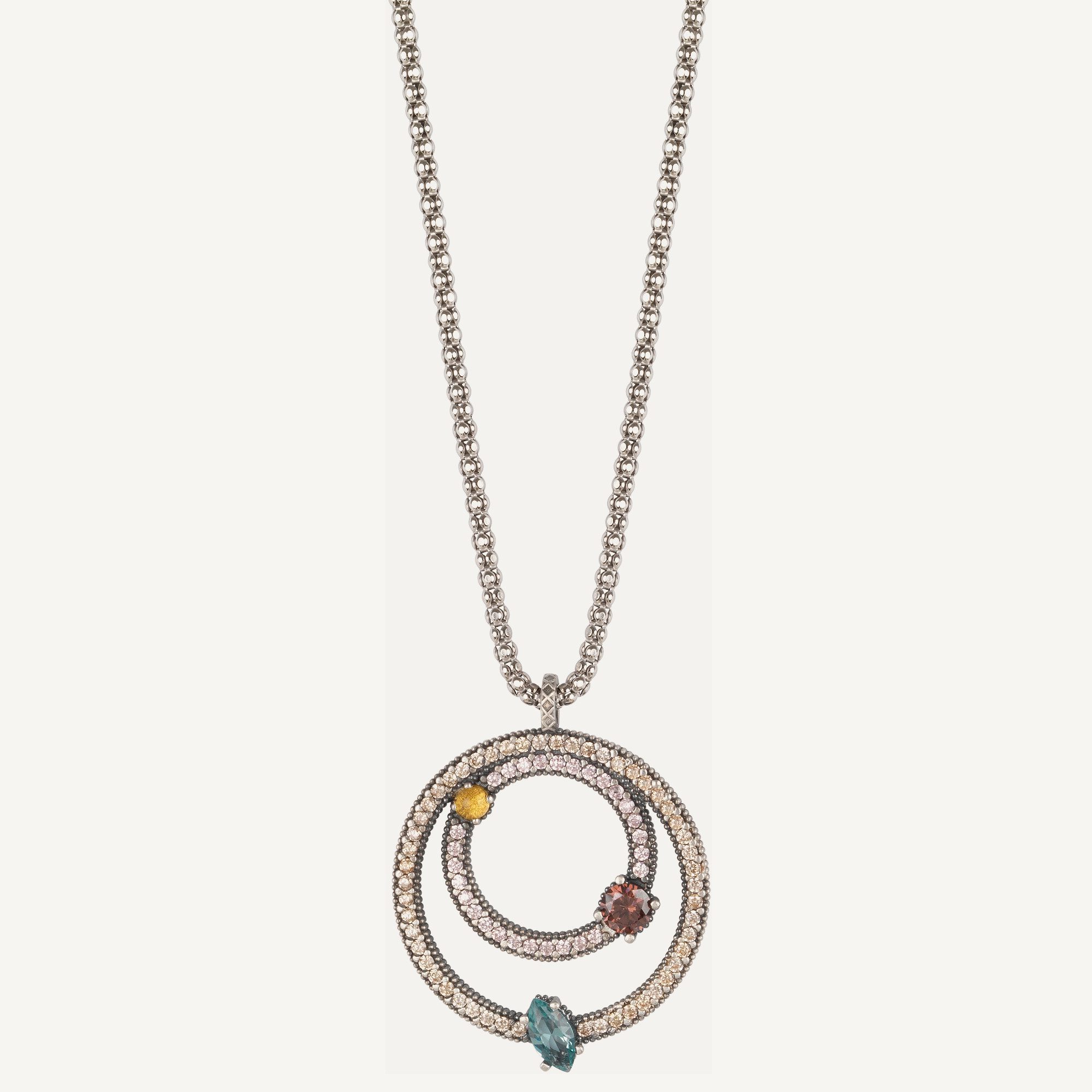 Necklace made of 925 sterling silver with 24kt rose gold plating, black beads and green, white and black zirconia.