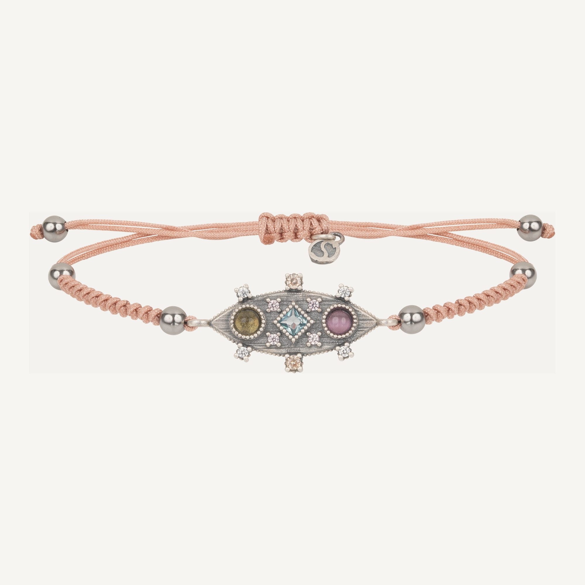 925 sterling silver bracelet with antique finish, citrine, pink tourmaline, zirconia and nylon.