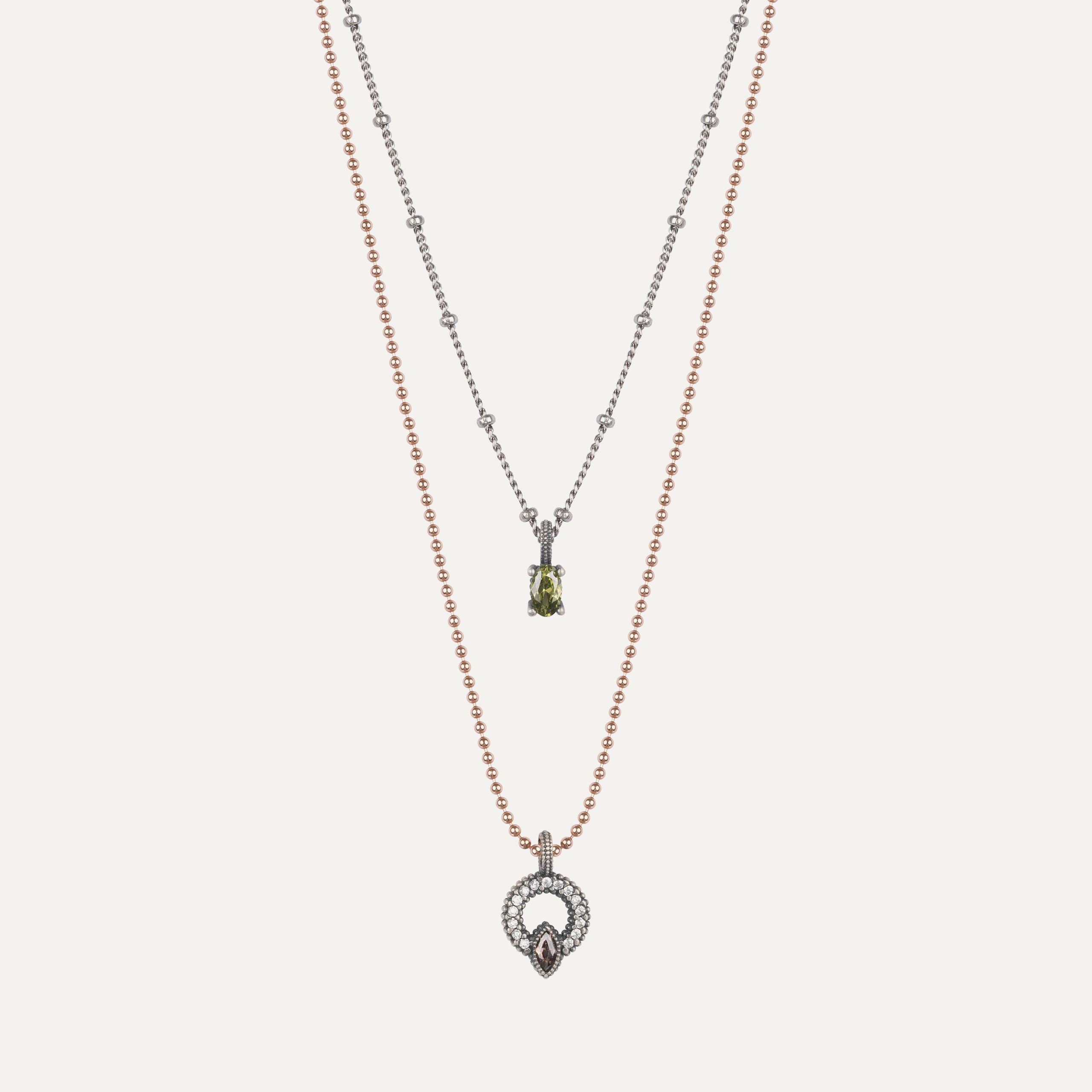 Pendant made of 925 sterling silver with 24kt rose gold plating, pink tourmaline, green chalcedony, baroque pearls and zircons.