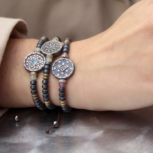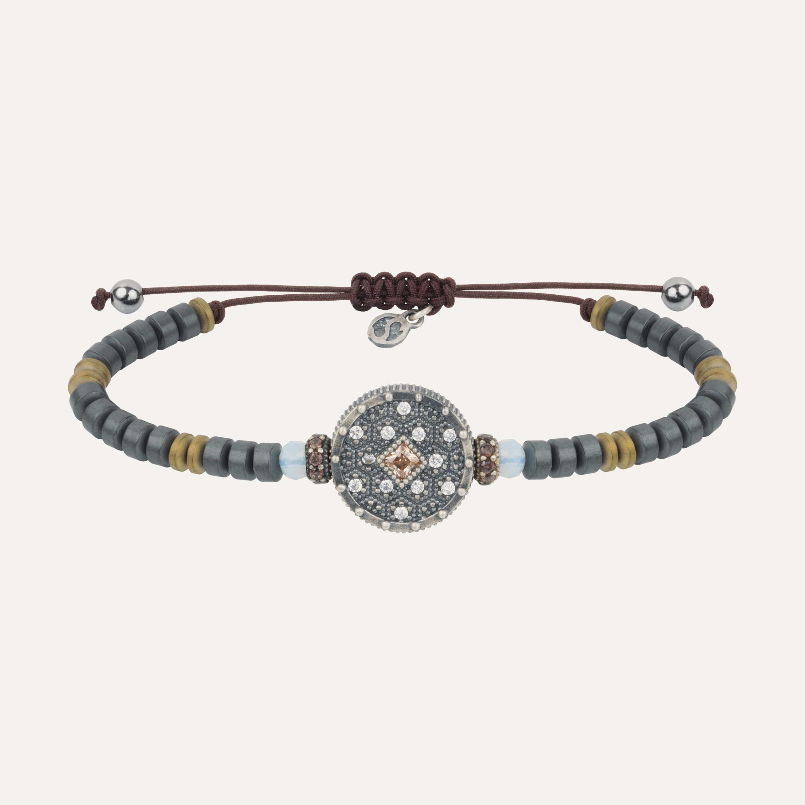 925 sterling silver bracelet with zircons, glass beads, hematite and nylon.