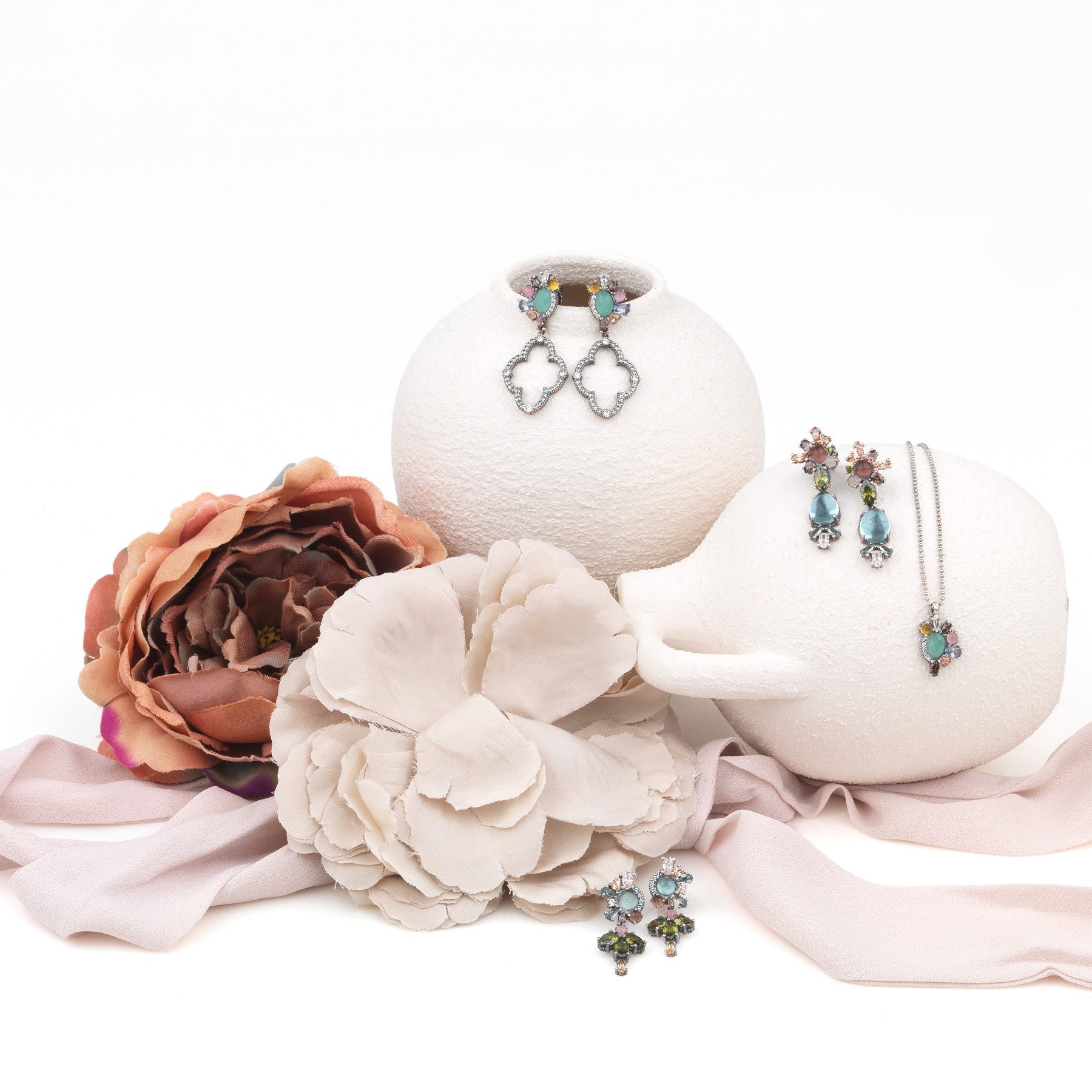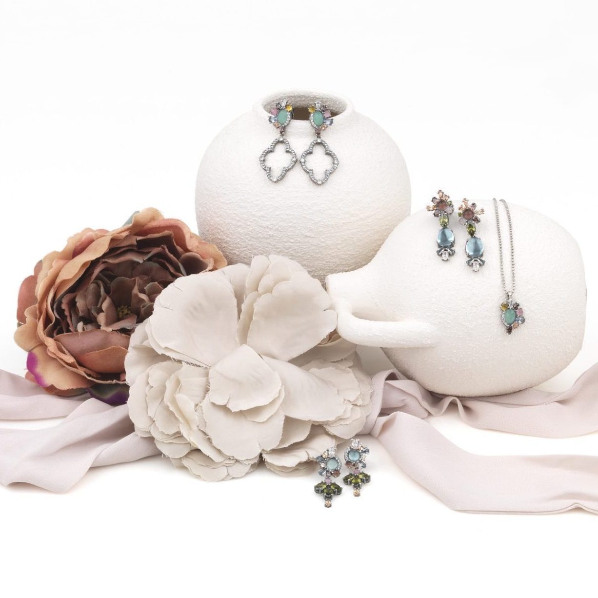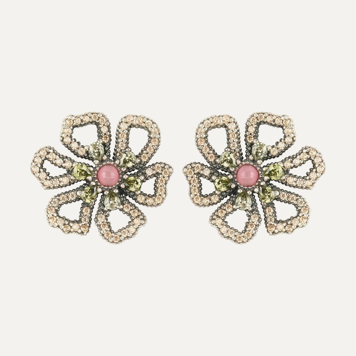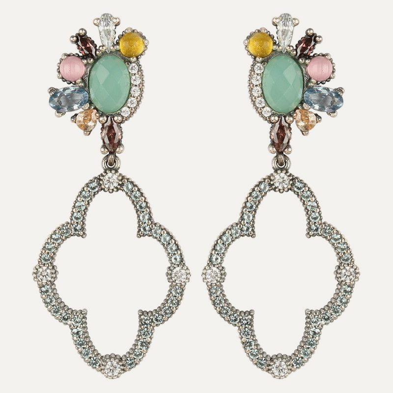 925 sterling silver, quartz and zirconia earrings in two finishes: antique silver or 24kt rose gold plated.
