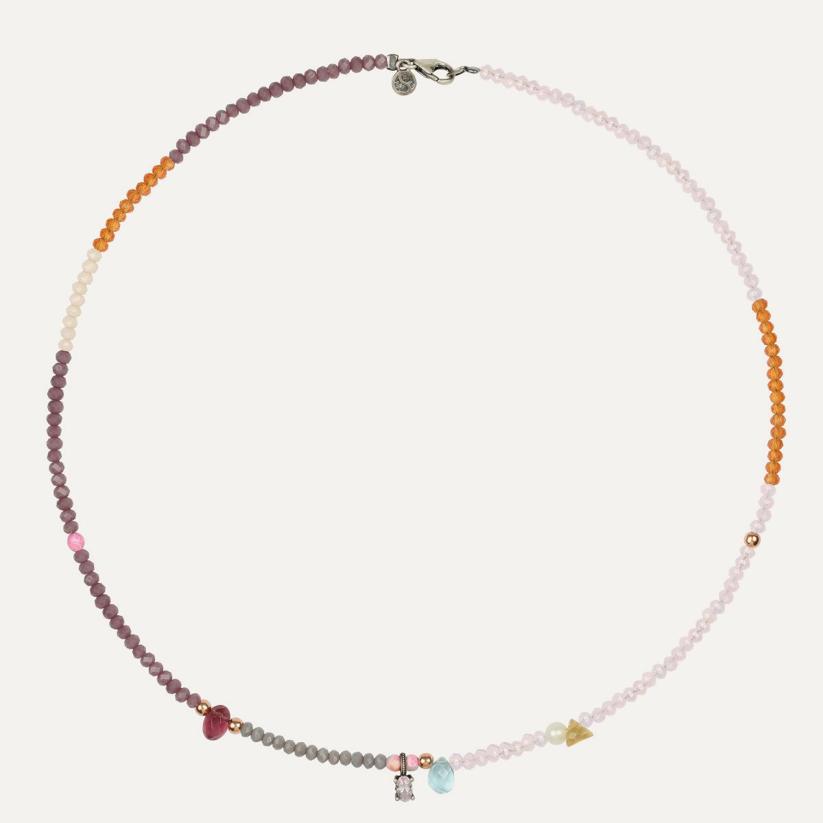 Pendant made of sterling silver, rose quartz, chalcedony, pink tourmaline, pearl, zirconia and crystal beads.