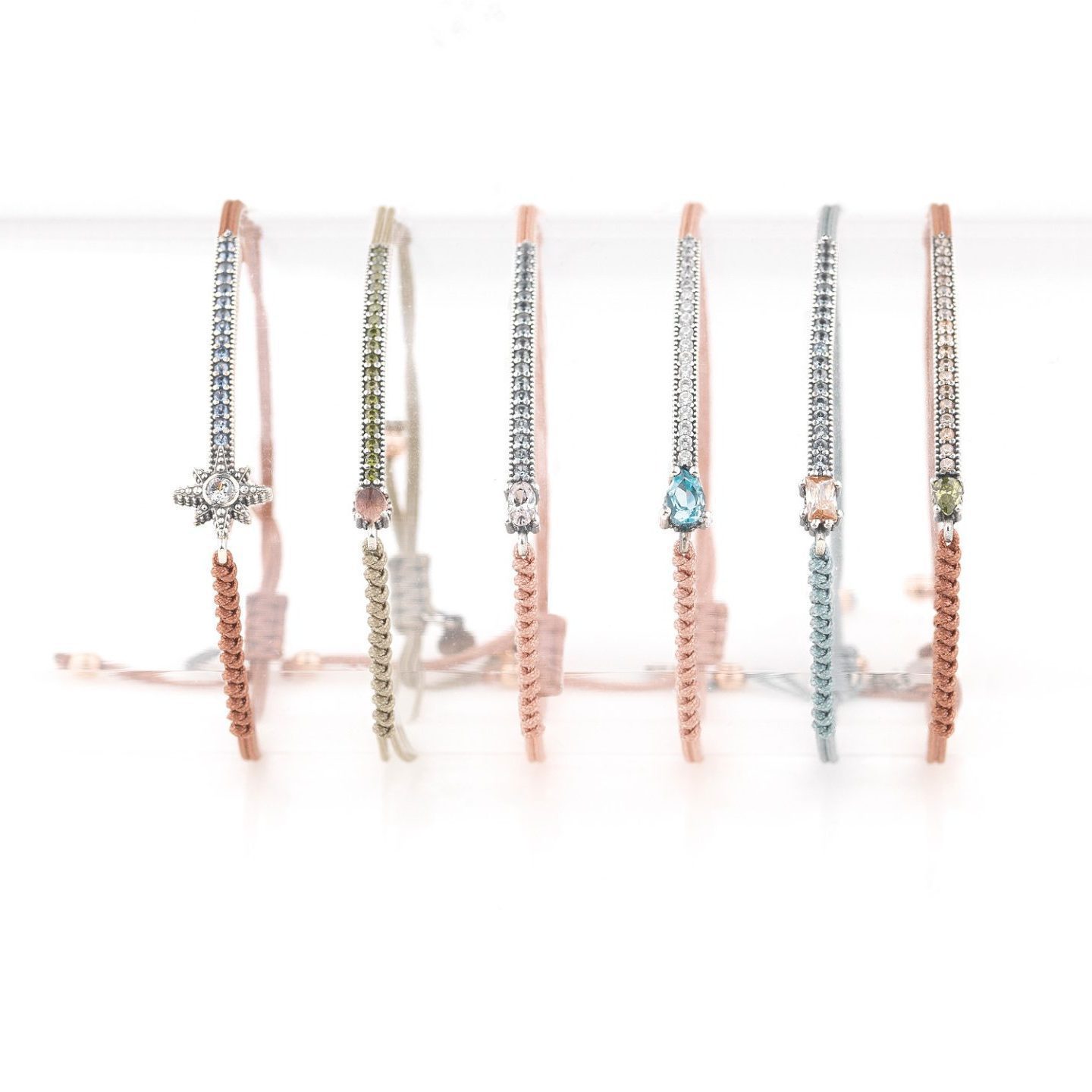 Bracelet made of 925 sterling silver, aquamarine quartz, zircons and nylon.