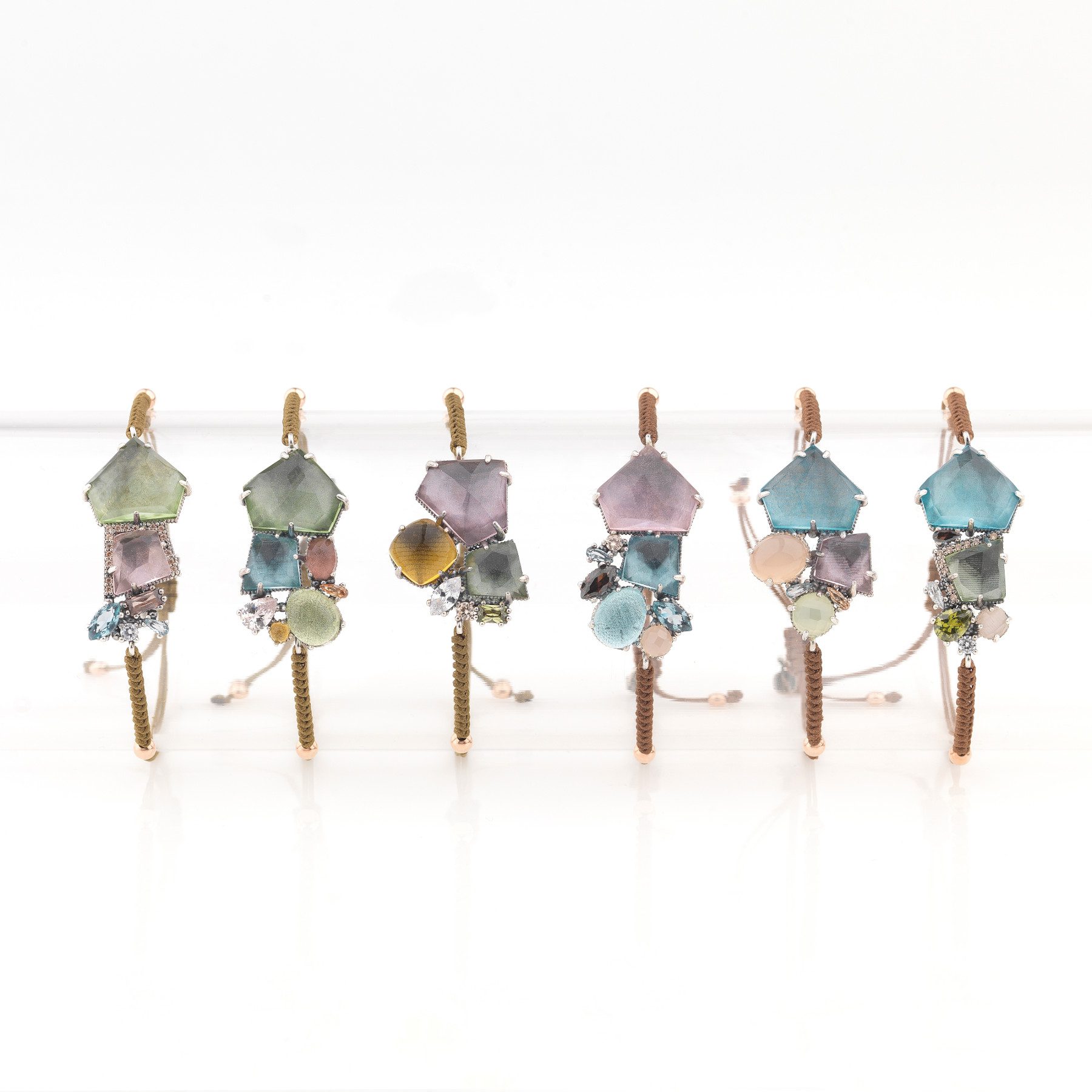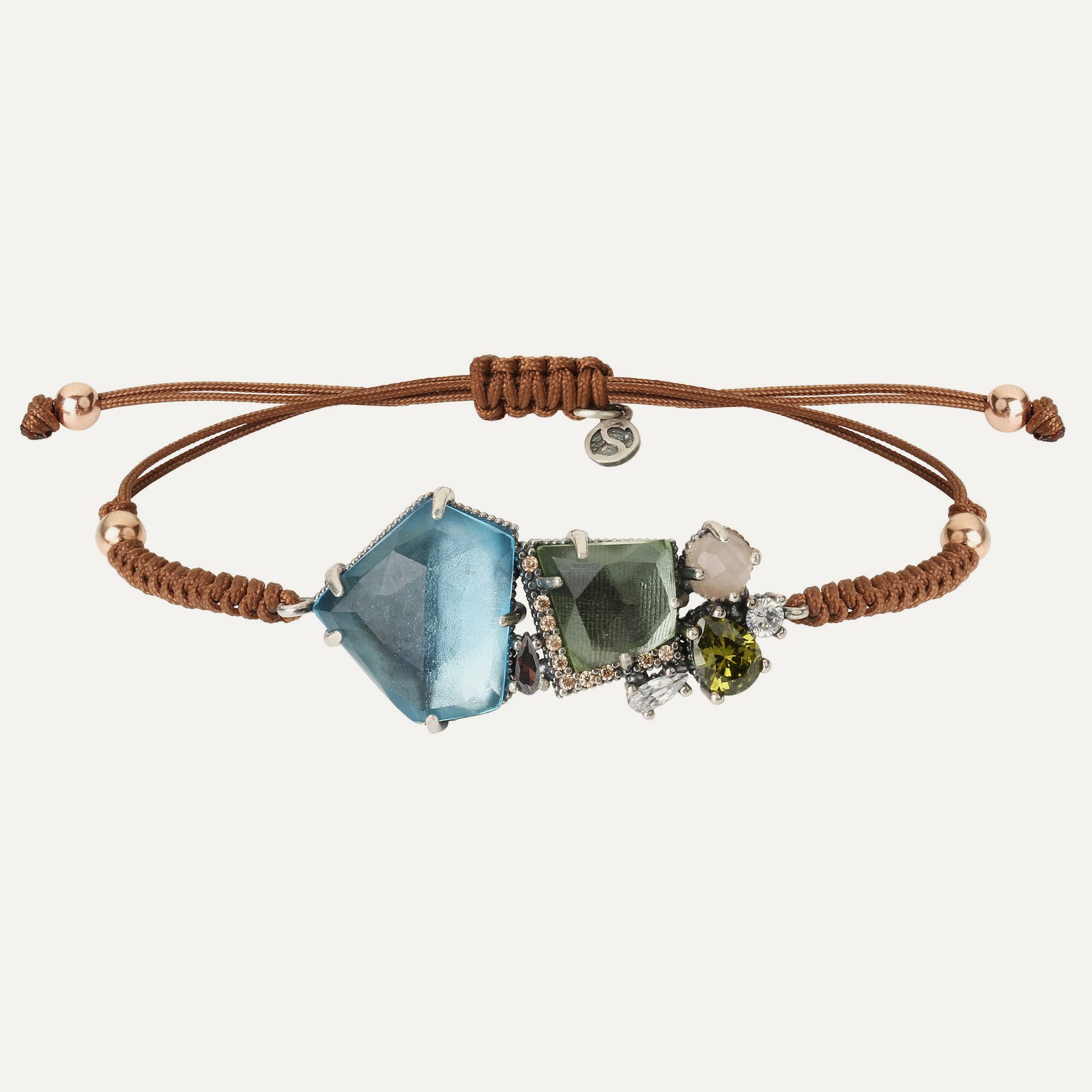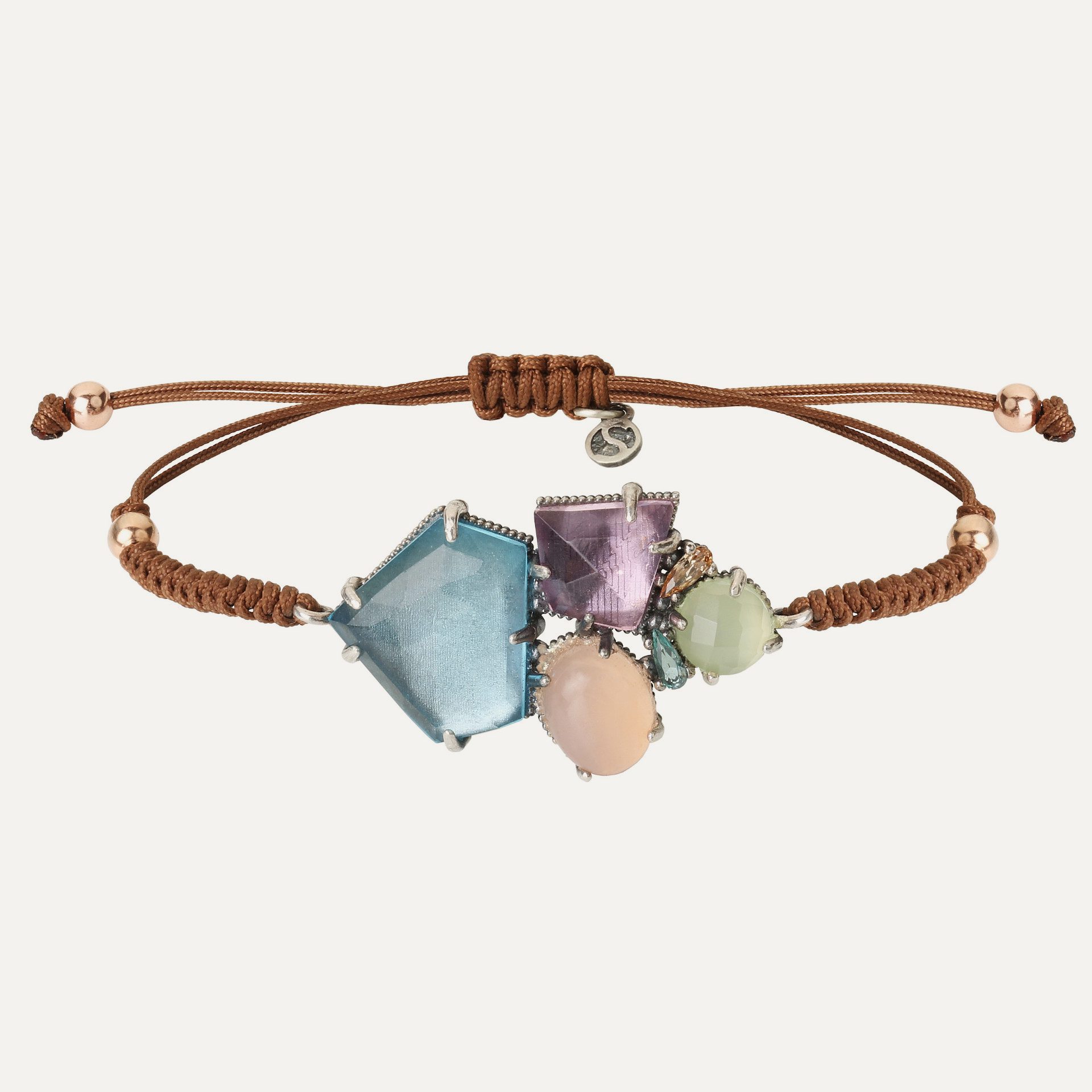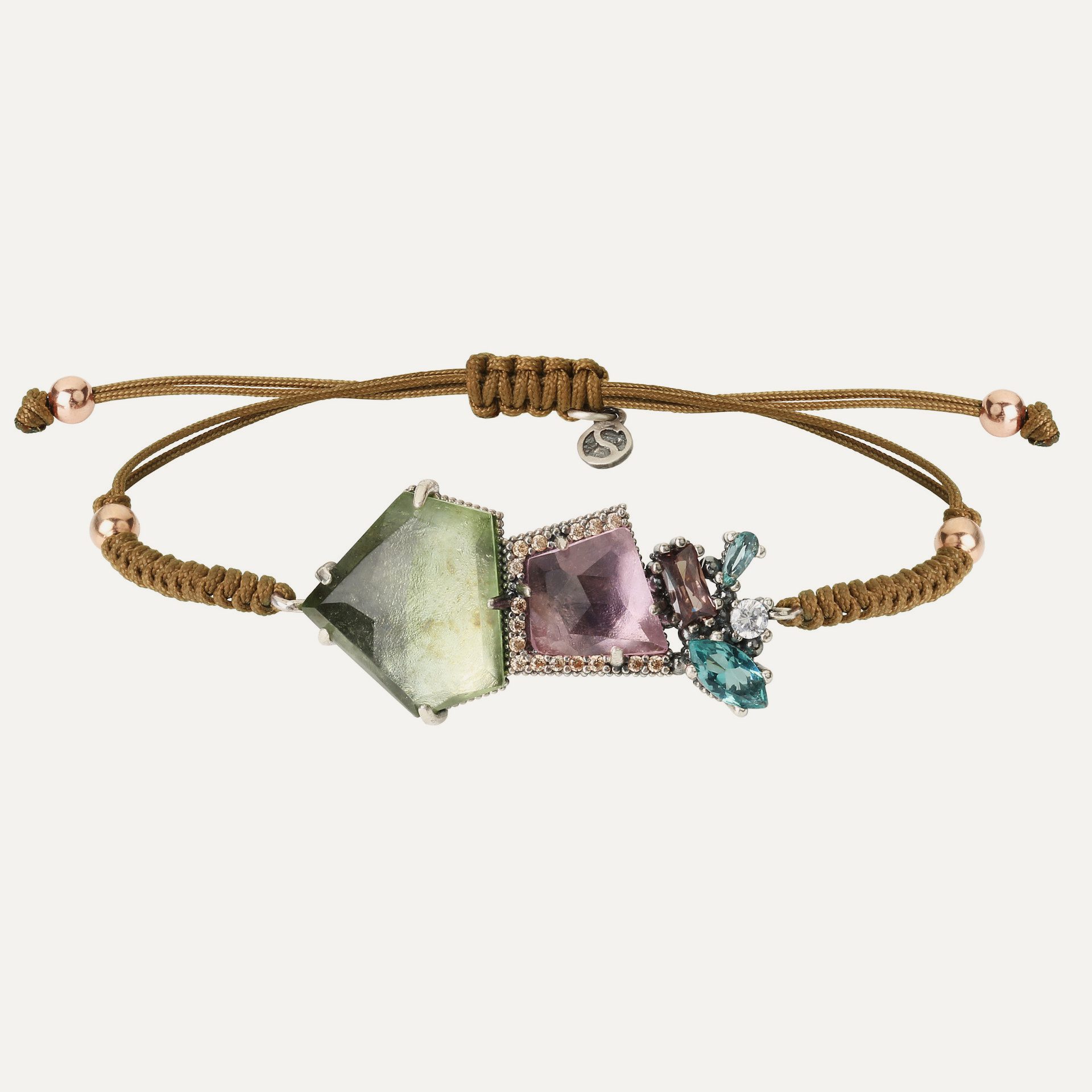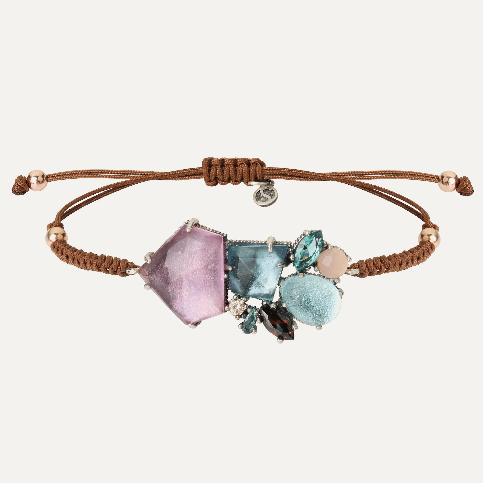 Bracelet made of 925 sterling silver, colored quartz (rose, violet and aquamarine), zircons and nylon.