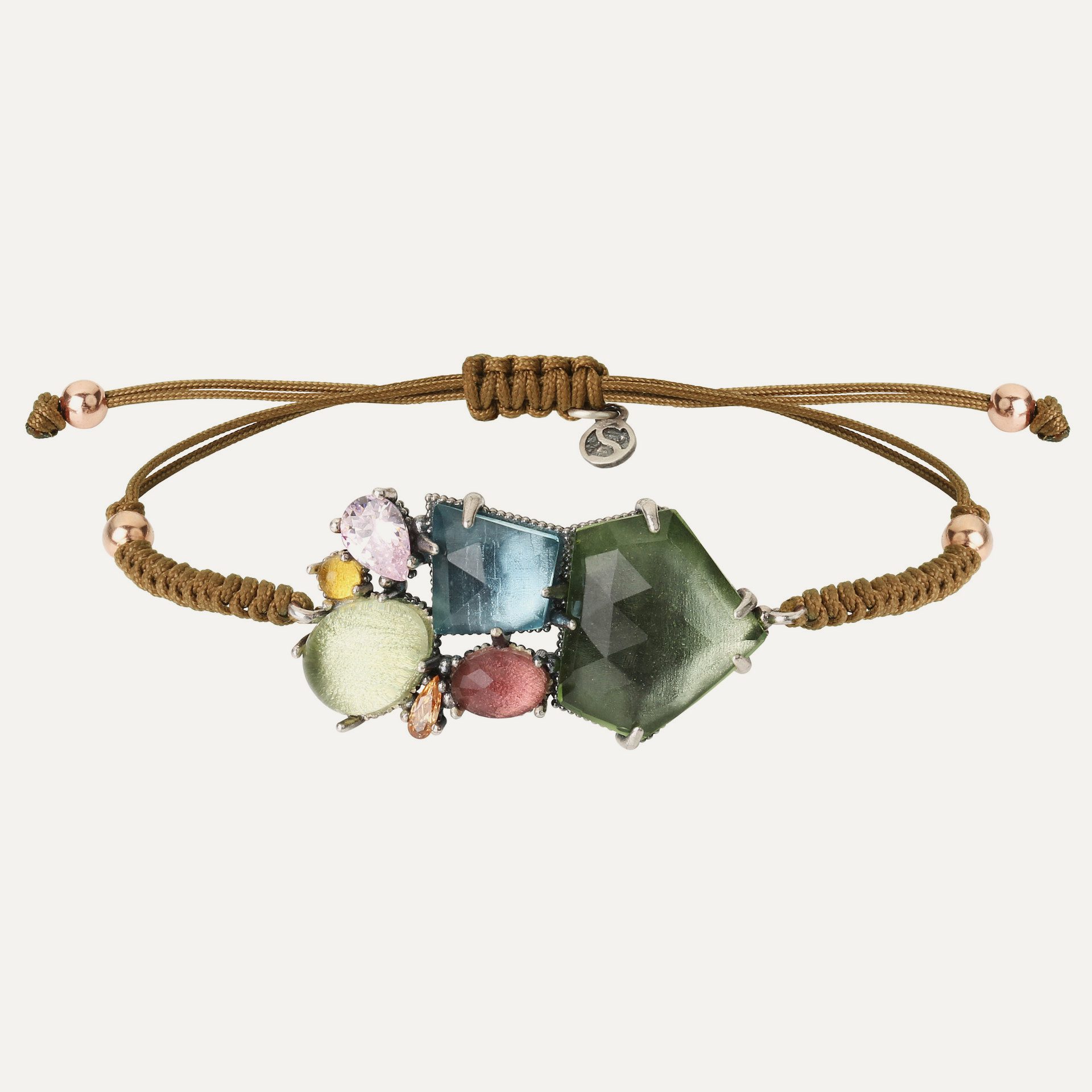 Bracelet made of 925 sterling silver, pink tourmaline, citrine, colored quartz (apple, aquamarine and green), zirconia and nylon.