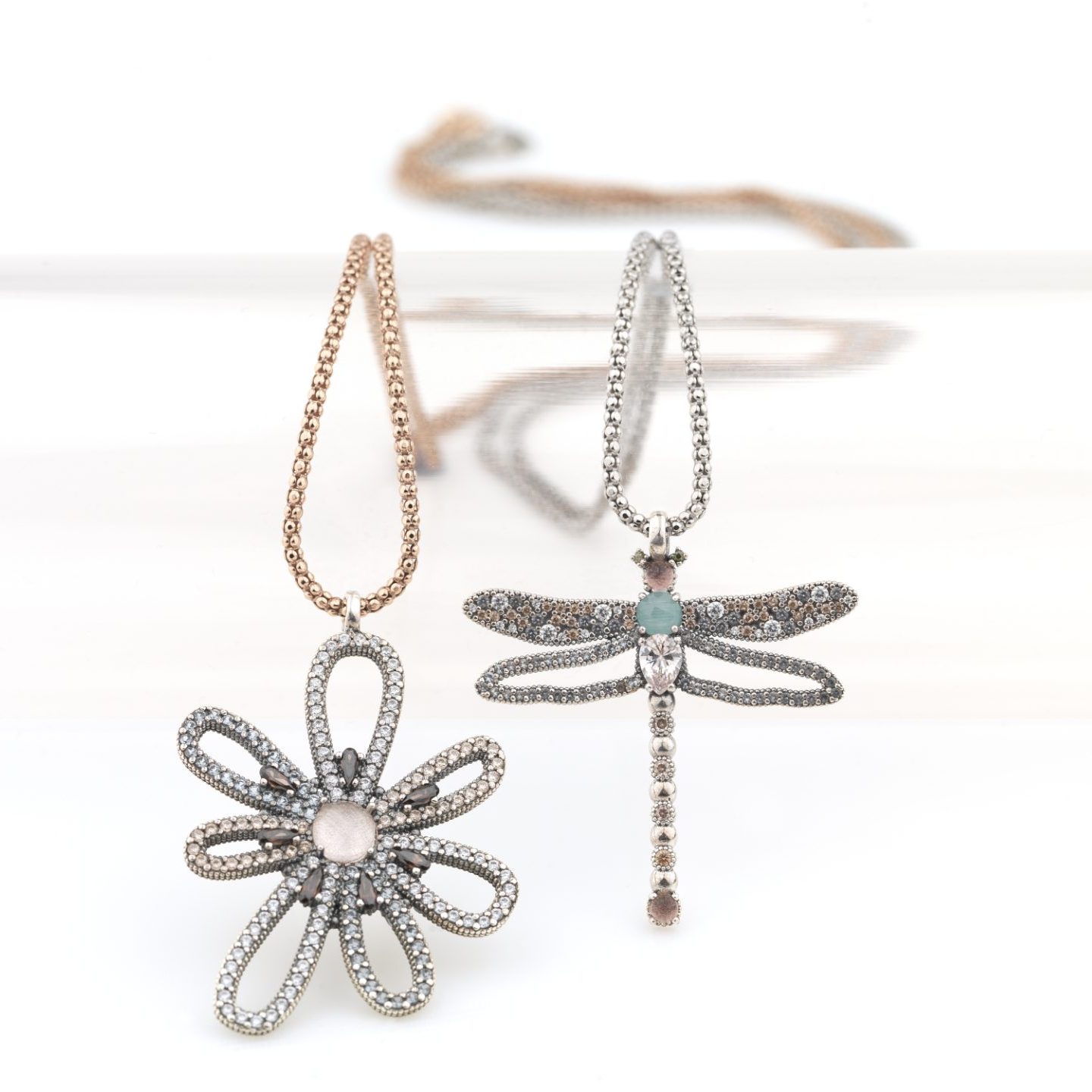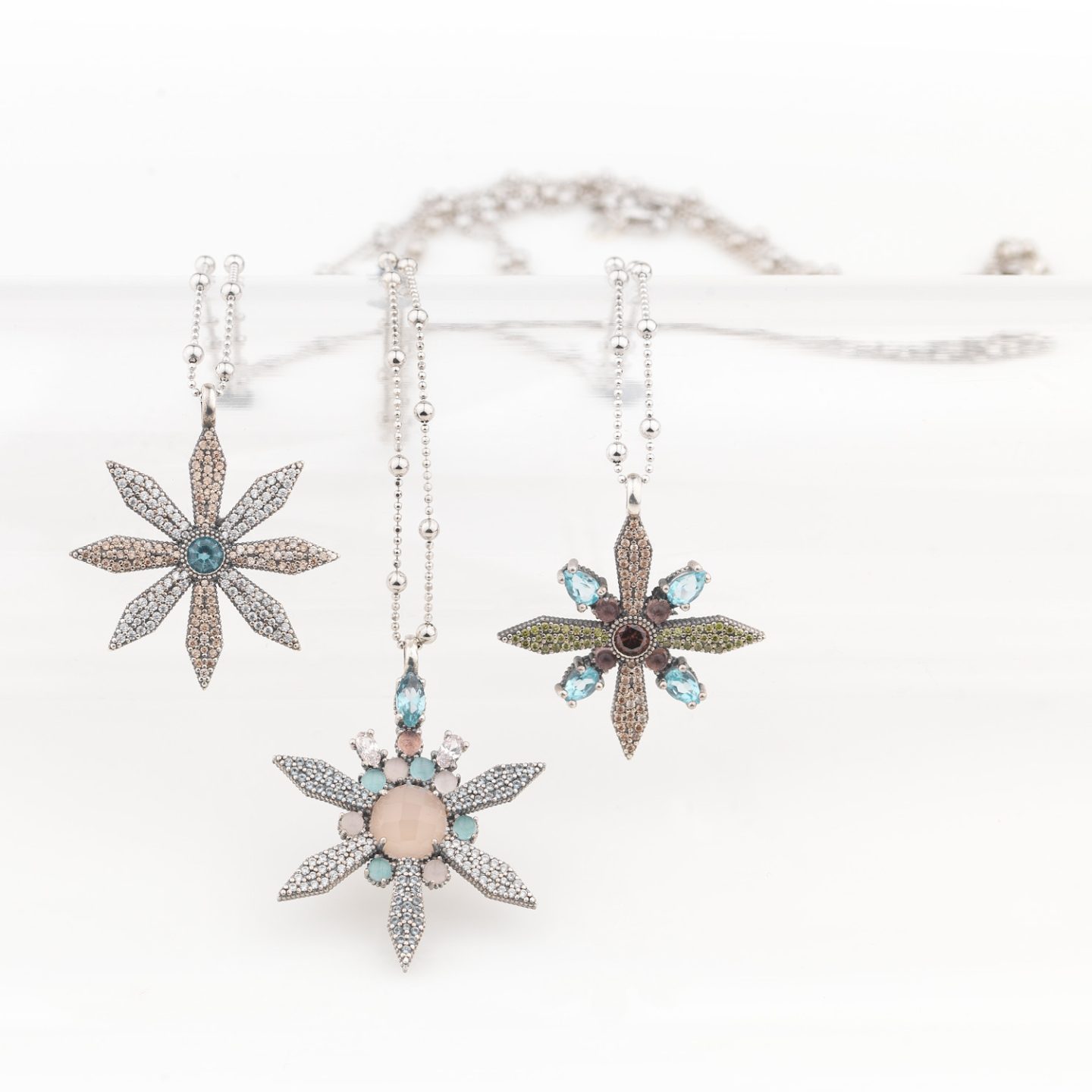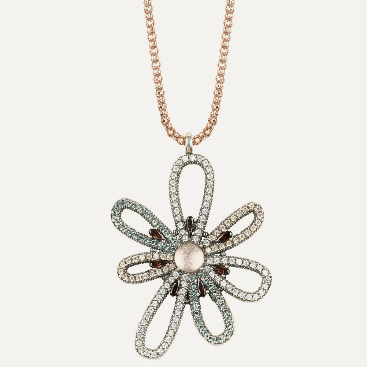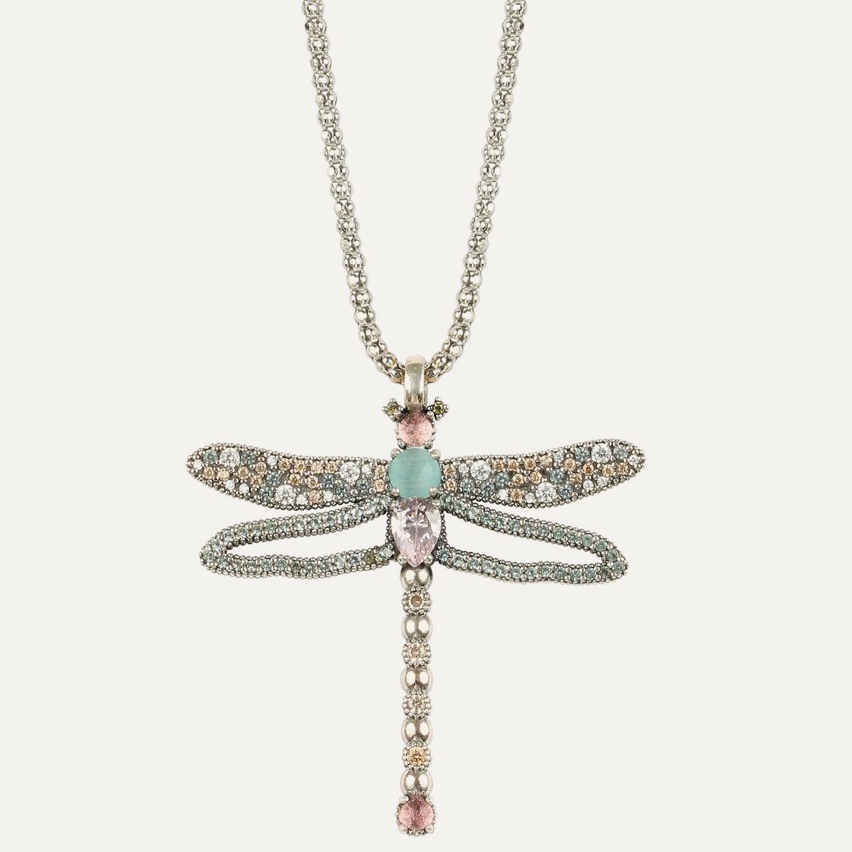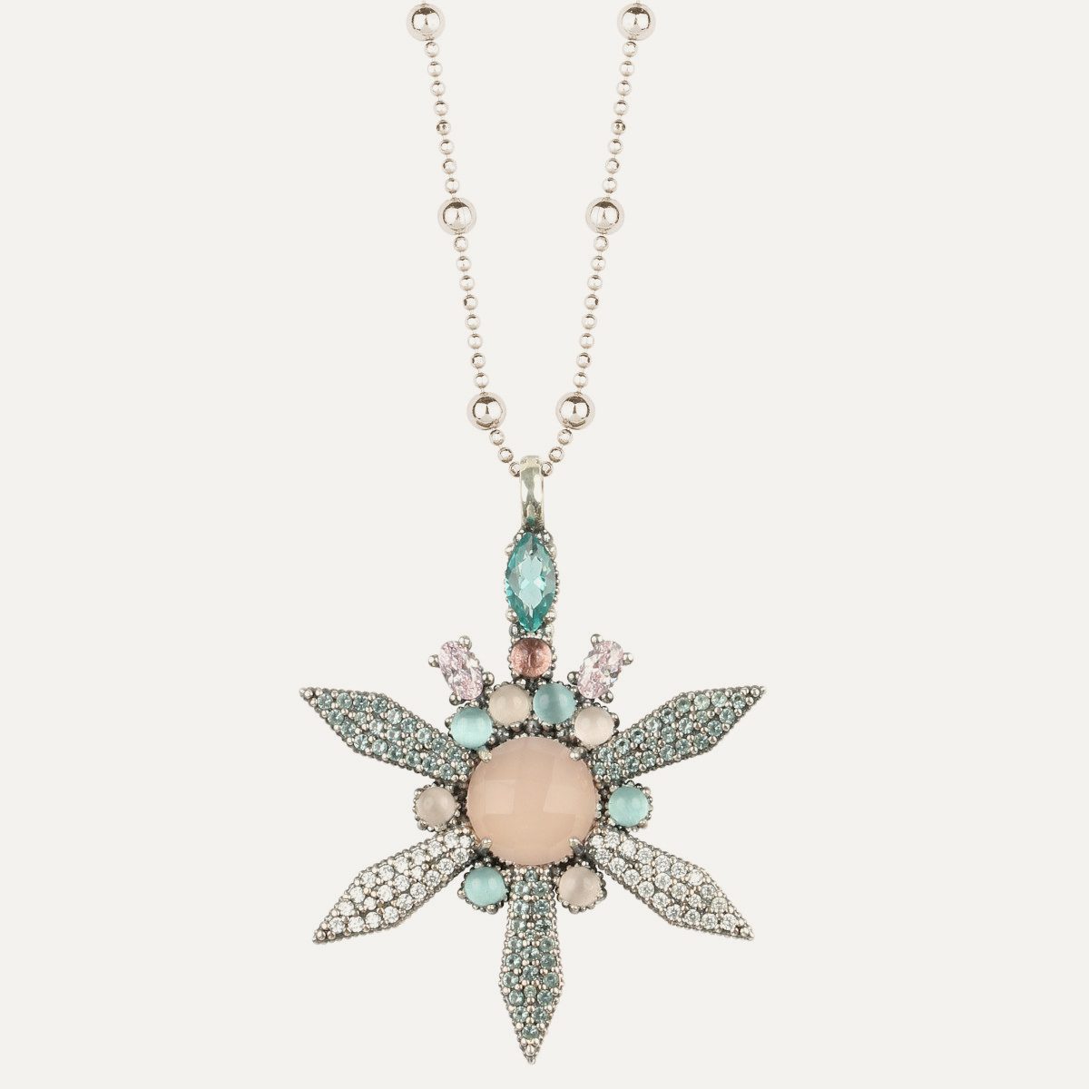 925 sterling silver pendant with rose quartz, blue chalcedony, pink tourmaline and zirconia.
