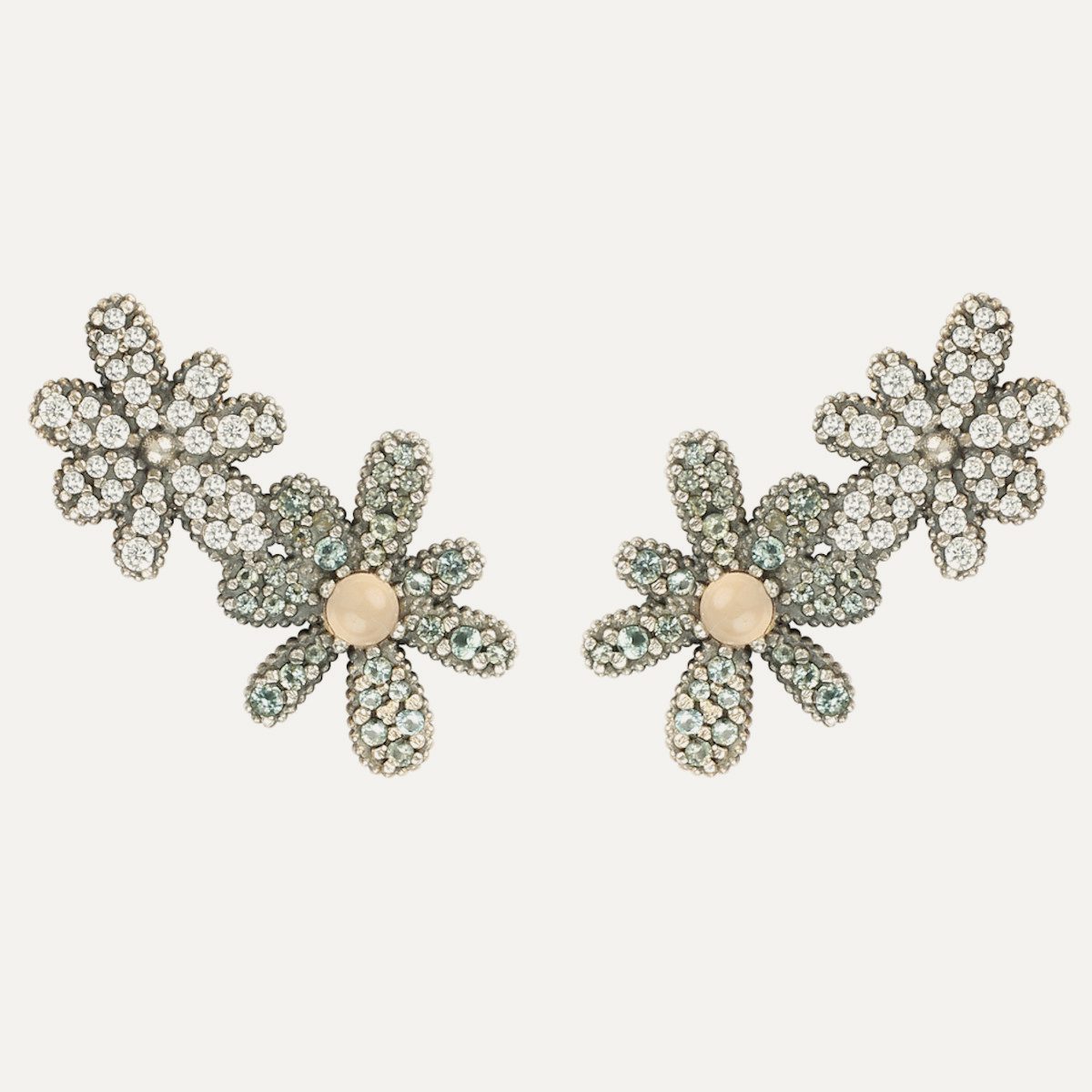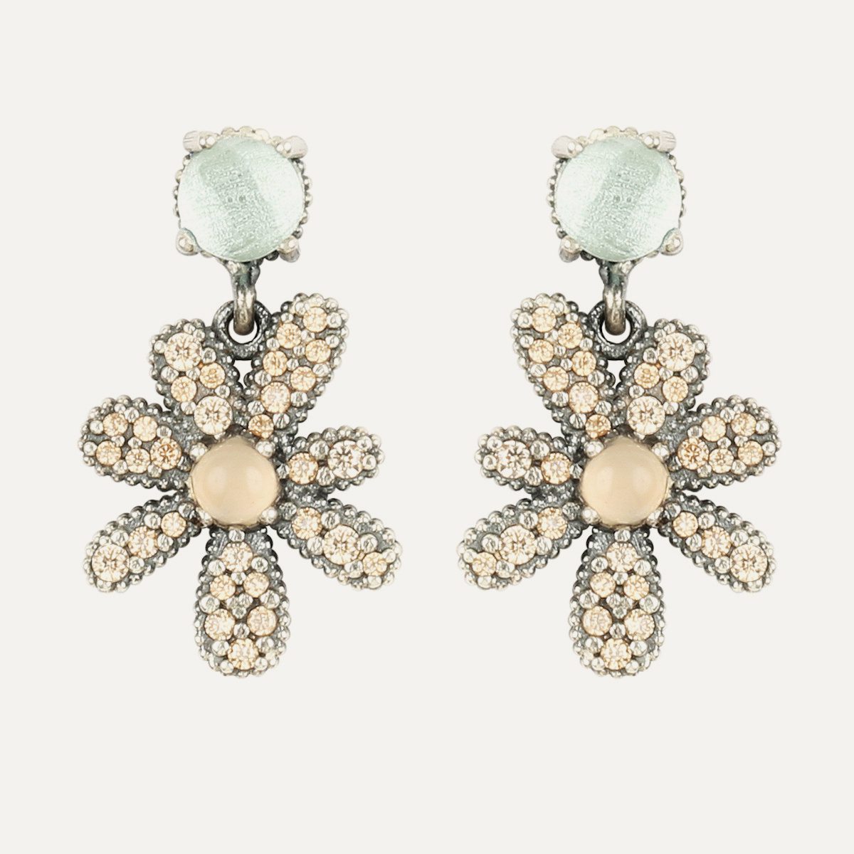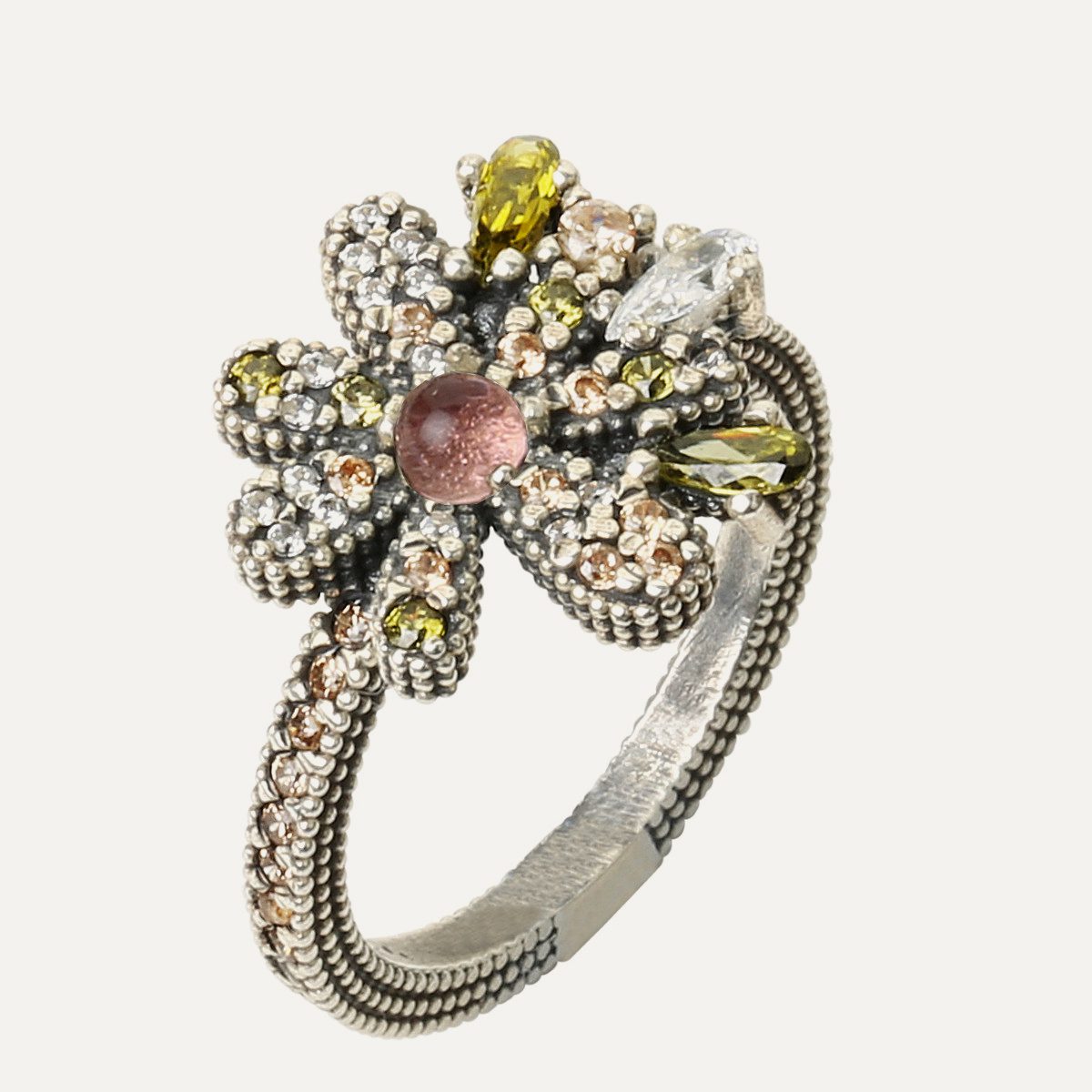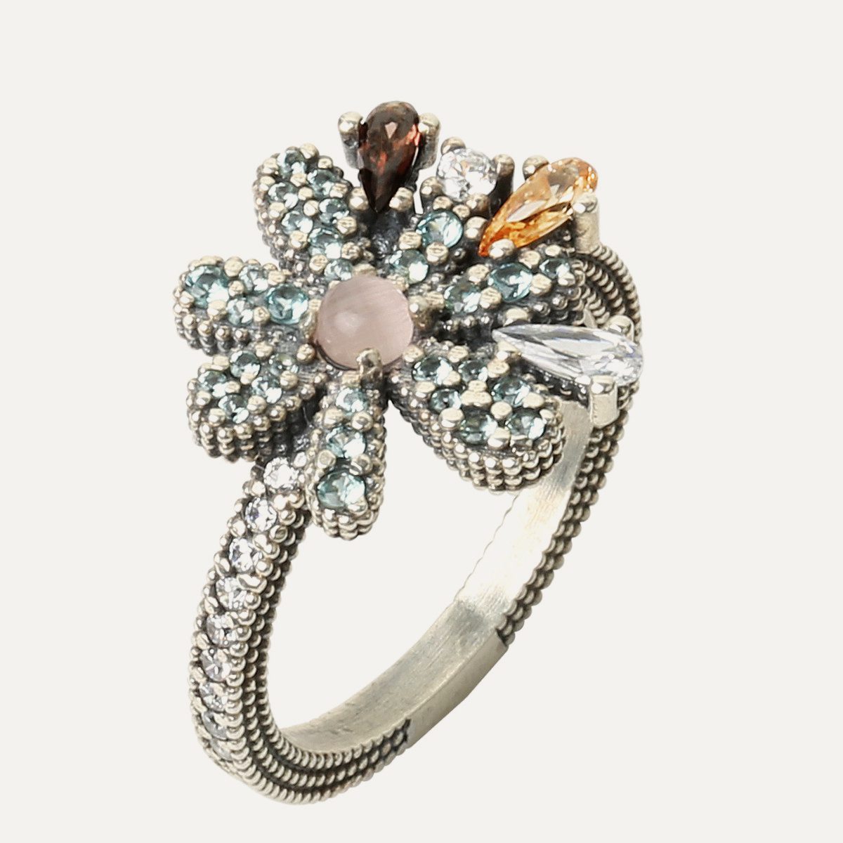 The petals of this unique daisy are made of silver with antique finish and hand-set with brilliant-cut zirconia in shades of cava, turquoise and white.