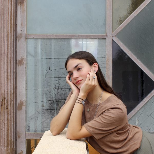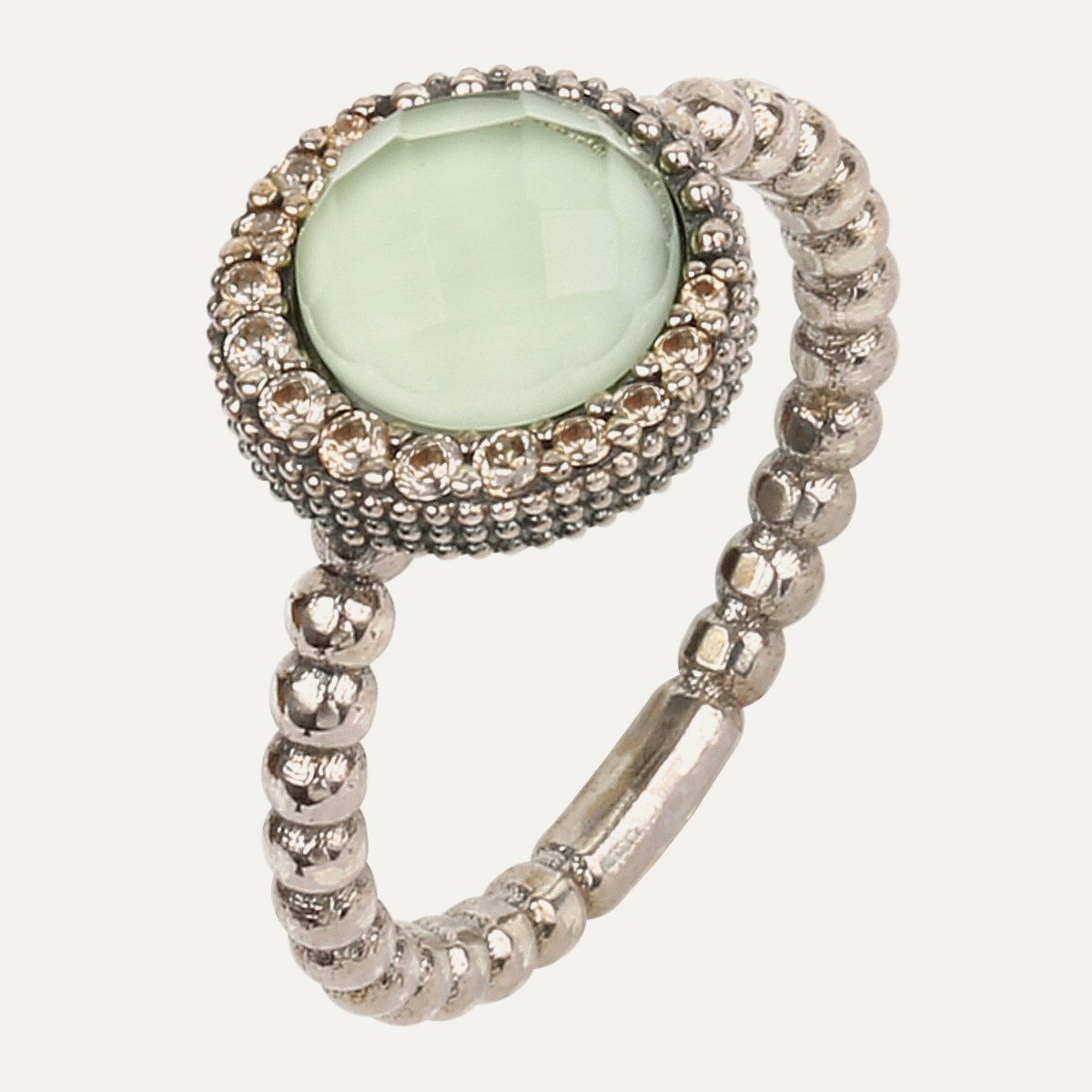 A simple yet original ring made of 925 sterling silver finished in antique silver. The undisputed protagonist is a 7x9mm faceted central cabochon in oval cut with a striking lime green color, accompanied by a 6×3 baguette cut zirconia in intense green peridot color. The arm is a fine wedding band with cava-colored zirconia set one by one in our workshop in Barcelona.