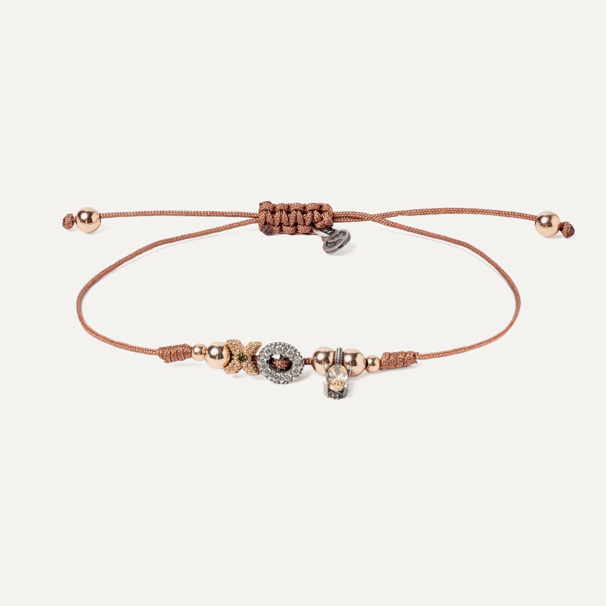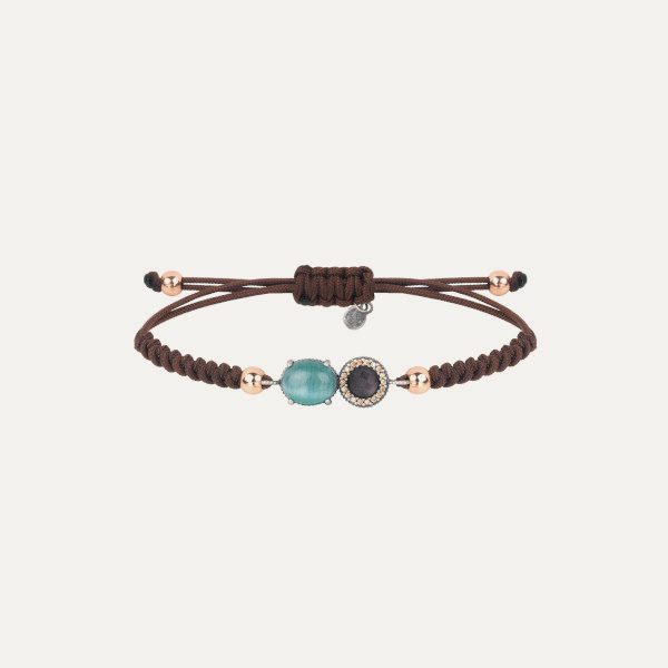The Duna bracelet from the Athenia collection in antique silver with 24kt rose gold plated details, is a delicate and elegant piece, designed for those looking for a versatile piece of jewelry that combines simplicity with a touch of sparkle. Made of adjustable beige macramé, this bracelet fits comfortably on any wrist, providing a natural and fresh style. Its design is highlighted by two interlinks decorated with zircons in peridot green tone, which add a touch of light and color, creating a subtle and sophisticated contrast with the beige cord.