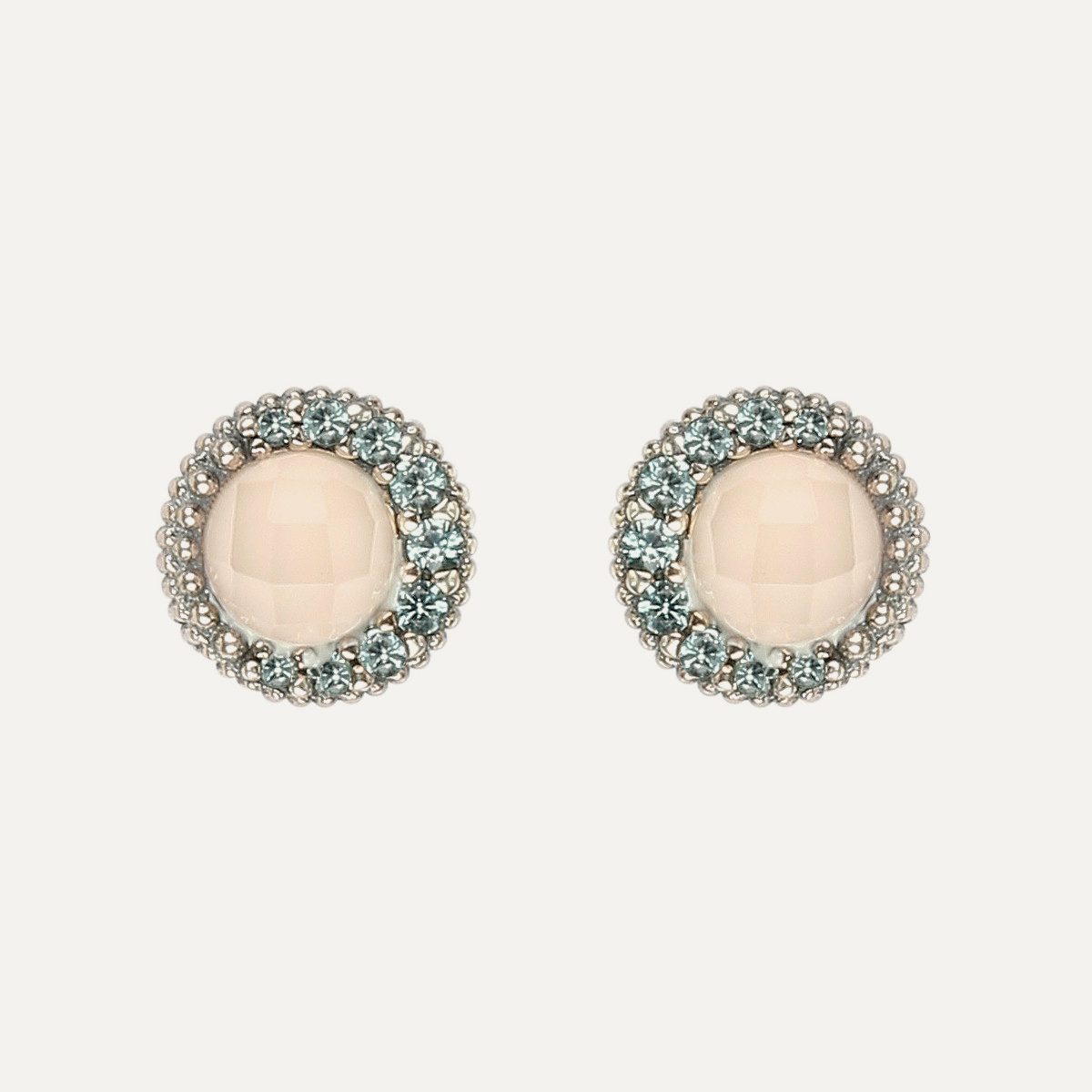 Bracelet in 925 sterling silver with agates, glass beads, zircons and nylon. In the center, two details in sterling silver with antiqued finish: an X with hand-set turquoise zirconia, and a mint green marquise with the silver graining so characteristic of Sunfield jewelry.