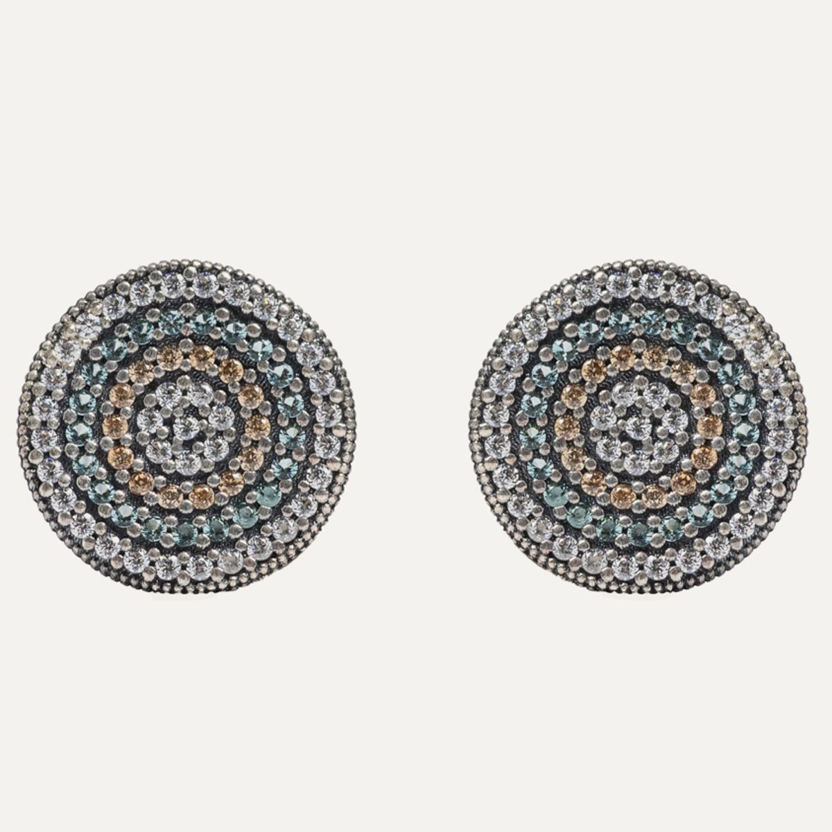 Bracelet in 925 sterling silver with agates, glass beads, zircons and nylon. In the center, a sterling silver detail with antiqued finish made with a pavé of hand-set brilliant-cut white zirconia, with the characteristic grafilado finish of Sunfield jewelry.
