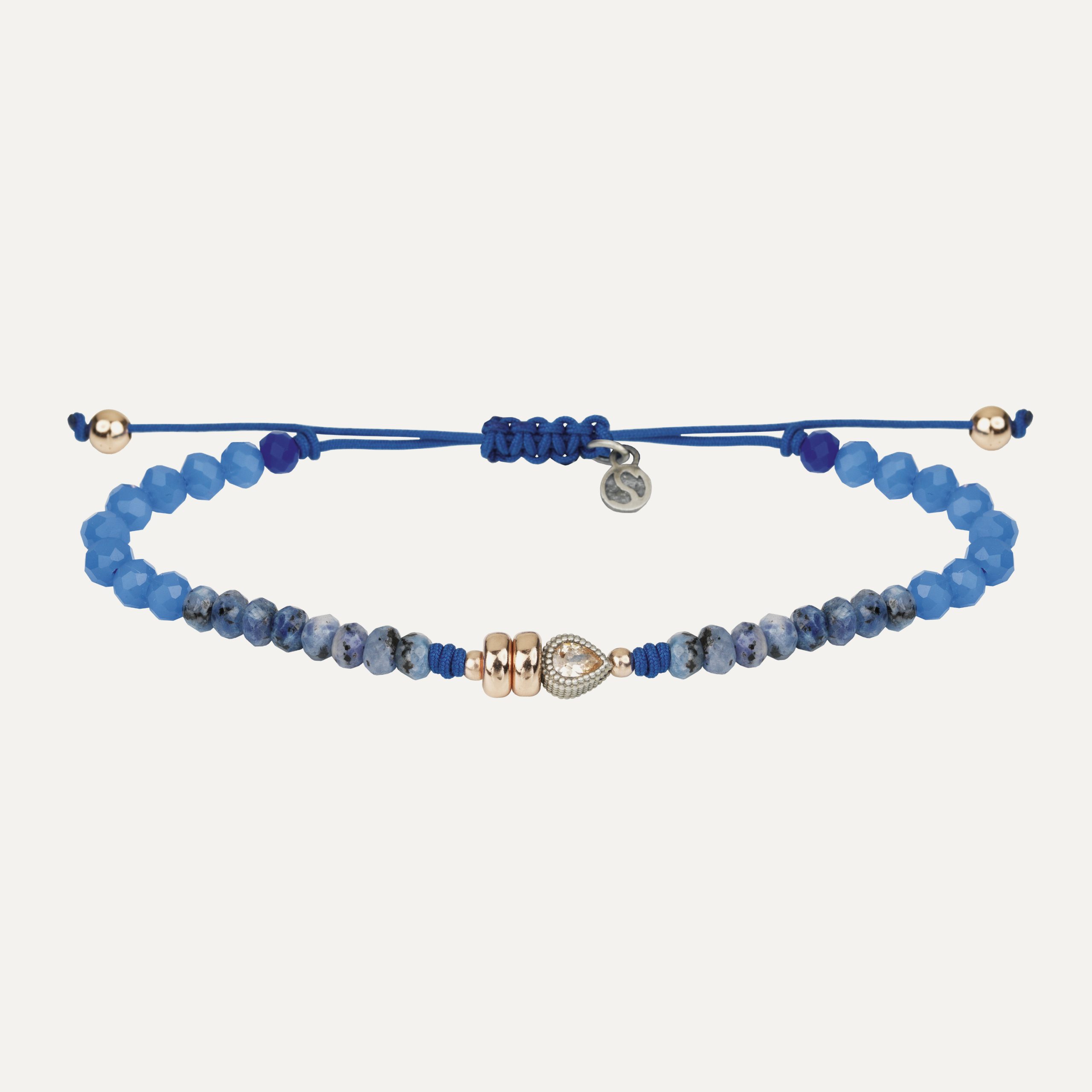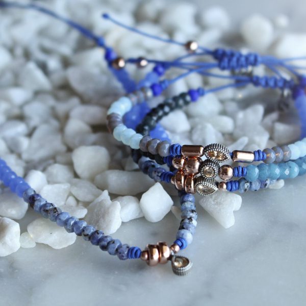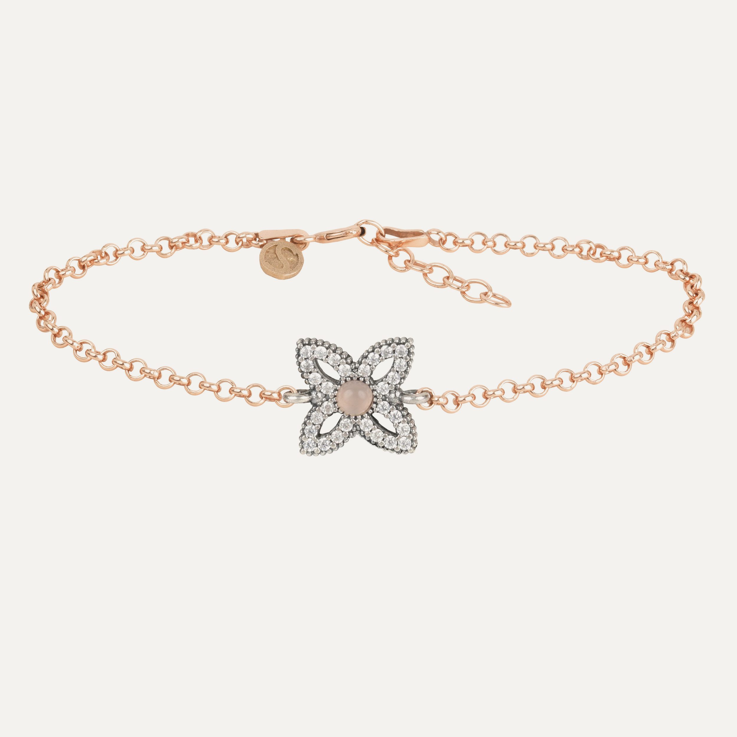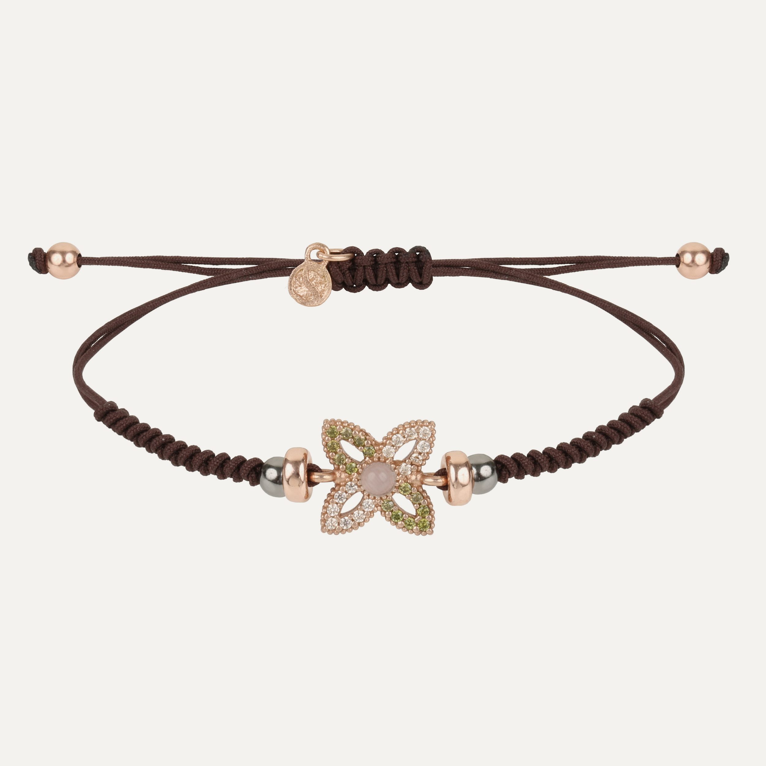 The beads that complement the set are made of sterling silver with 24kt rose gold plating, and it closes with an adjustable macramé for greater comfort.