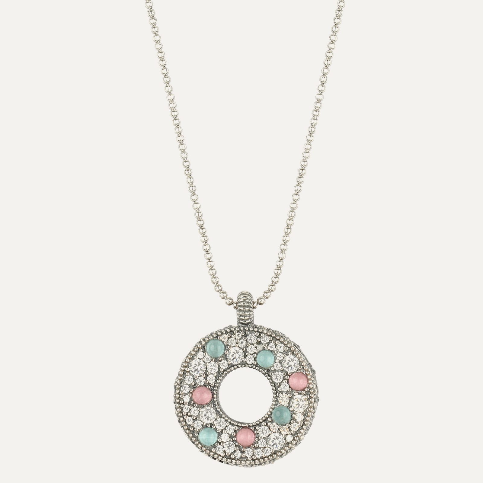 Bracelet in 925 sterling silver with agates, glass beads, zircons and nylon. In the center, a sterling silver detail with hand-set mint-colored zirconia.