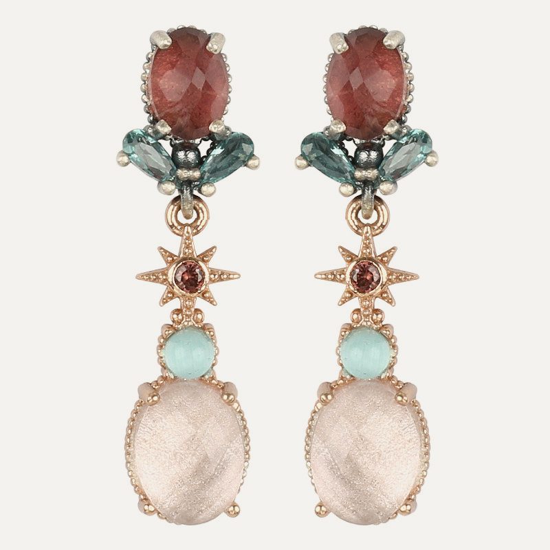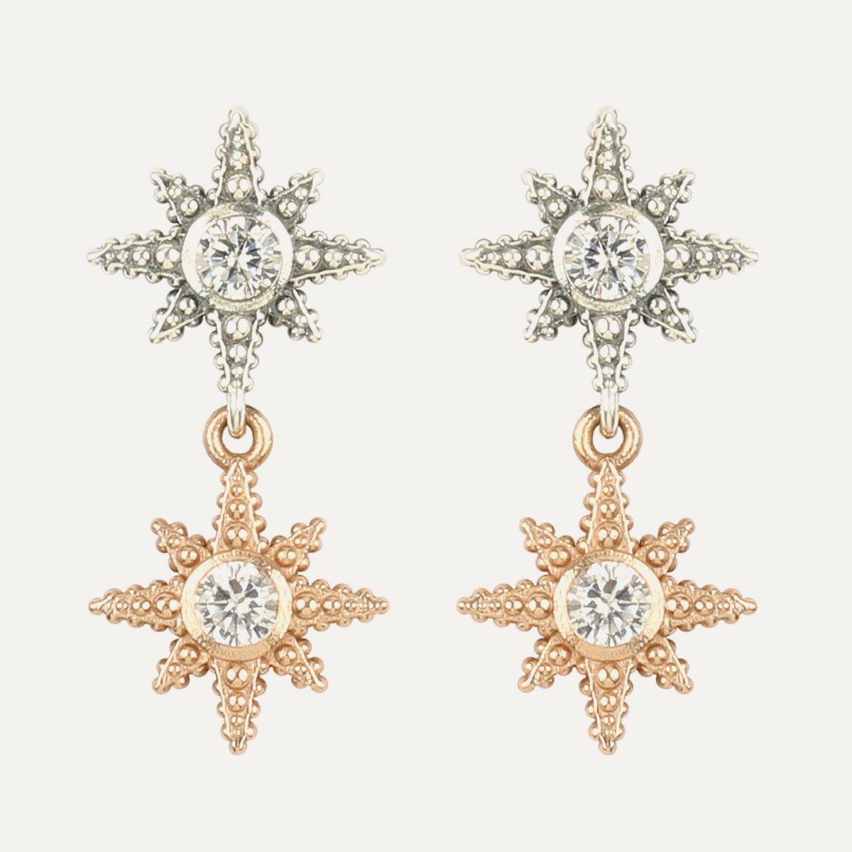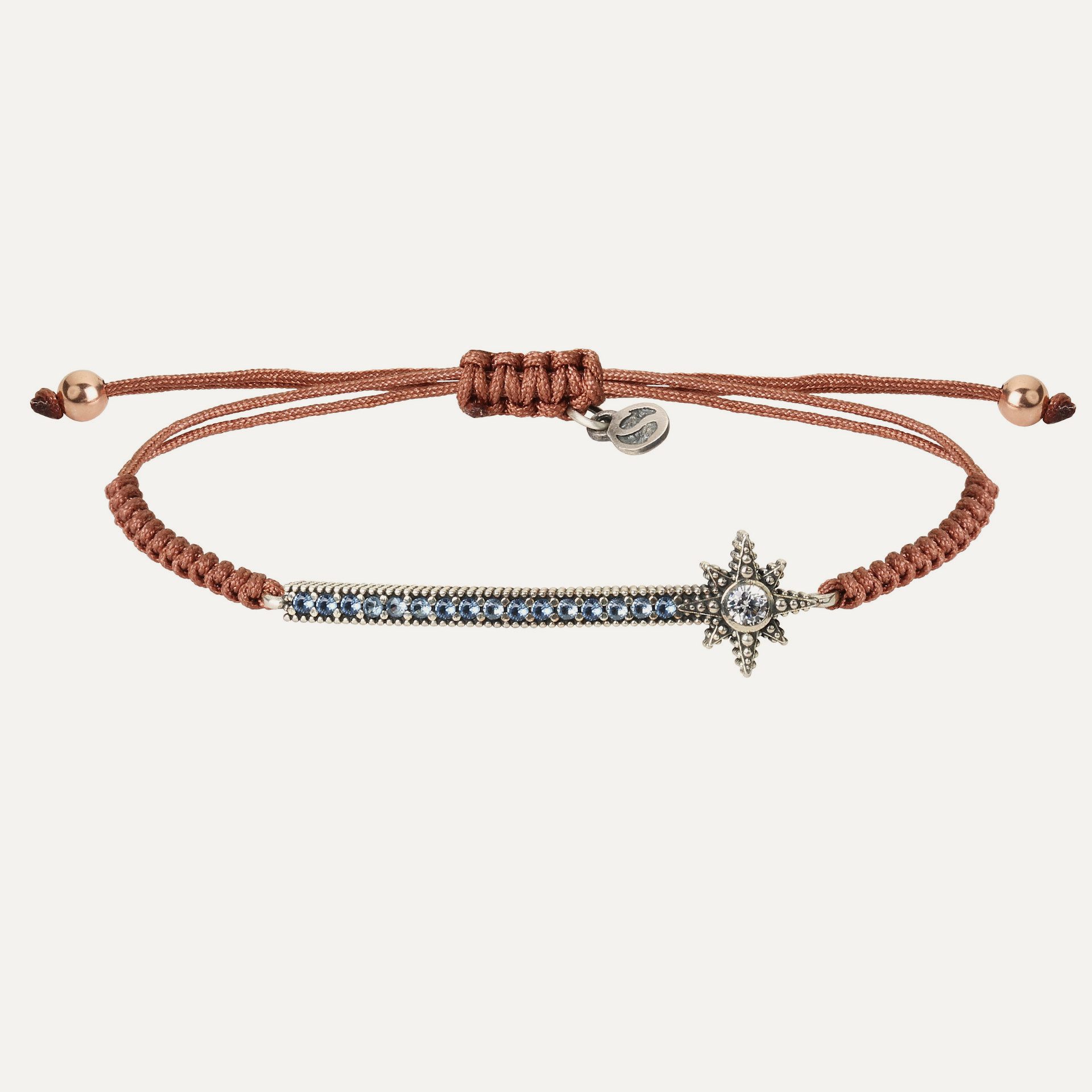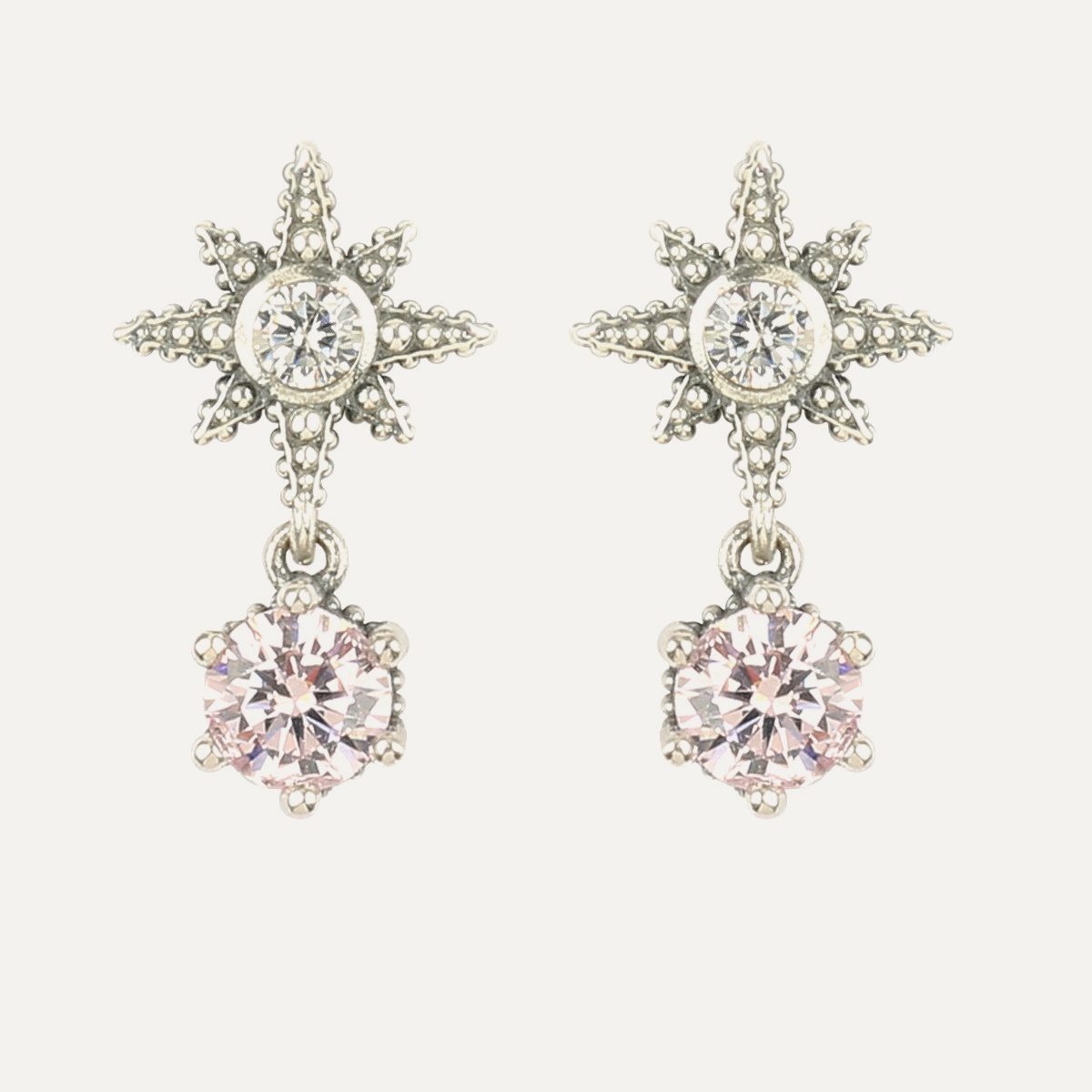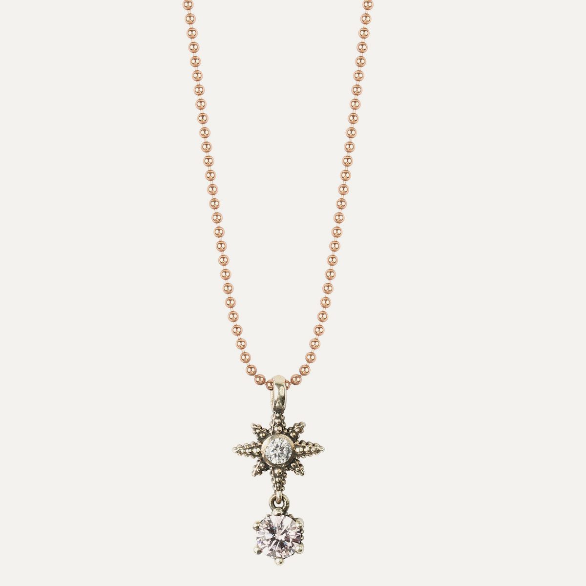 The Cloris Star pendant is a piece made in sterling silver with antique finish, with brilliant-cut zirconia set by hand. A double circle-shaped pendant with aquamarine zirconia and an accompanying star with a brilliant-cut white zirconia in its center. It comes with a sterling silver bead chain plated in 24kt rose gold and 42cm long.