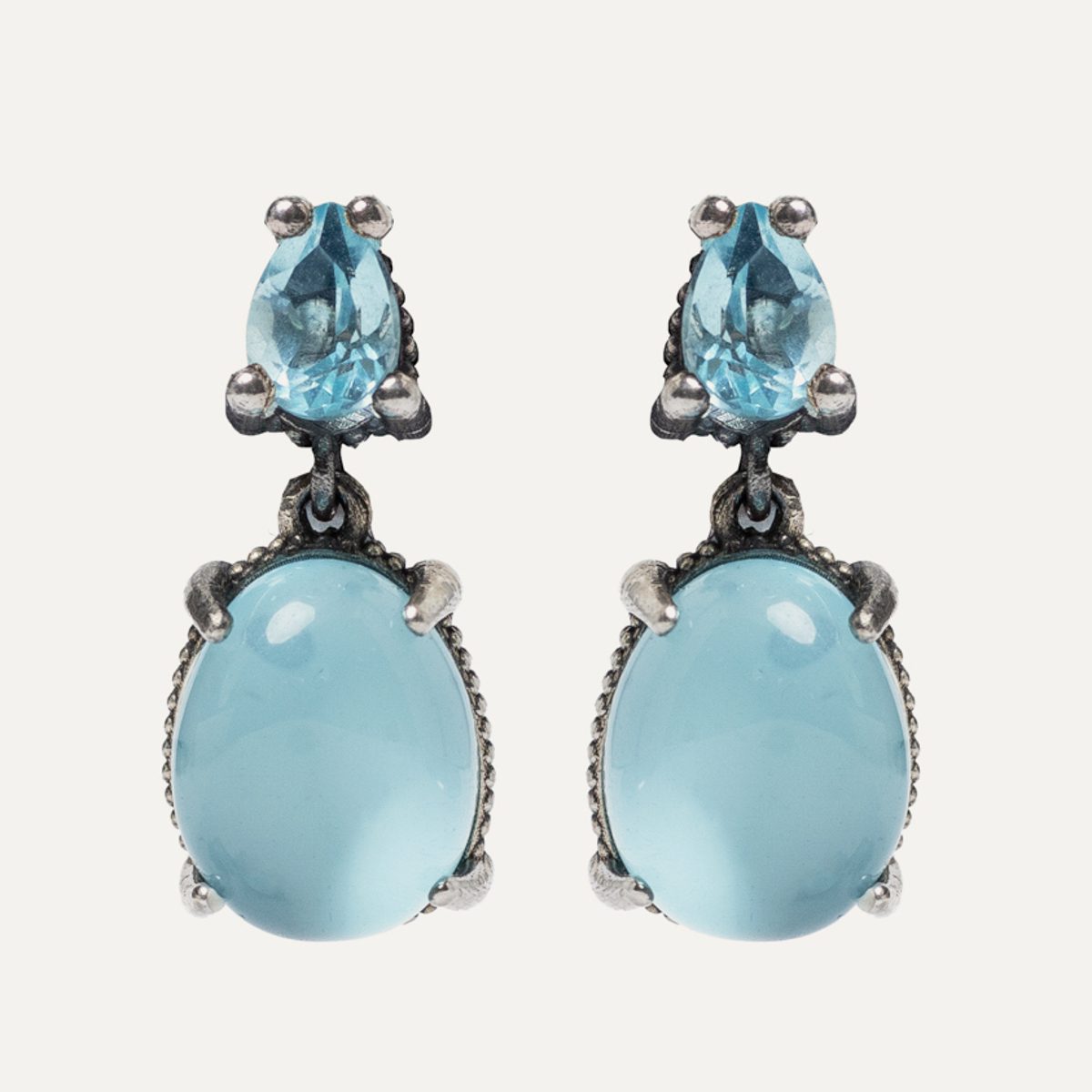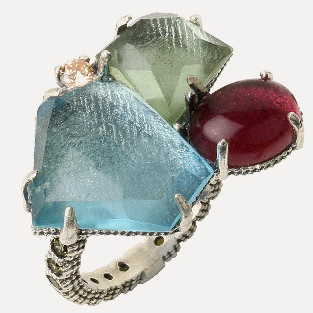 It is made of sterling silver with antique finish and hand set by our master jewelers. A handmade jewel with a unique design, highlights the large aquamarine faceted quartz cabochon in the shape of a trapezoid, and the apple quartz cabochon that are new this season and that is surrounded by brilliant cut zirconia in cava color.