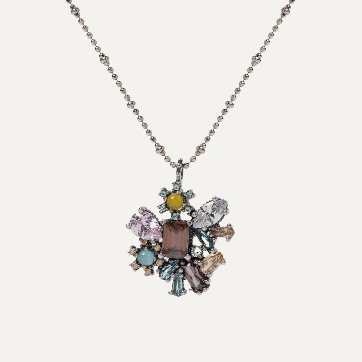 The set is completed by a round faceted rose quartz cabochon that provides balance, two marquise-cut zirconia in wine and white, and a third brilliant-cut white zirconia.
