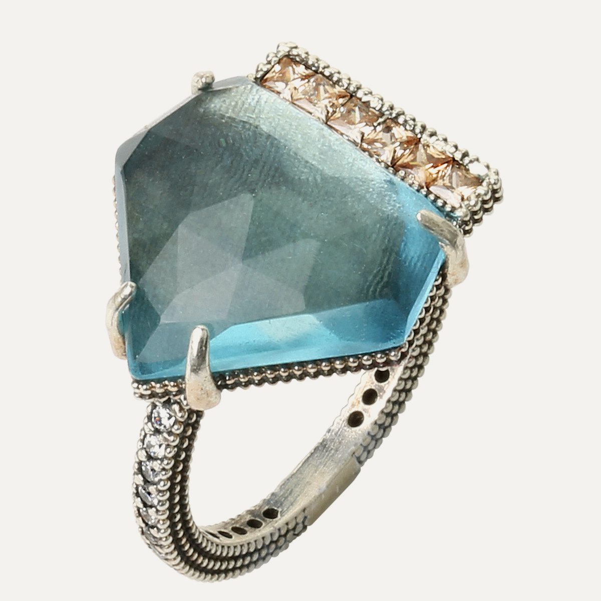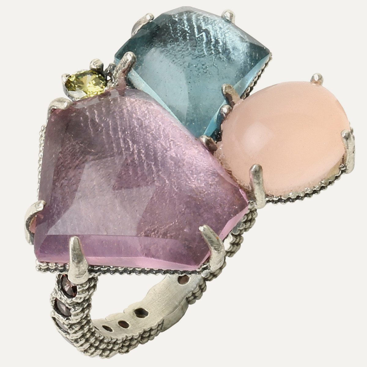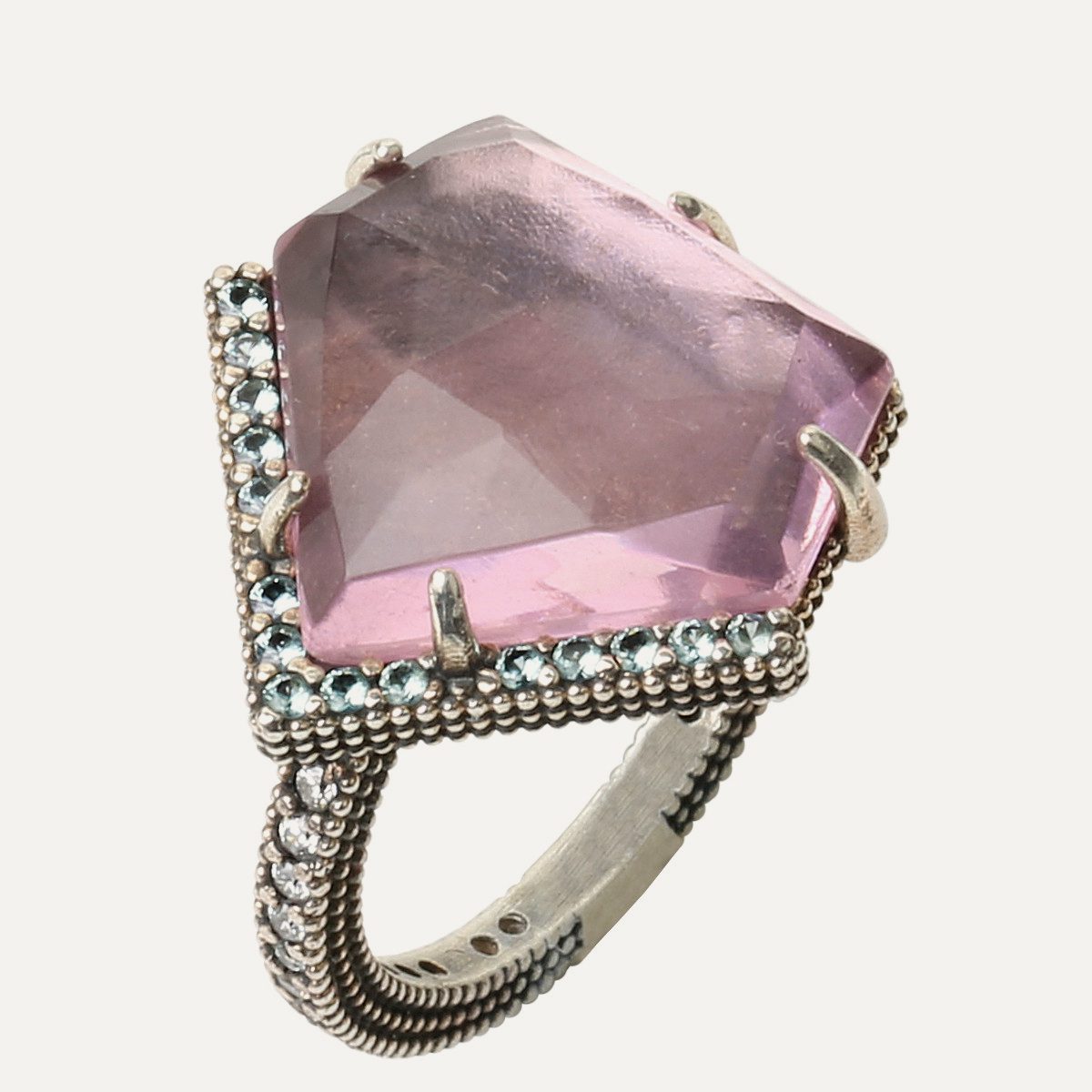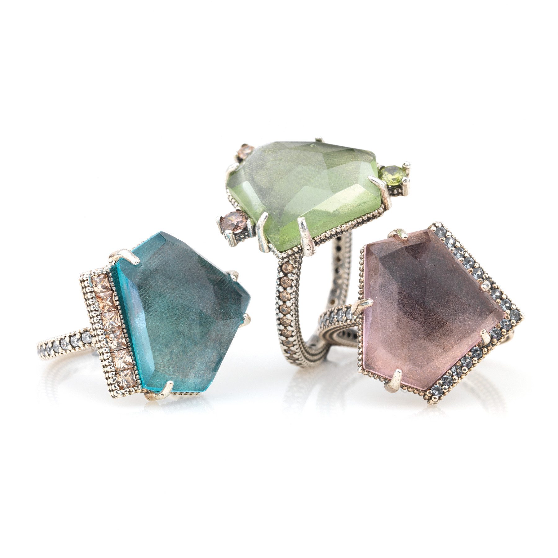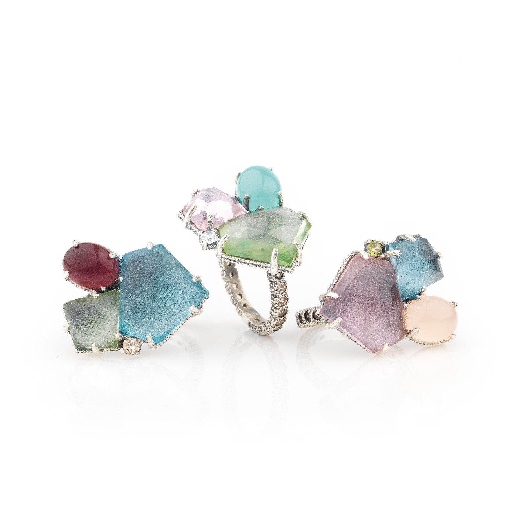 In this case highlights a large faceted trapezoid shaped cabochon in aquamarine quartz that is new in the latest collection of Sunfield, along with a smooth cabochon in rose quartz and oval cut, a round faceted cabochon in apple quartz, and a last irregular cabochon cut in pink fantasy quartz. The set is completed by two marquise-cut zircons in cava and turquoise.