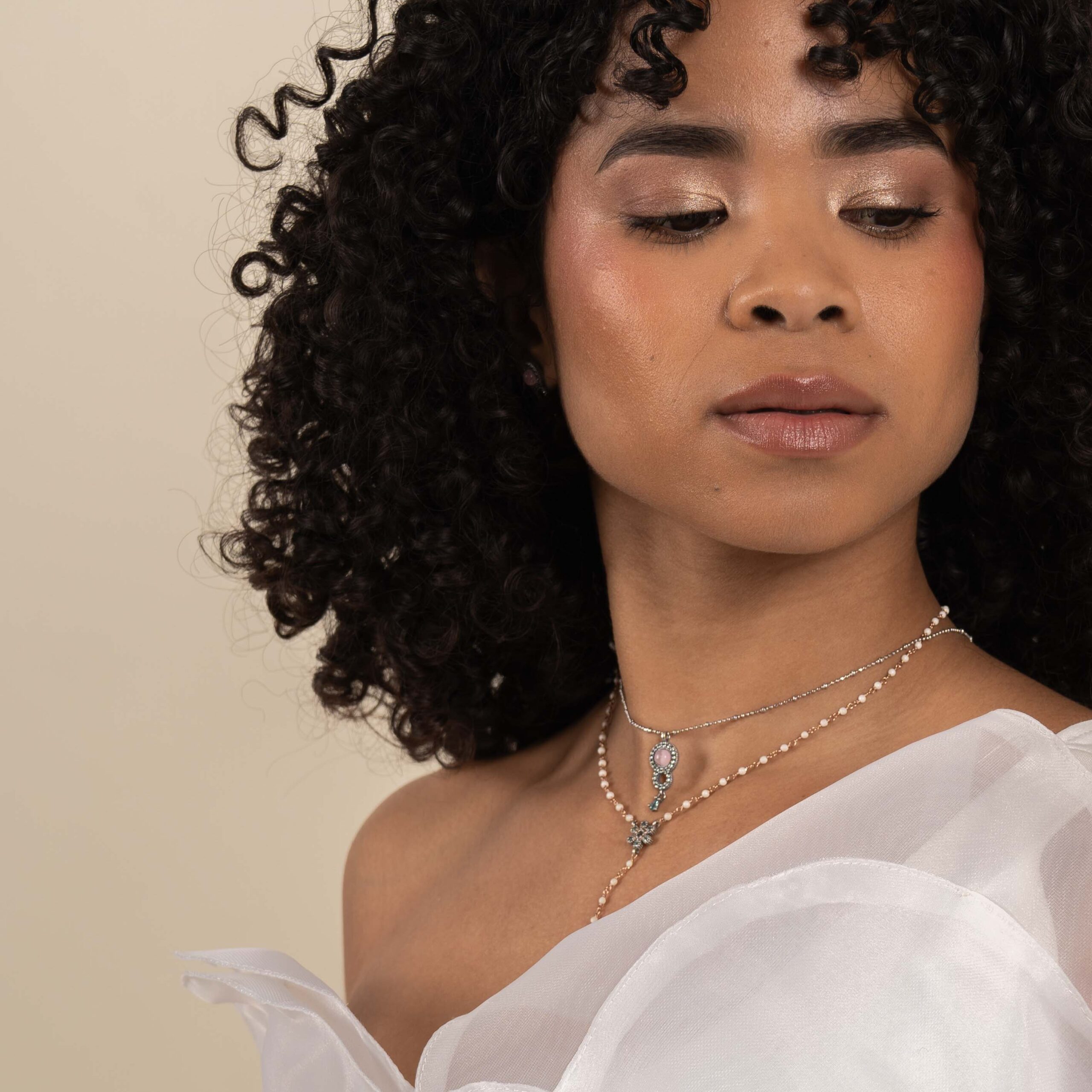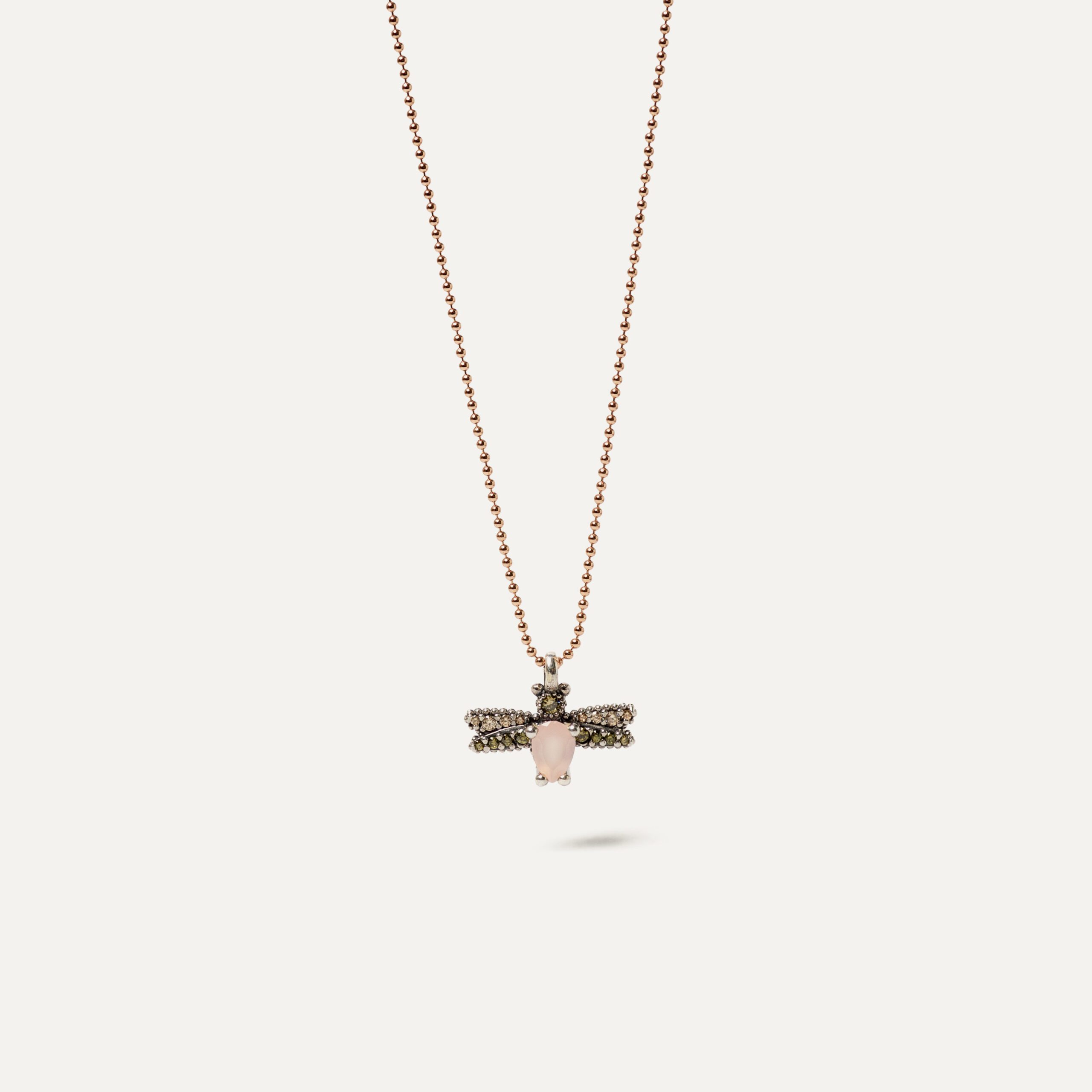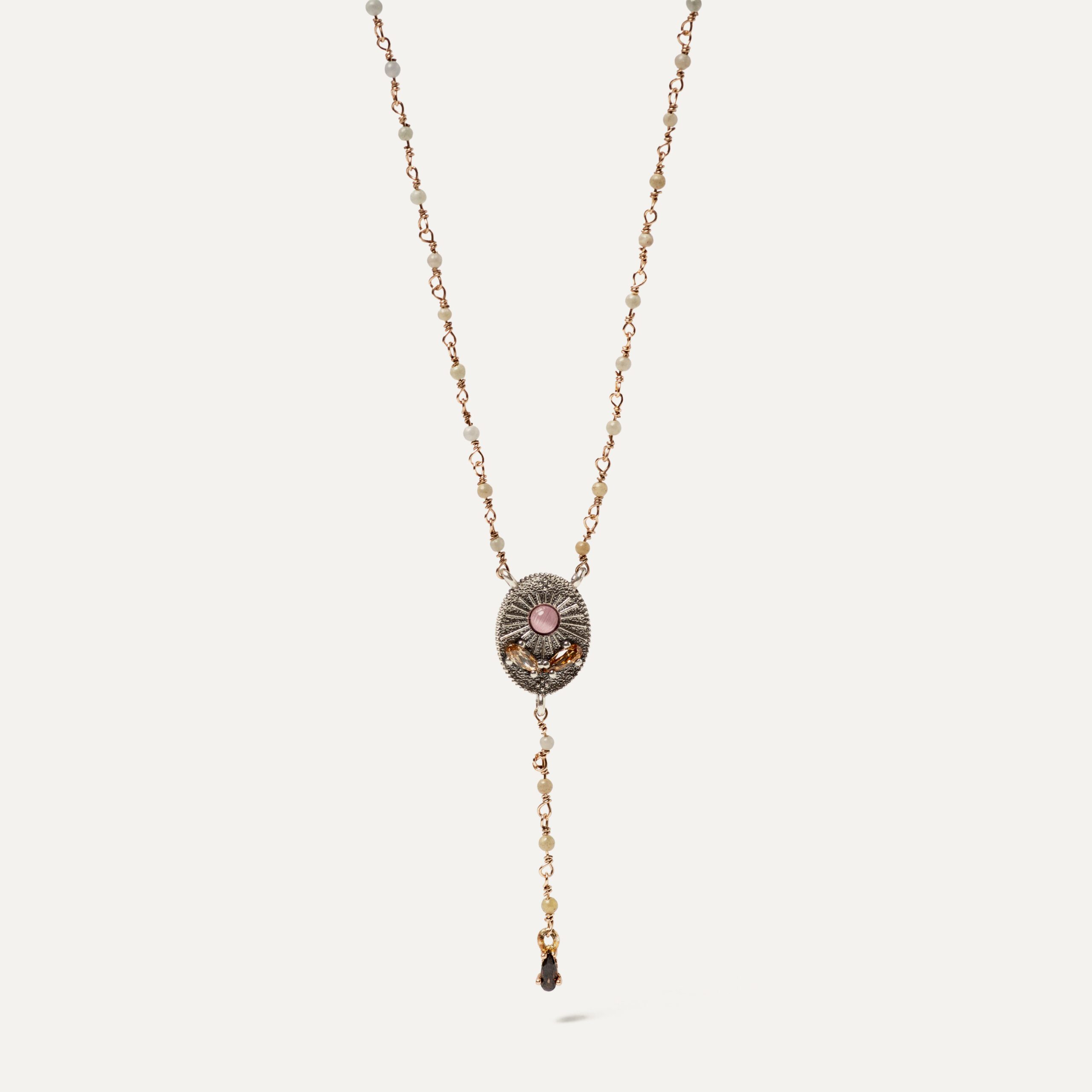 It is made of 925 sterling silver and decorated with brilliant-cut cava-colored zirconia, arranged in a circular ornamental style structure with antique finish. It comes with a double chain of 40 cm long: one with fine links in rose gold tone and another rosary type with lilac beads, which brings a romantic and sophisticated air. A harmonious design full of details designed to accompany you in the most special moments.