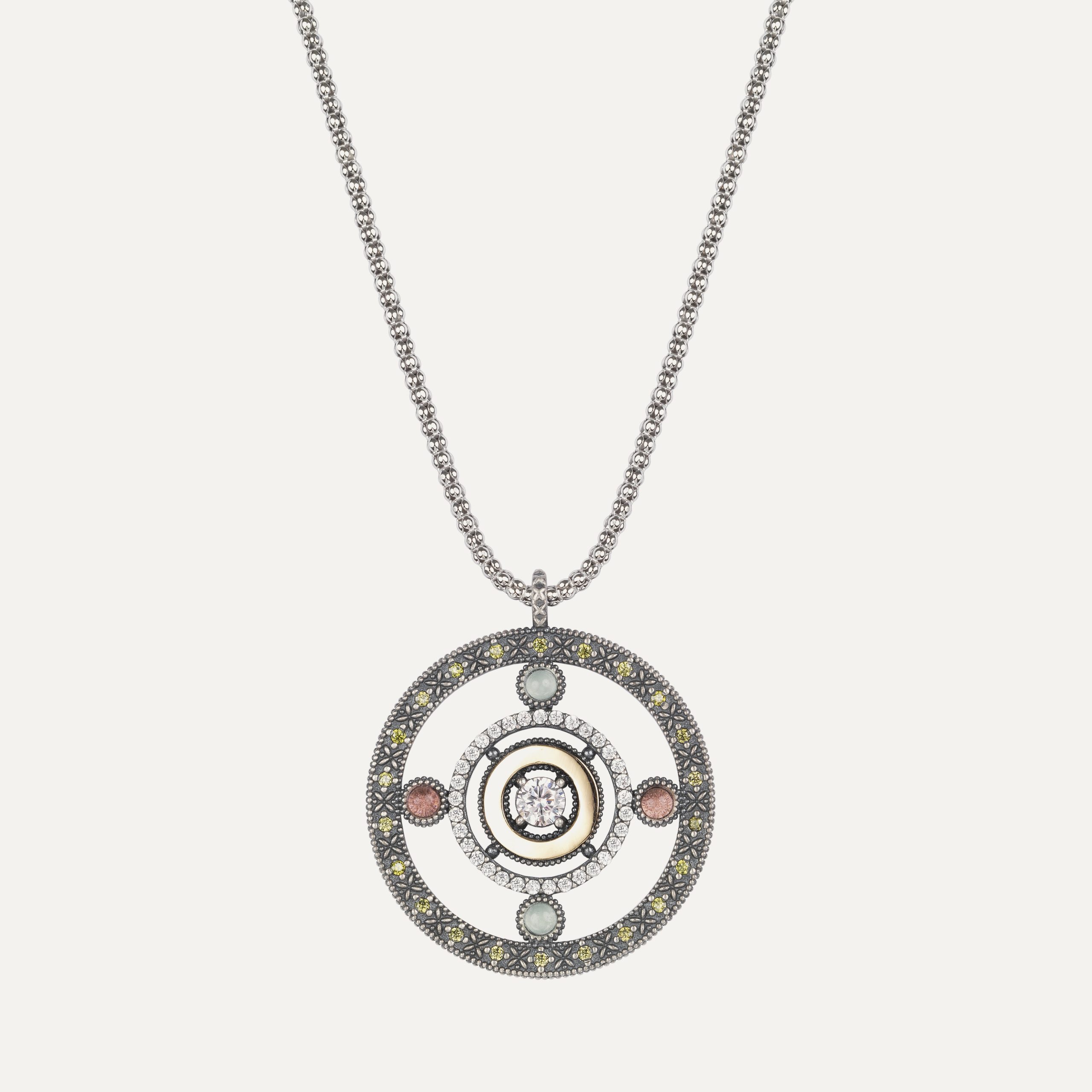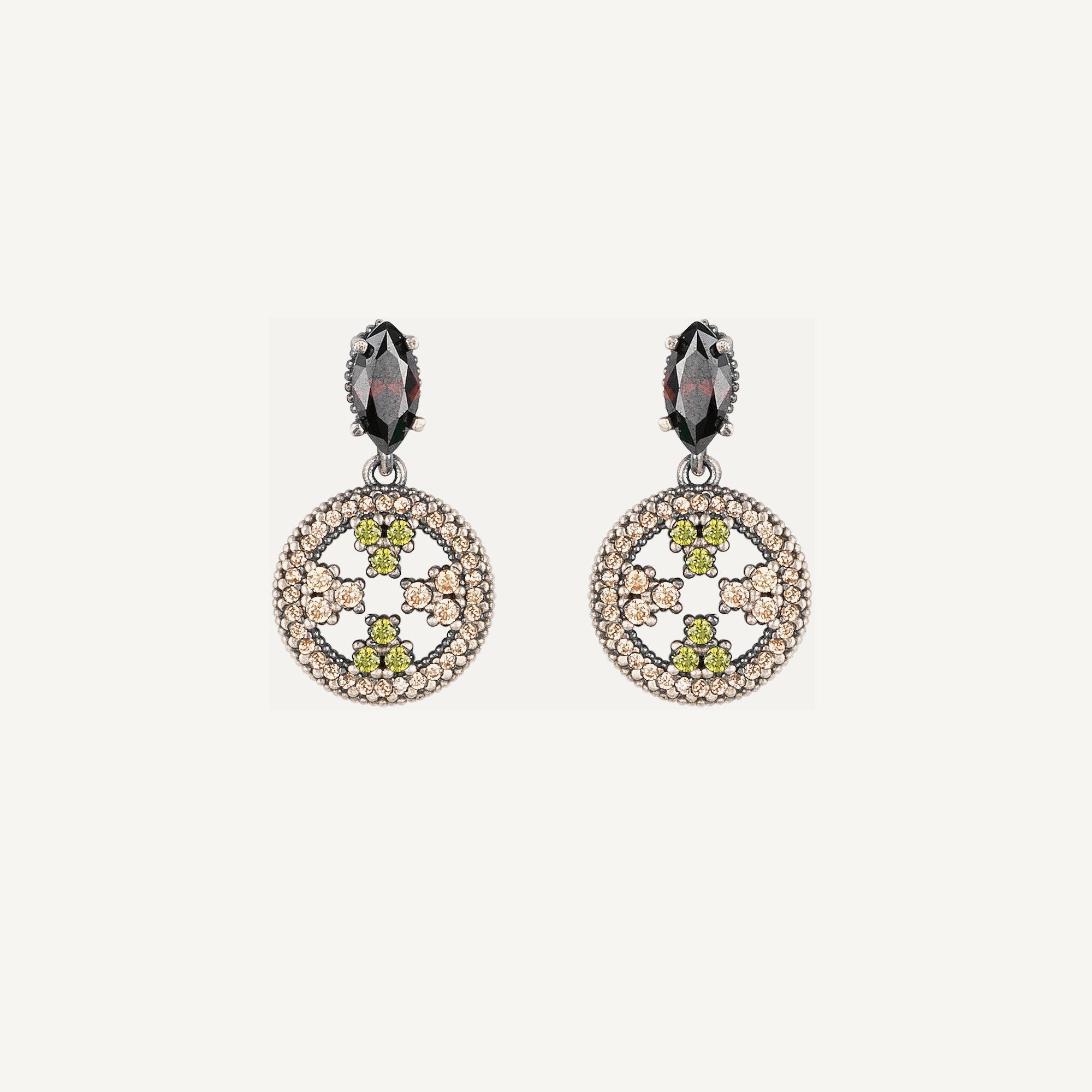 The Eclair earrings from Sunfield are in a middle point between the long earring and the button earring, ideal for the most conservative who want to risk a little bit without losing control. In this case it is an elegant design made of 925 sterling silver with antique finish of about 22 mm long and consists of a fixed circular part with a smooth pink tourmaline cabochon surrounded by brilliant-cut champagne zirconia and a mobile part in the shape of a cross in which shine brilliant-cut champagne zirconia.