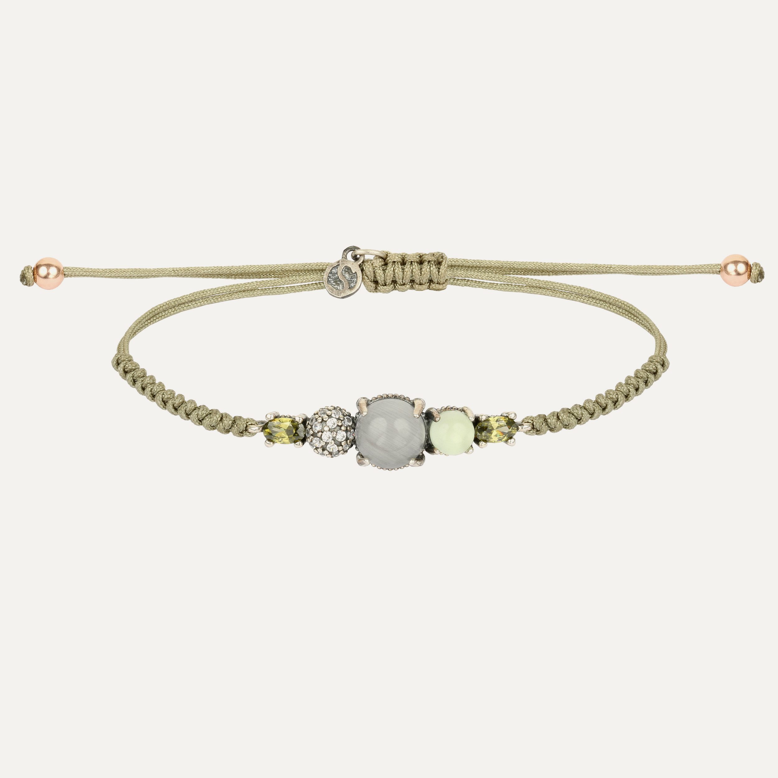 Original ring in antique silver with hand-set zirconia around the arm in mint color. It highlights in the center a faceted gray quartz cabochon in oval size of 7x9mm, accompanied by a 3x5mm oval zirconia in pink light color that brings a touch of sweetness to an elegant and original combination.