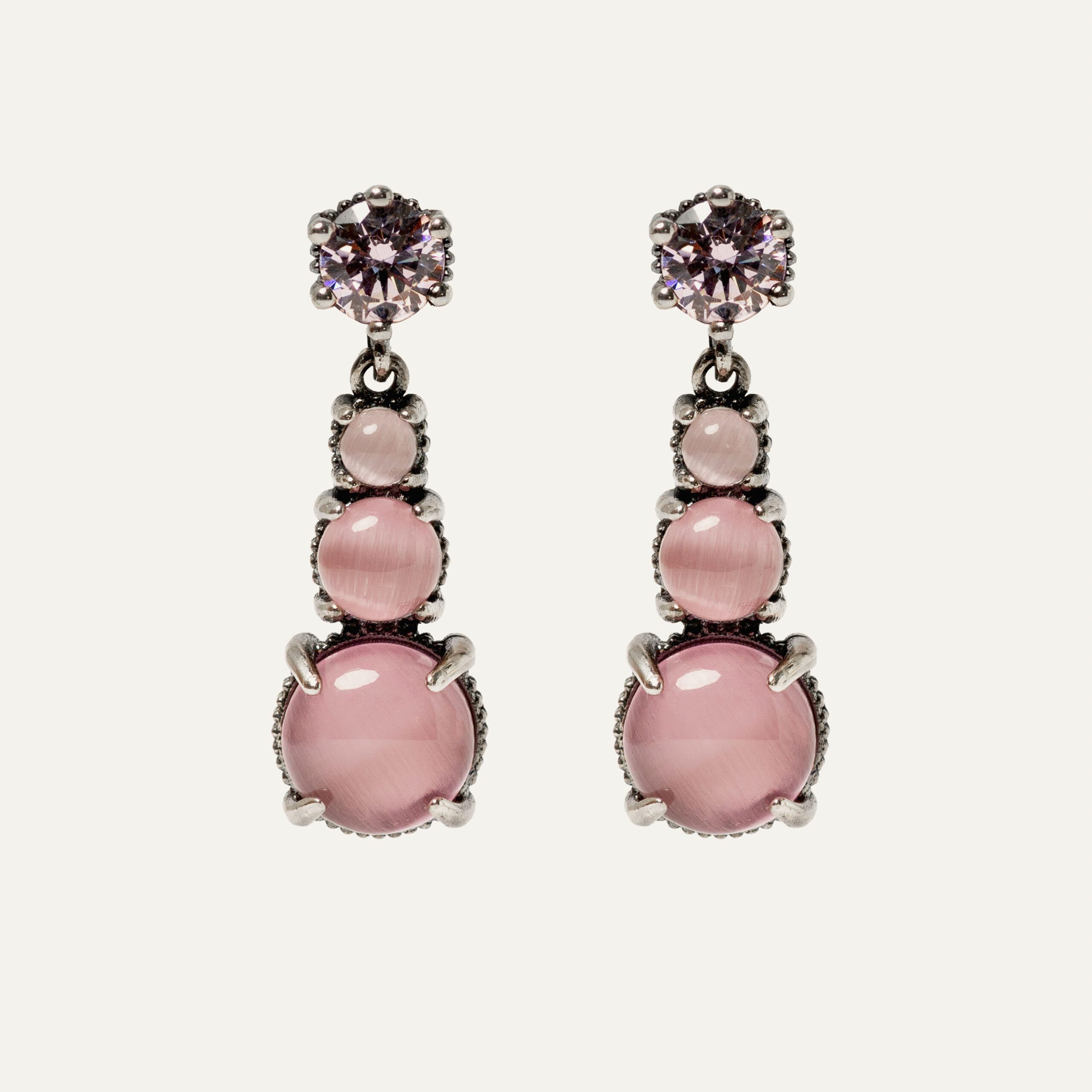 In the fixed part we find a rounded pearl of approximately 0.8 cm in diameter, accompanied by three drop-shaped zirconia hand-set in 925 sterling silver with antique finish: on the sides in cava color, and the central one in green peridot color.