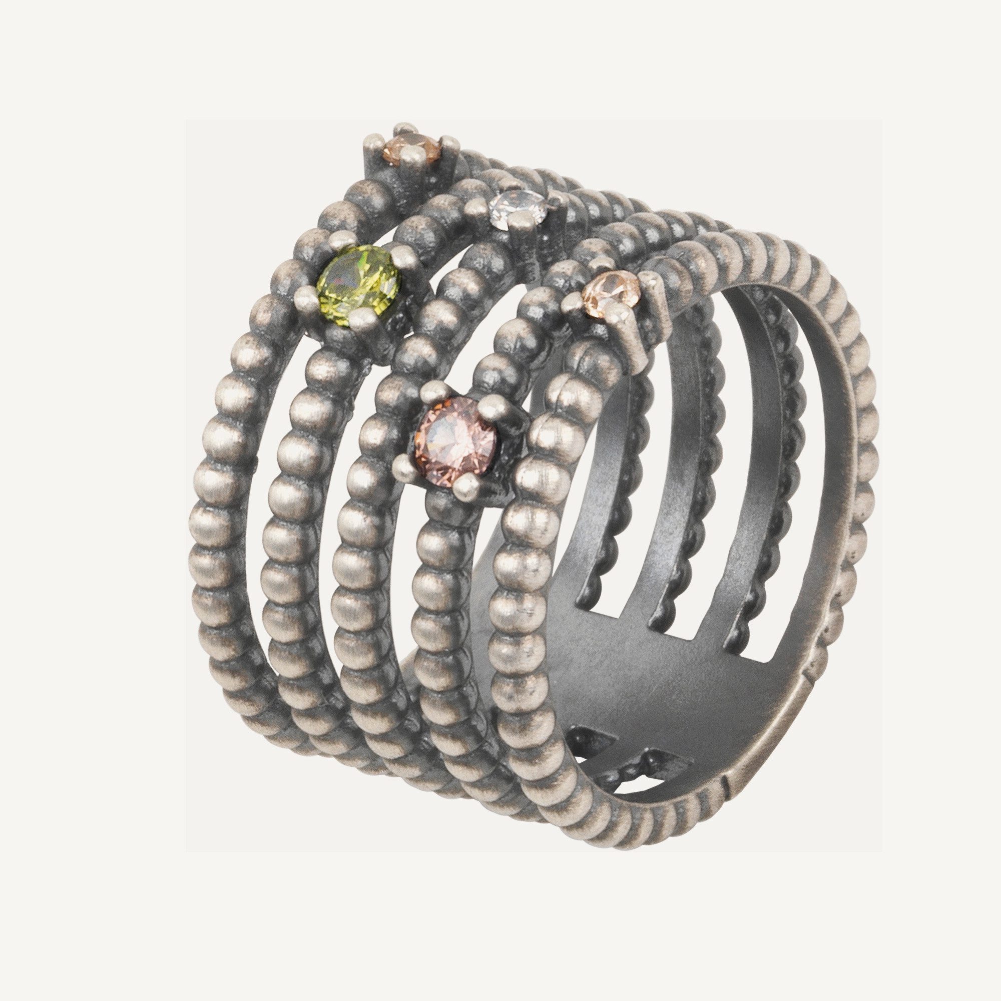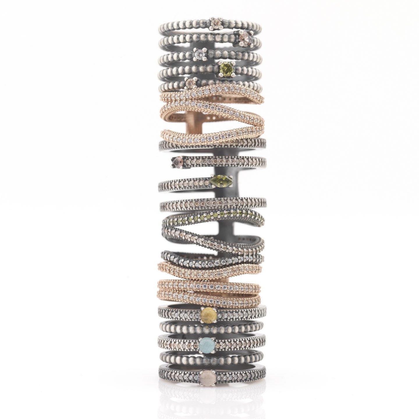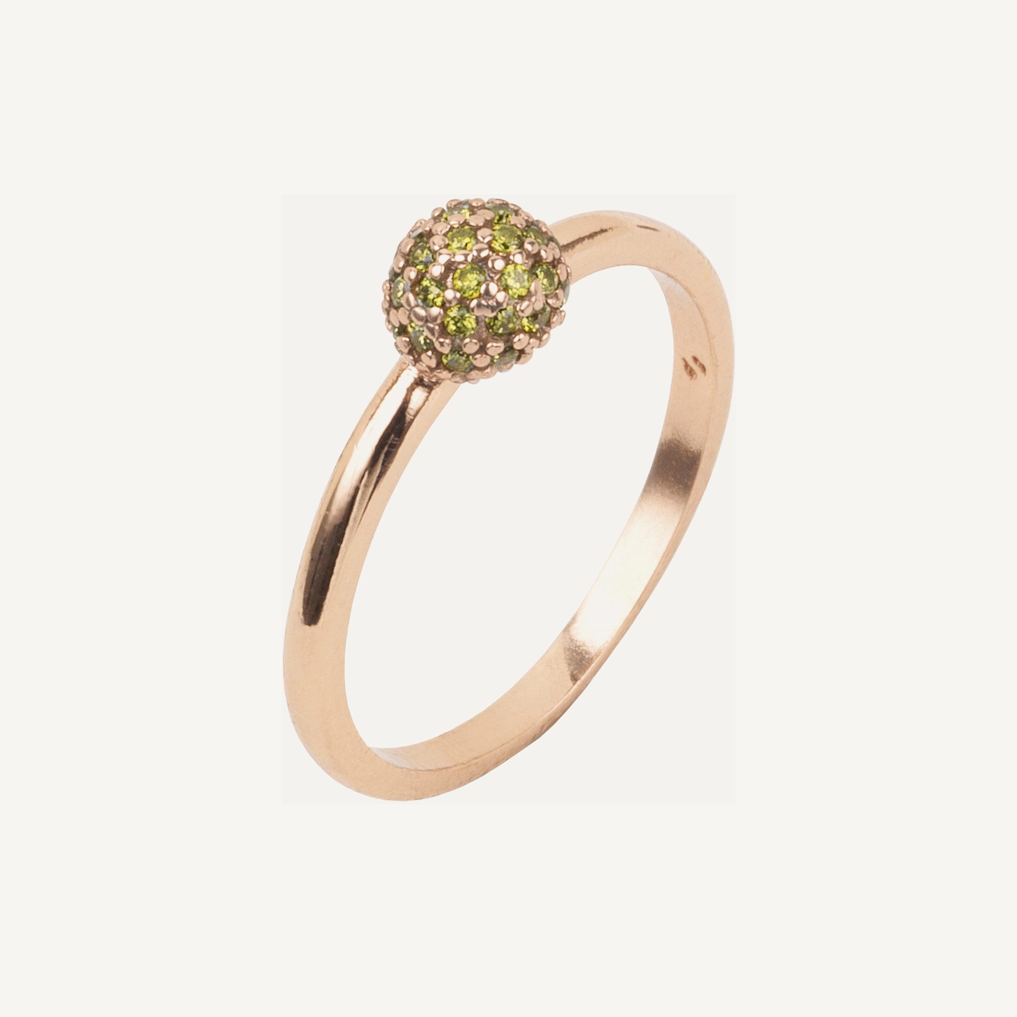 Bracelet made of 925 sterling silver with 24 kt rose gold plating. The central motif is made of sterling silver with antique finish with two links in silver with ruthenium finish, has a length of 1.3 cm and a diameter of approximately 0.5 cm. The zircons that compose it combine peridot green and chocolate brown, and are hand set in our artisan jewelry workshop in Barcelona.