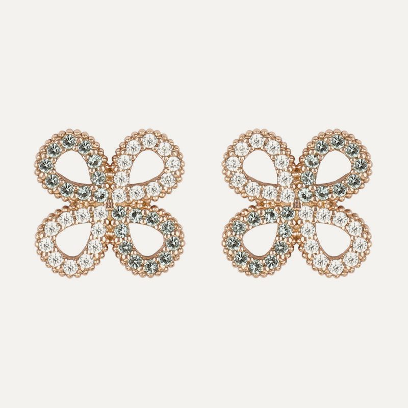 Sterling silver earrings with antique finish in the shape of a cross of 0.8 cm in diameter, from which hangs a sterling silver bead with 24 kt rose gold plating attached to a baroque pearl. The cross is made of silver with hand-set 1.25 mm zirconia, with the signature Sunfield jewelry collection’s signature outer graffiti. The set measures approximately 2.5 cm long.