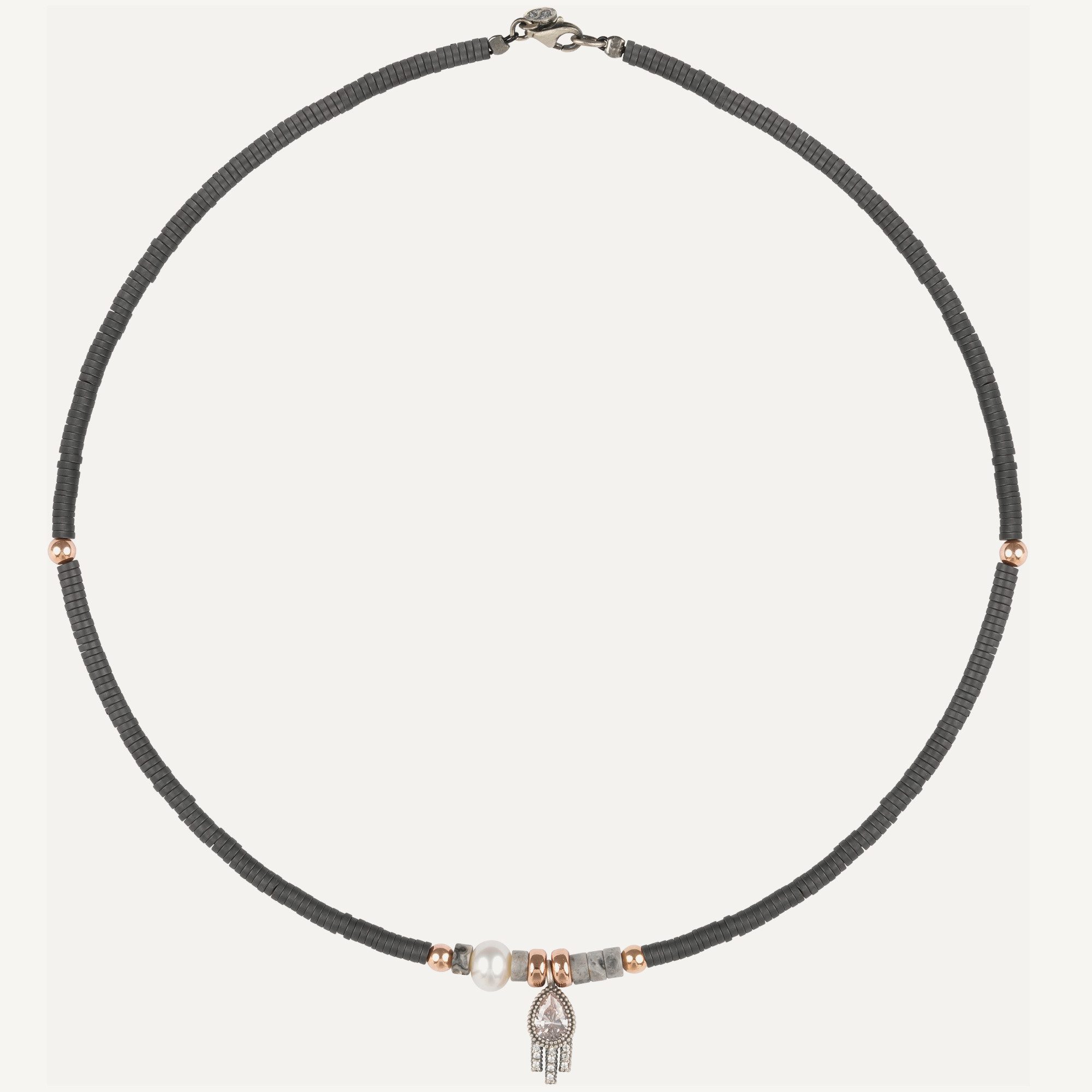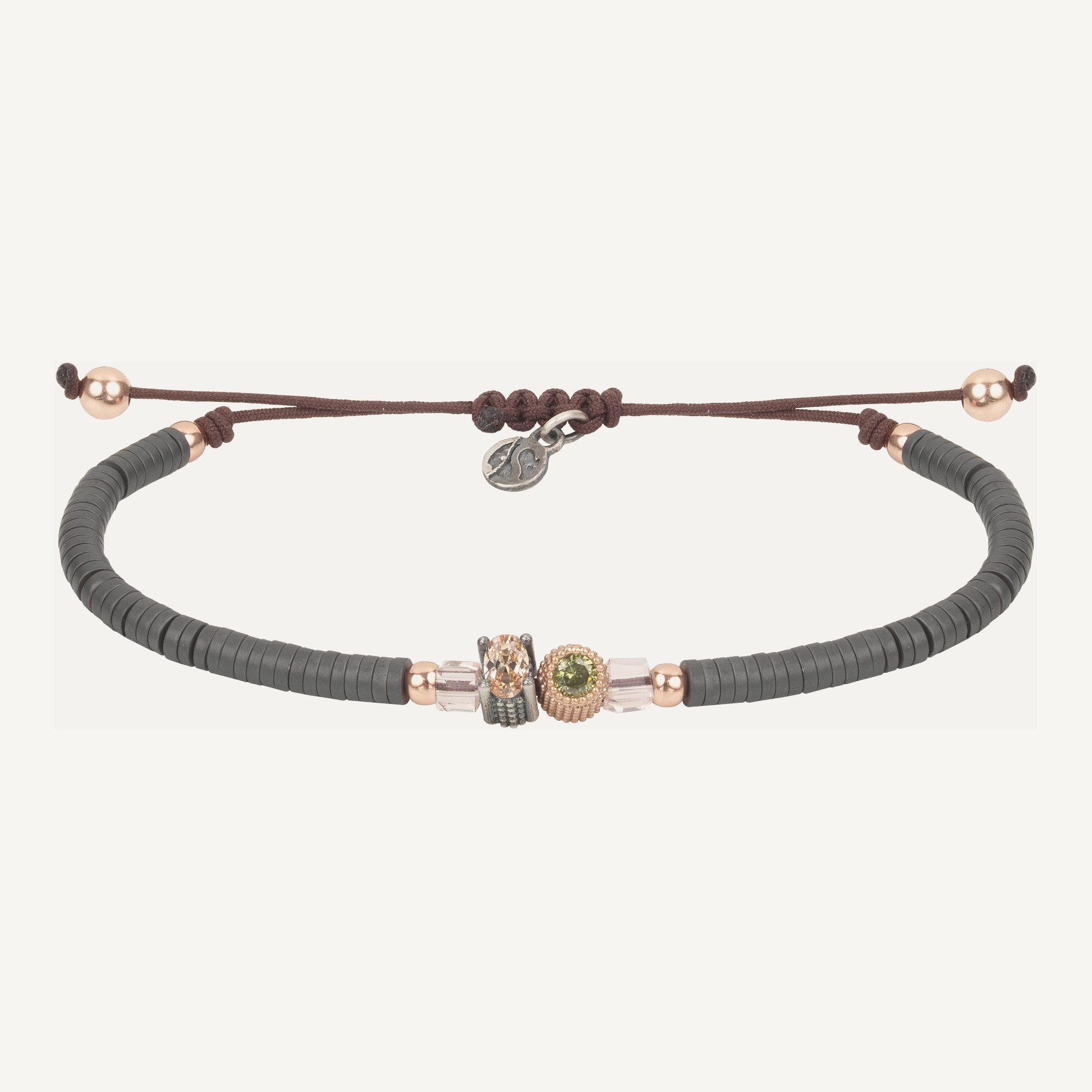 The Blan bracelet from the Noah collection in antiqued silver with 24kt rose gold plated details is a sophisticated combination of adjustable blue macrame with details that stand out for their elegance and originality. This bracelet is adorned with agates, a sparkling cava cubic zirconia, and a delicate silver interlayer with white zirconia that add a touch of luminosity. In the center, a majestic baroque pearl becomes the protagonist, adding a sense of luxury and refinement to the design.