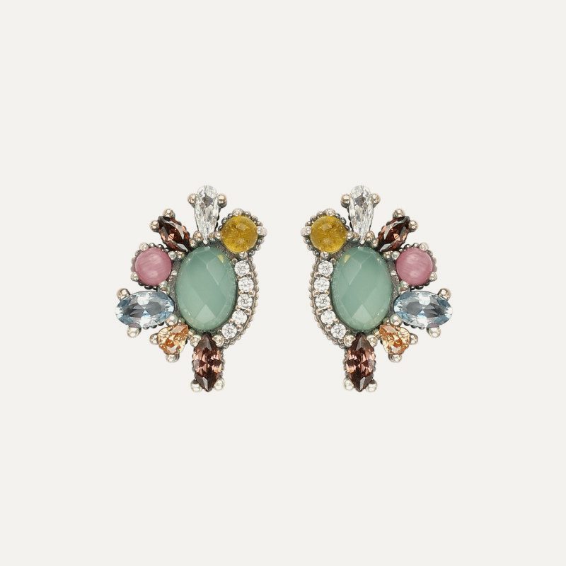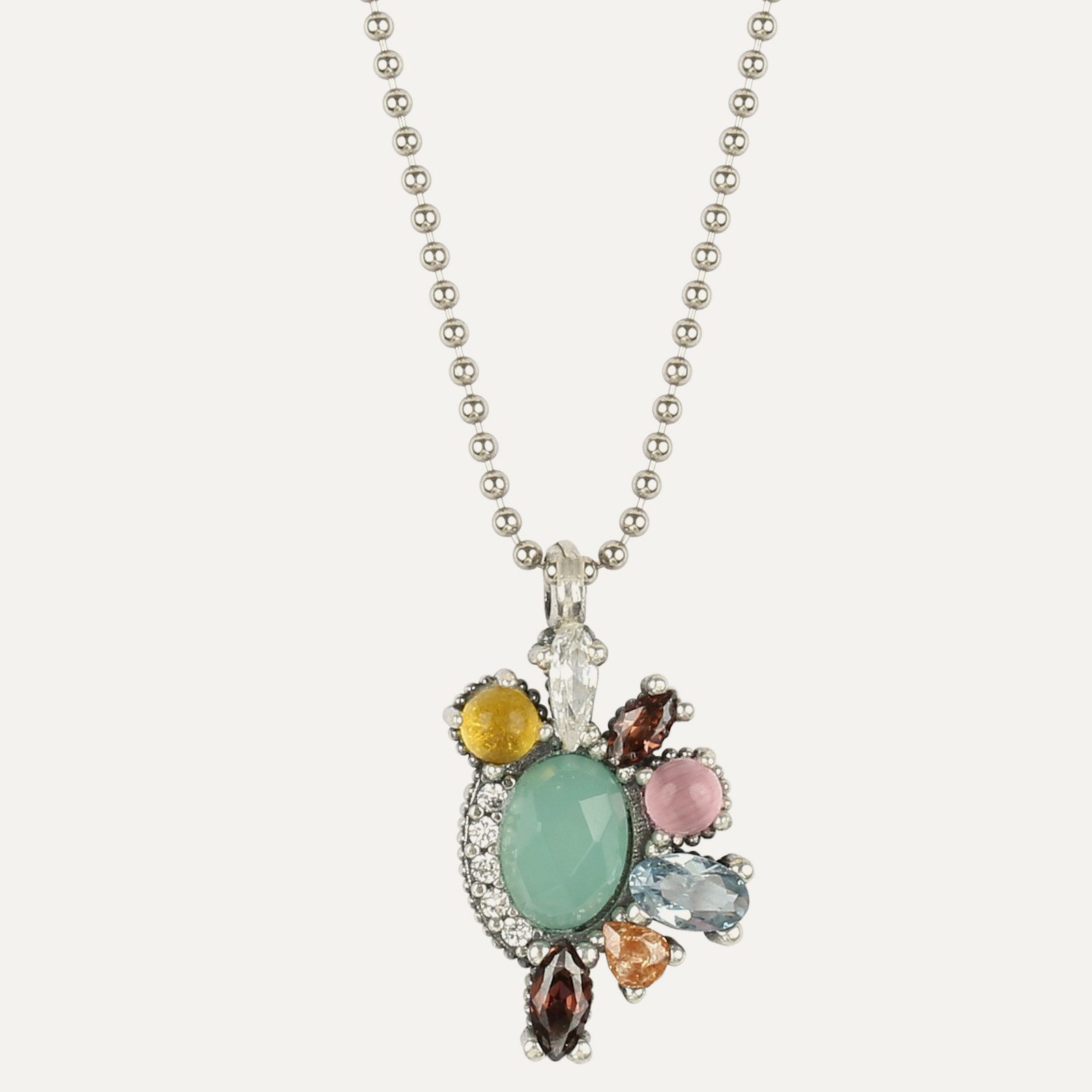 At the top of the button is an oval-shaped faceted chalcedony center surrounded by a semicircle of princess-cut white zirconia. It is surrounded by a smooth citrine cabochon and a pink fantasy quartz cabochon, a combination full of energy that attracts positivity. The design is completed by several zirconia in different sizes and colors: a drop in white zirconia, a blue oval zirconia, a pear-shaped cava zirconia, and two marquise-cut zirconia in wine color.