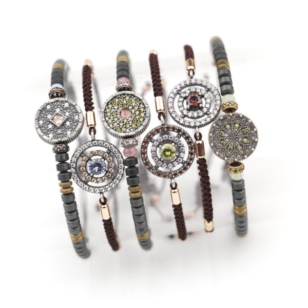 Bracelet made of sterling silver with antique finish. It highlights a cultured pearl of approximately half a centimeter in diameter, along with a pavé of zircons in three combinations to choose from. A 2 cm long zirconia bar adds balance to a sophisticated and elegant piece of jewelry. It comes with an adjustable nylon macramé available in three colors.