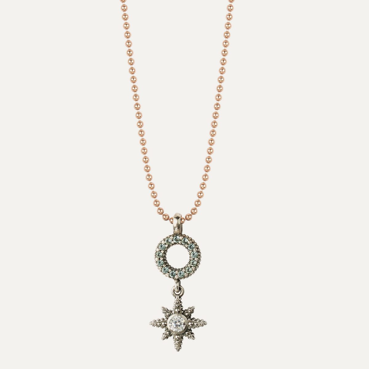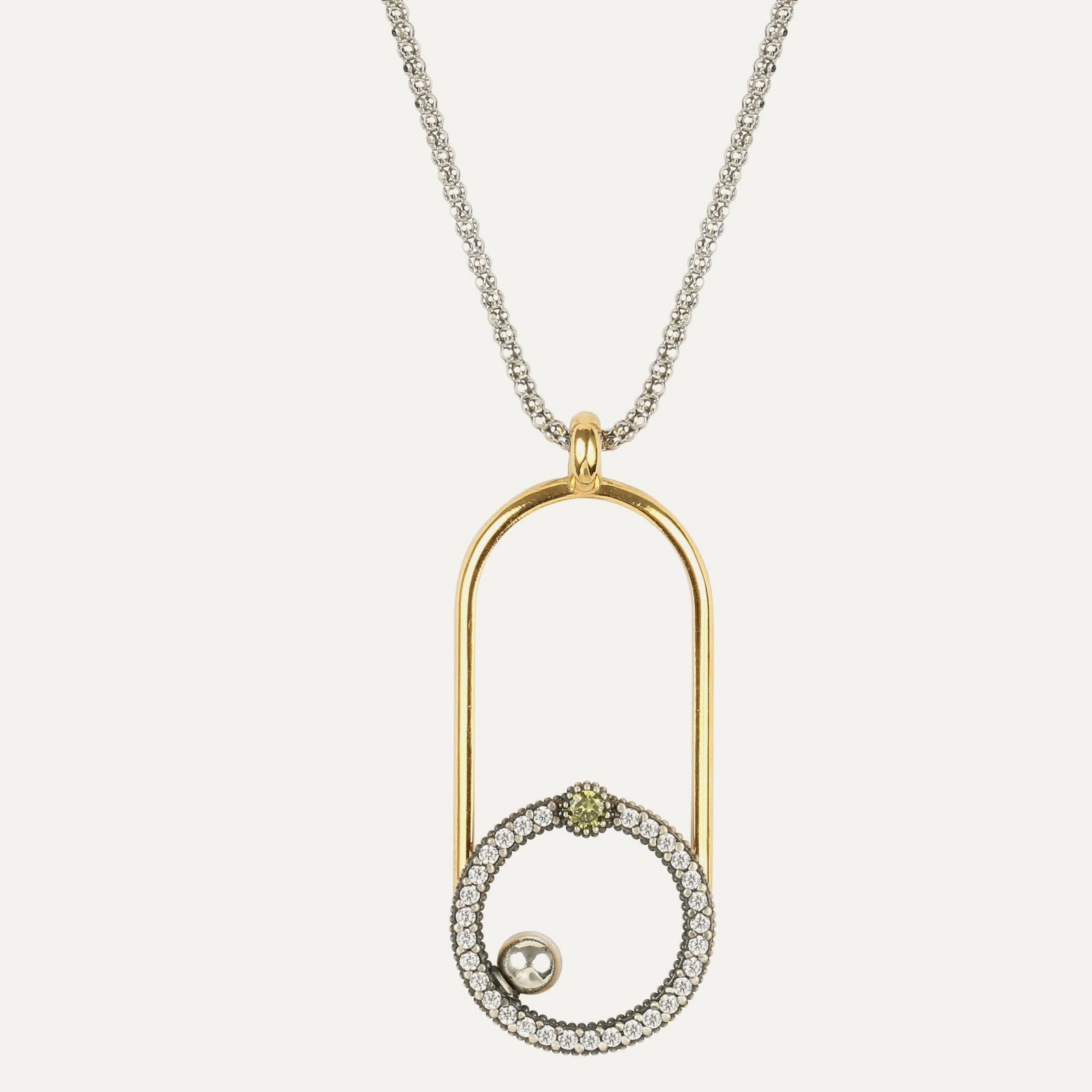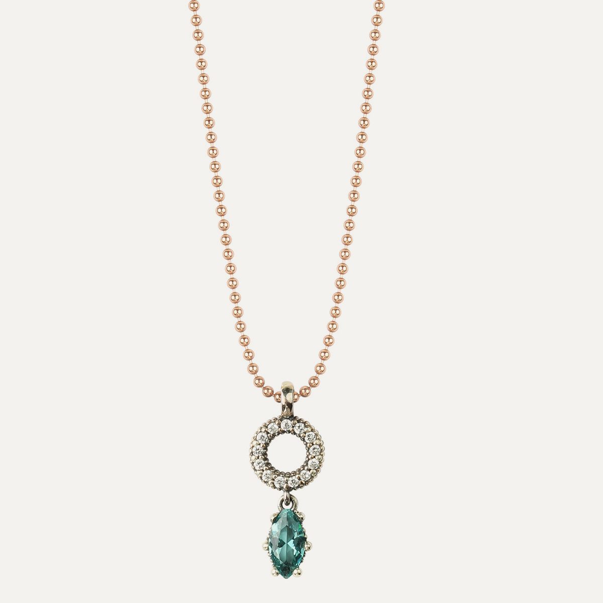 The top is a 5×3 mm baguette-cut zirconia topped by two cava-colored zircons. From a silver ring hangs an antiqued silver circle with hand-set zirconia of 1 cm in diameter. The total height of this timeless jewel is 2 cm by 1 cm wide.