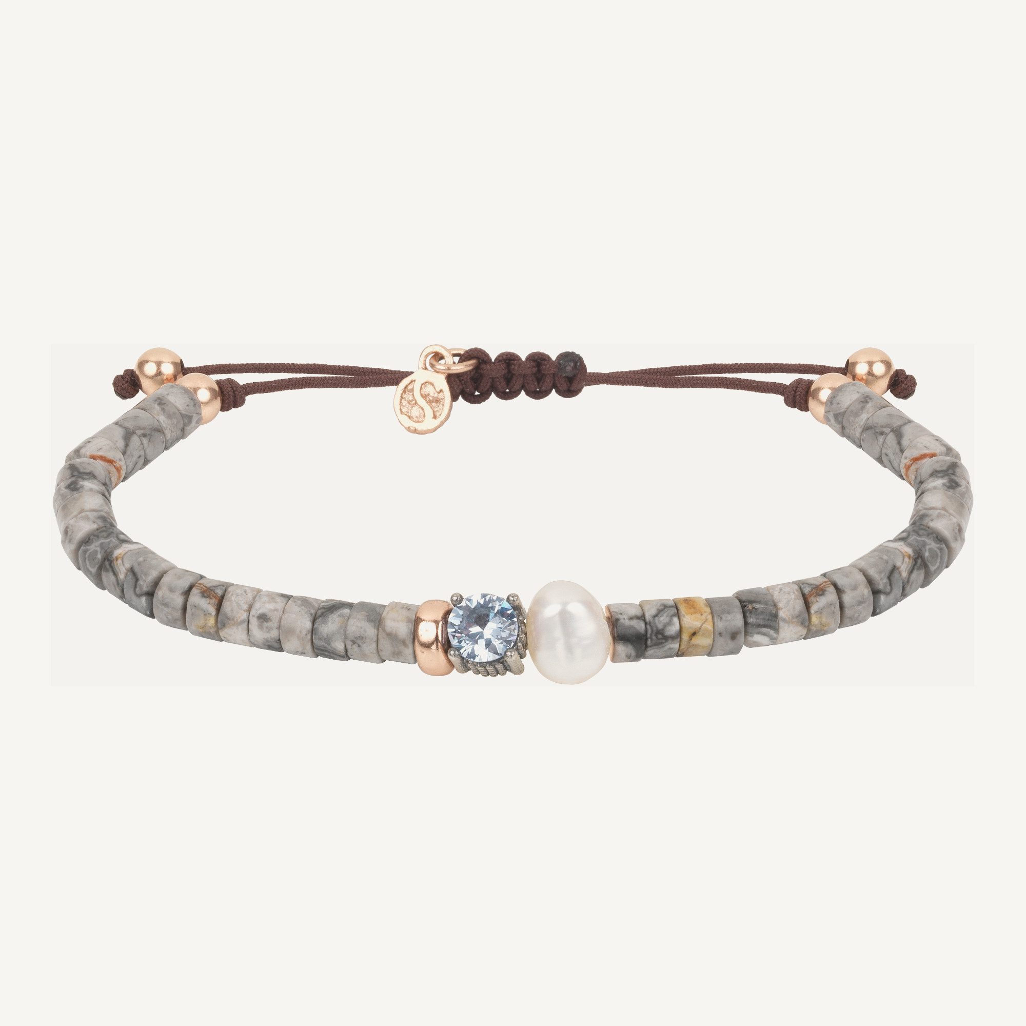 This pendant from the Formentera collection of Sunfield is made with 925 sterling silver, black jasper and hematite. It highlights as main motif a spherical pearl accompanying a striking faceted chalcedony cabochon with six brilliant cut white zircons, details in 24 kt rose gold plated silver all mounted on black steel.