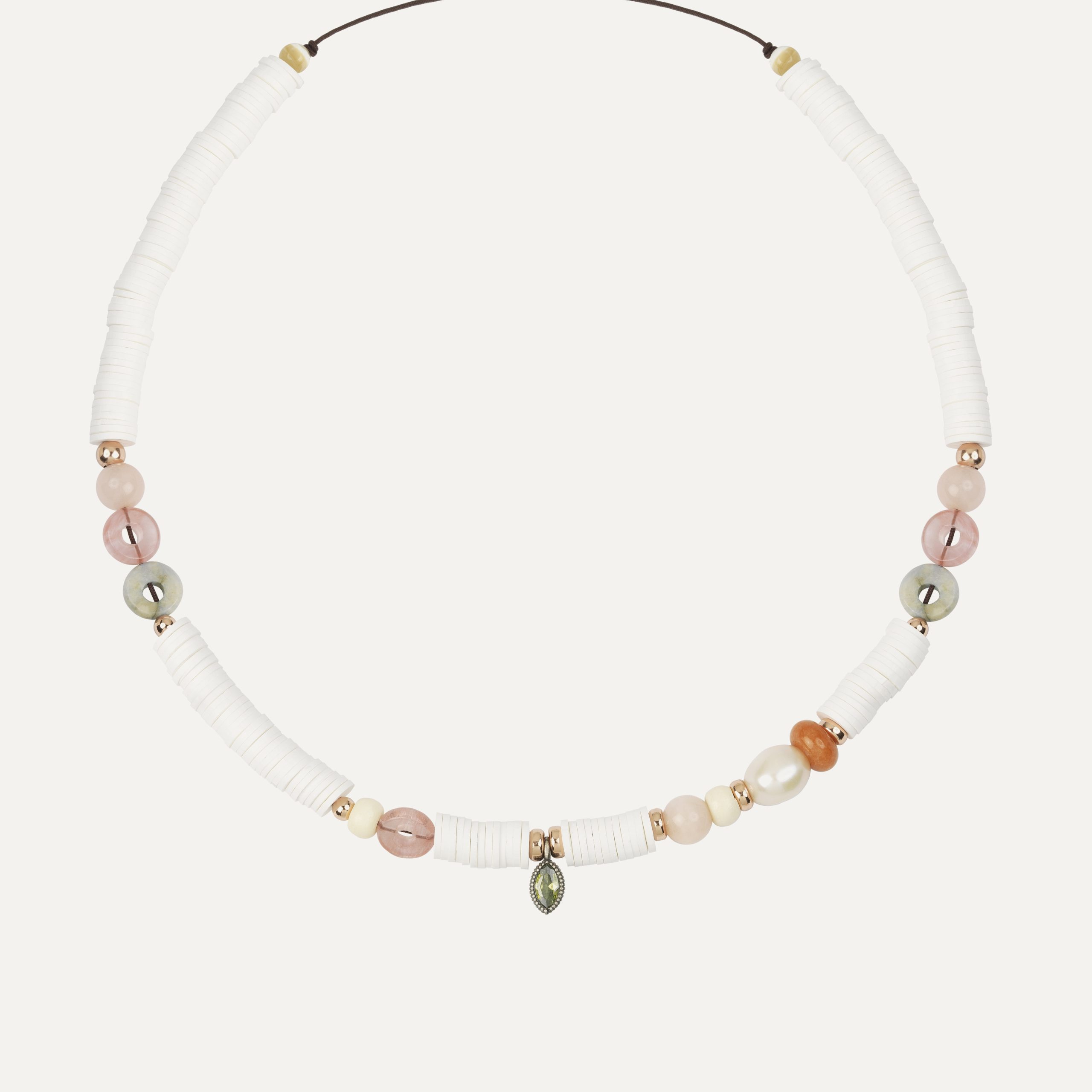 In Sunfield we are ready for summer with Katrherine pendants, with a fresh, fun and super combinable design, without giving up the characteristic style of our brand. As protagonist wears a motif of 925 sterling silver with antique finish with a champagne zirconia brilliant cut. The rest of the necklace is composed of pieces of rose gold-plated silver, glass beads and agate in blue tones, all mounted with blue nylon thread that adjusts in size as needed. A matching bracelet is also available.