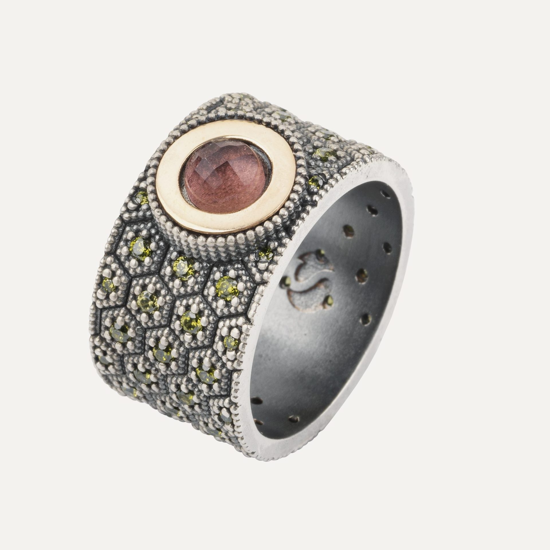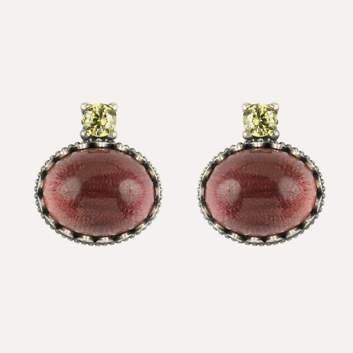 The Sunfield Pigalle pendants are balanced, with a romantic touch even ethnic, a different and original combination. Made in 925 sterling silver plated in 24 kt rose gold with a 5×7 mm oval faceted central cabochon of pink tourmaline accompanied by two 3 mm diameter pearls, a 3 mm diameter smooth cabochon of green chalcedony, a brilliant cut brown zirconia and a teardrop cut champagne zirconia. Chain length 42 cm.