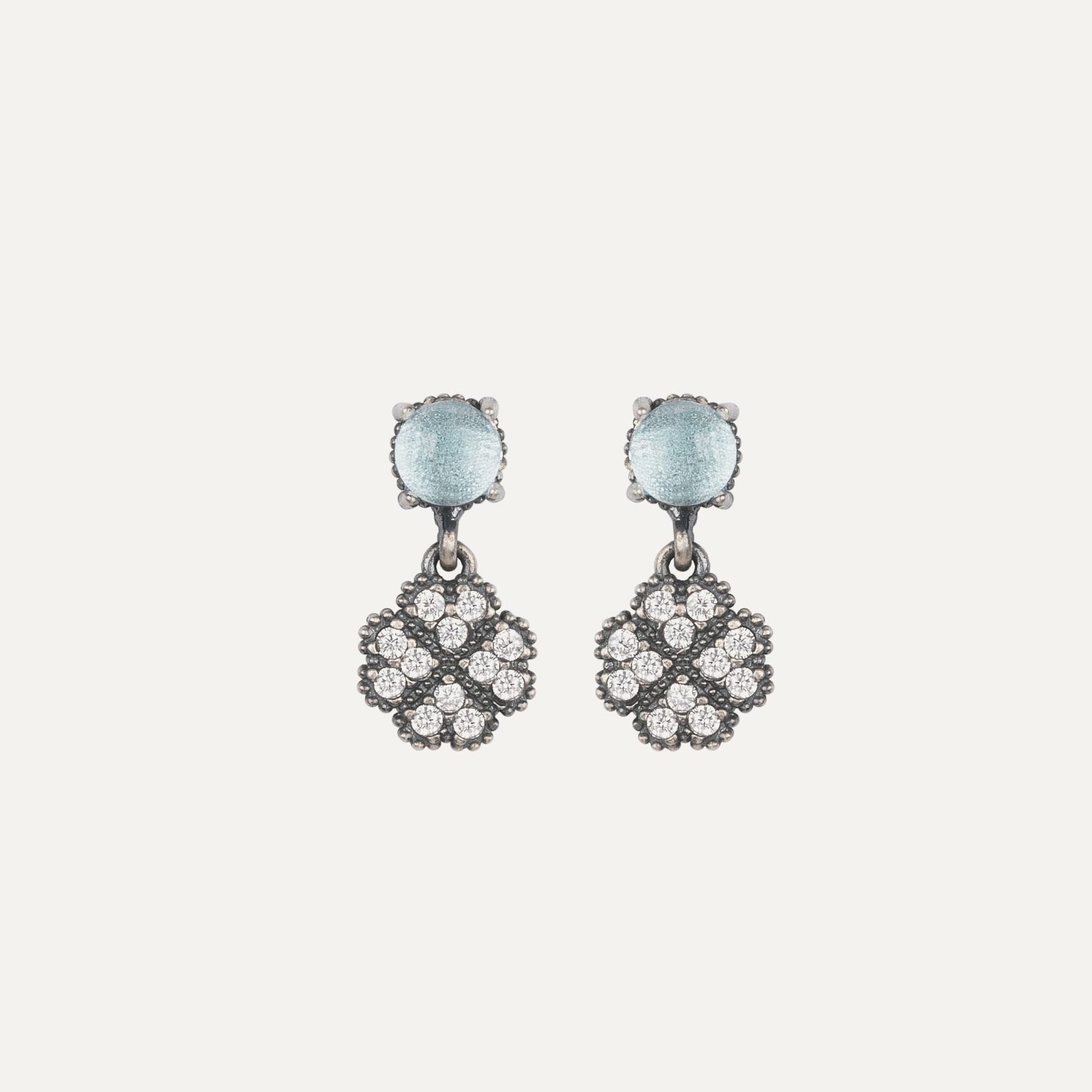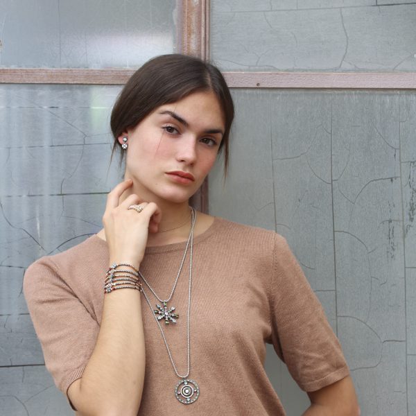 The Sunfield Pigalle pendants are balanced, with a romantic and even ethnic touch, a different and original combination. Made in 925 sterling silver with a smooth central cabochon of 10×8 mm of chalcedony accompanied by four smooth cabochons of 3 mm in diameter of rose quartz and blue opal simile. As a final touch it has a white teardrop cut cubic zirconia. Chain length 42 cm.