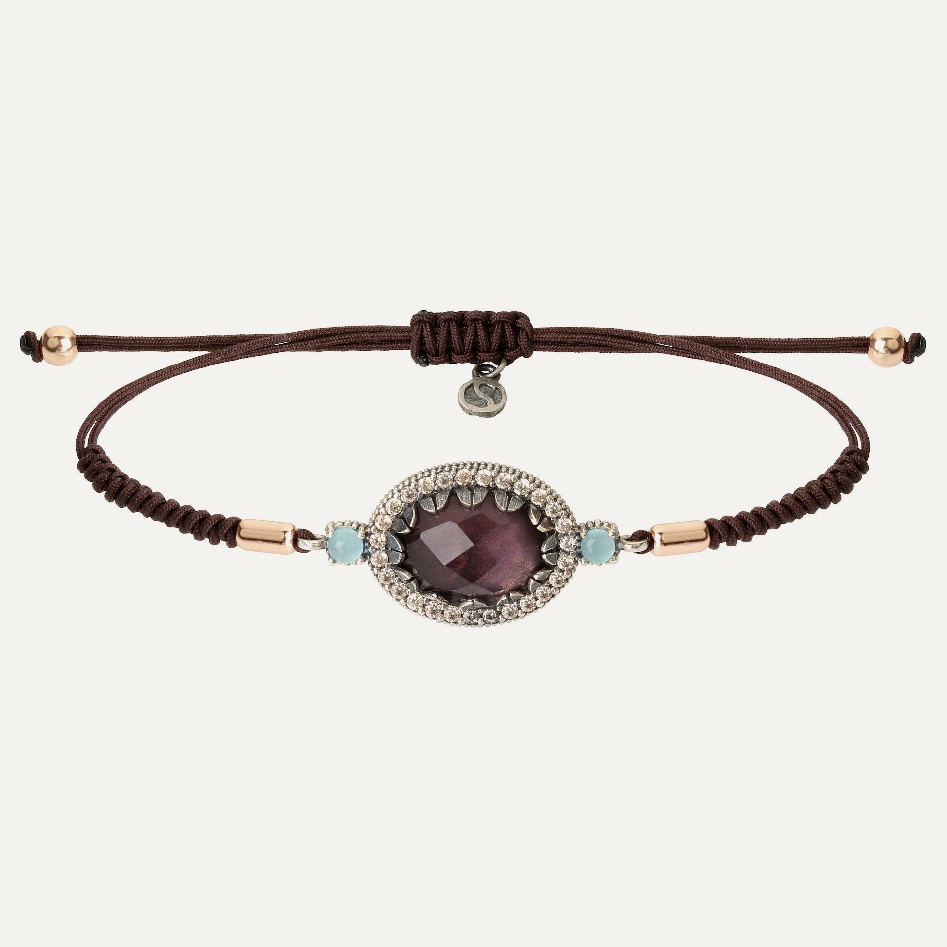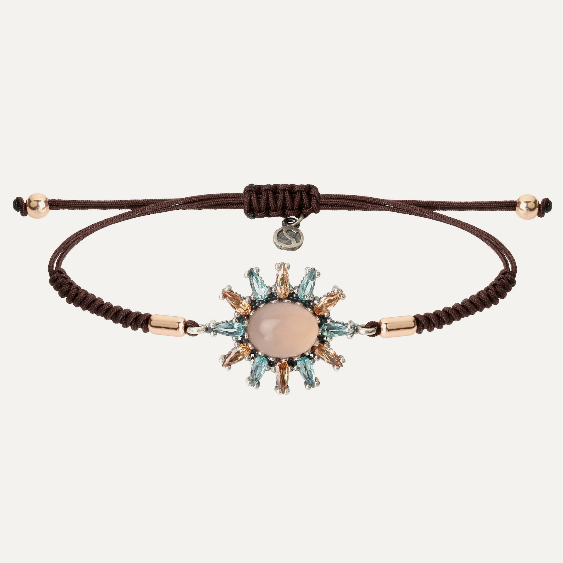 In this case it is a pair of earrings type you and me of 1cm wide by 0.5cm high set in sterling silver and topped by a brilliant cut white zirconia. They are available in three color combinations: antique finish, blue opal and cava; antique finish, pink tourmaline and green peridot; or 24kt rose gold plated, rose quartz and white zirconia.