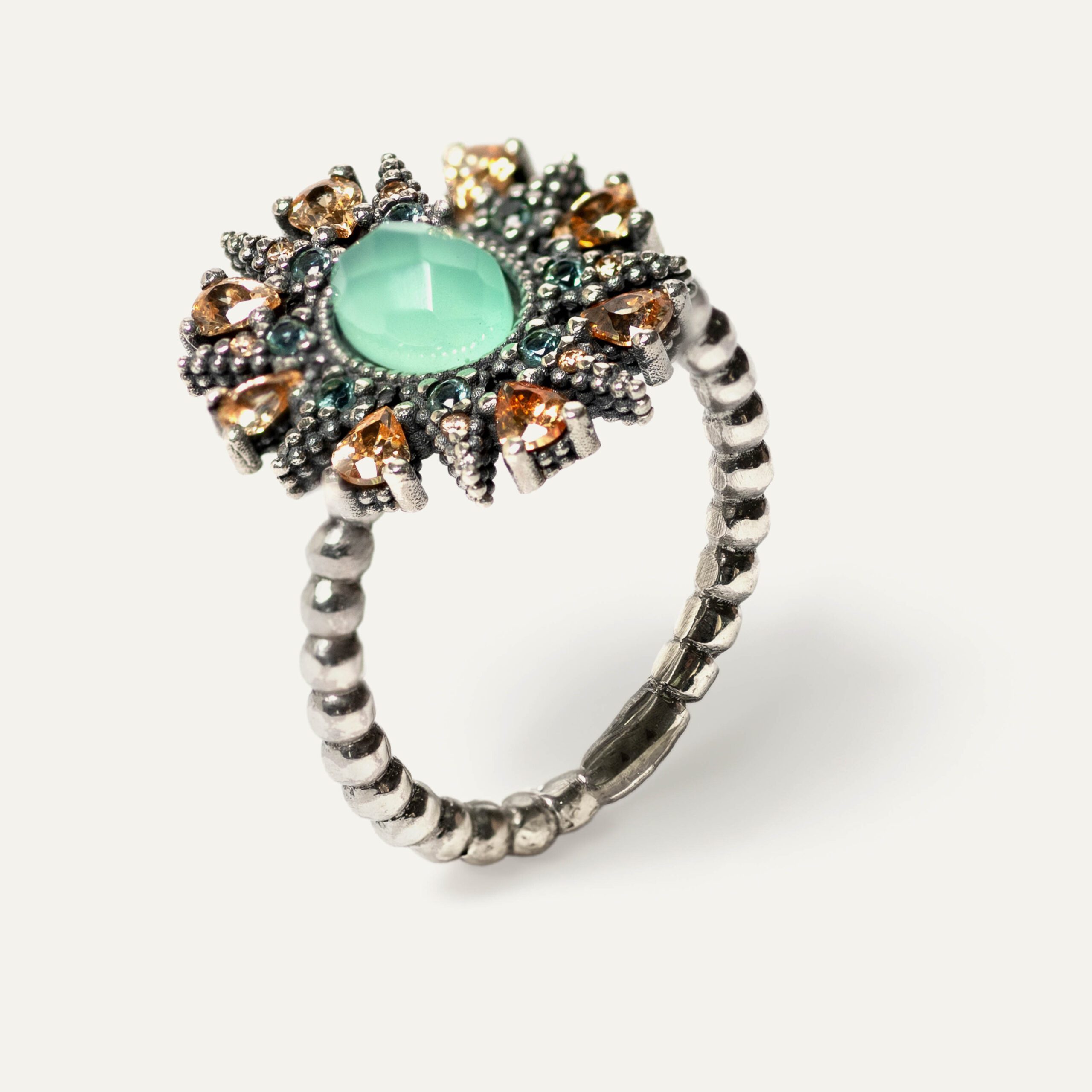 Spectacular ring handmade in sterling silver with antique finish, zircons nailed one by one by our artisan jewelers in Sunfield’s workshop in Barcelona, and a spectacular faceted quartz that will captivate all eyes. You can choose it in tourmaline or rose quartz. A ring of approximately 1.5cm x 2cm in diameter that will captivate all eyes. The arm is made in sterling silver with brilliant-cut zirconia, and surrounding the central cabochon an oval of brilliant-cut zirconia. The classic external engraving that is already a hallmark of Sunfield jewelry finishes the set.