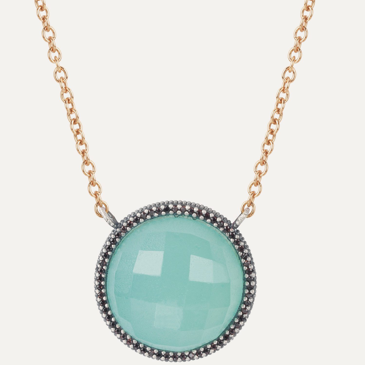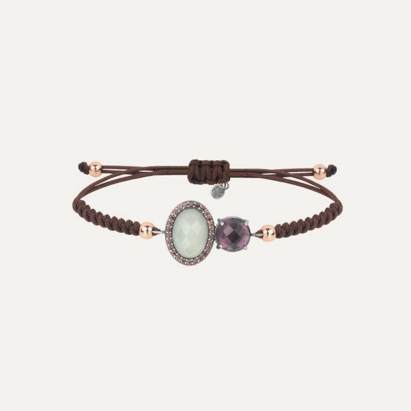 The Sa Riera of Sunfield are vintage-inspired jewelry, with a bohemian air and a very romantic aesthetic. The pendant is made of 925 sterling silver plated in 24 kt rose gold of 17×15 mm and is composed of a smooth oval cabochon of pink tourmaline, an oval faceted cabochon of smoky quartz and brilliant cut peridot zirconia. Rose gold plated silver chain 42 cm long.