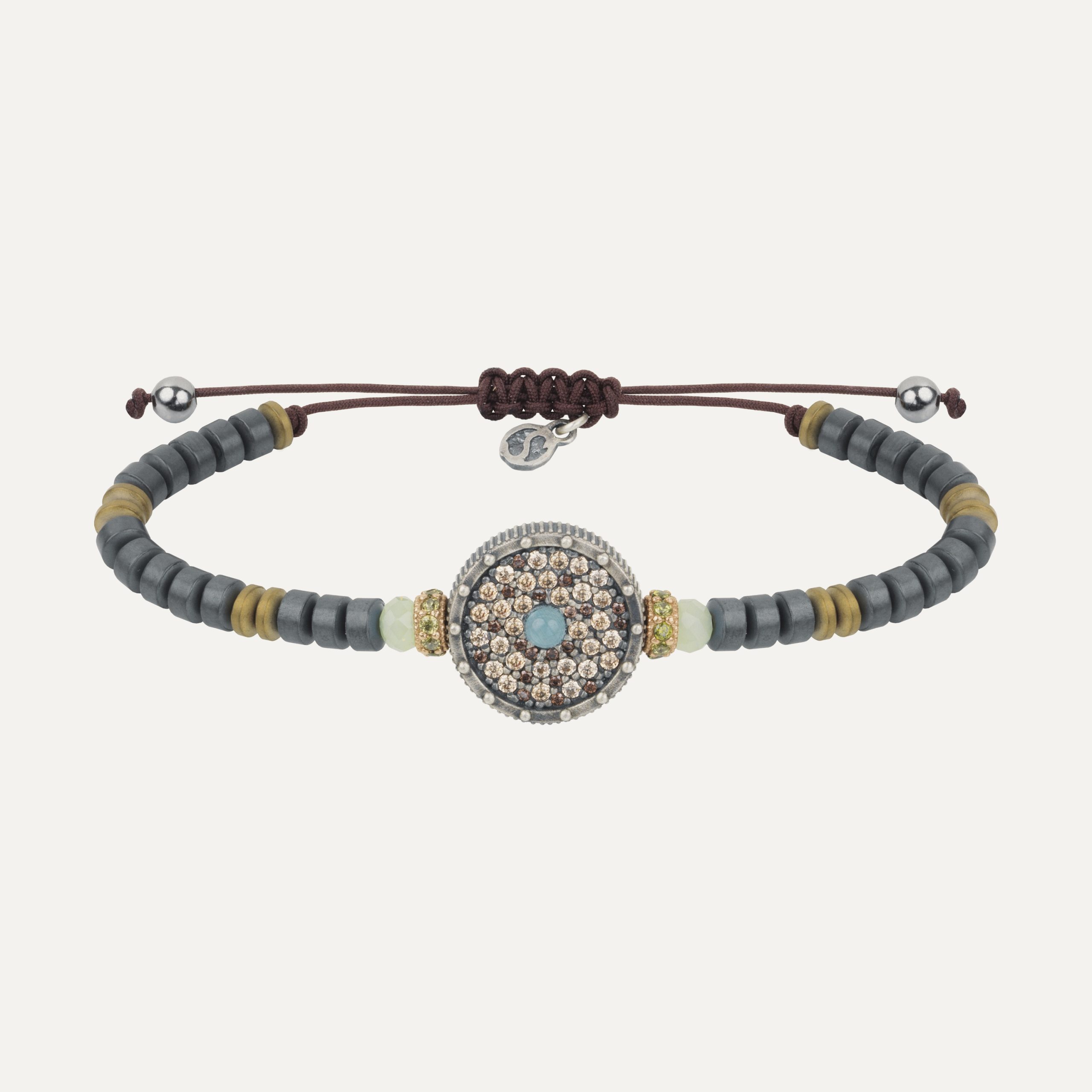 The Sunfield Sena pendants have the classic medal shape although they have little classic in their design. Pendant made of 925 sterling silver 15.5 mm in diameter with a central smooth cabochon of blue opal simile surrounded by champagne and brown brilliant cut zirconia. Silver chain 42.5 cm long.