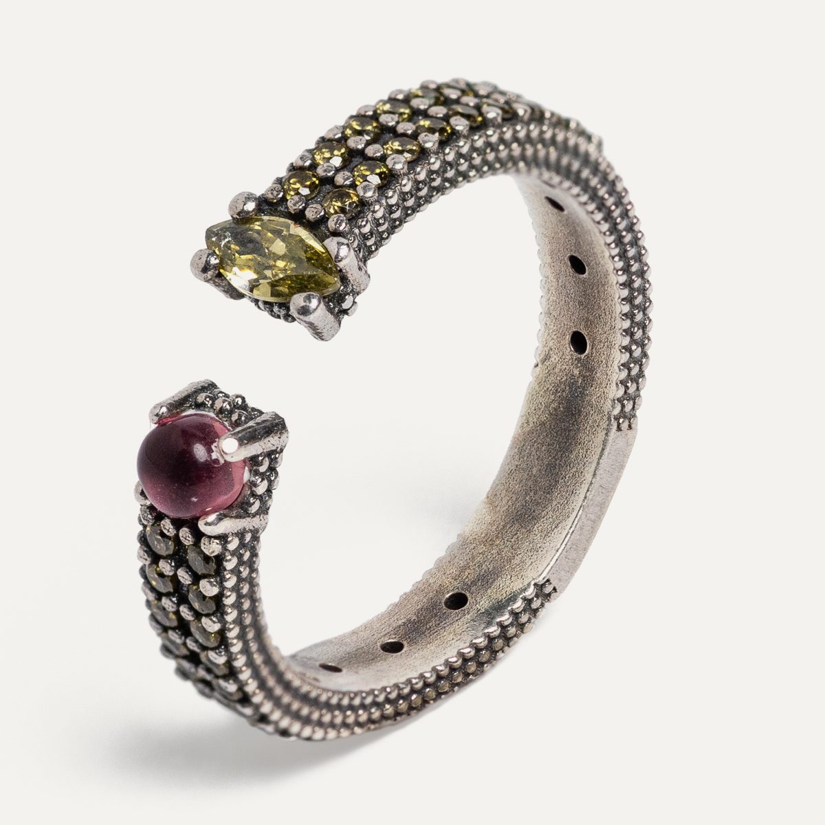 From a faceted chalcedony cabochon with oval shape accompanied by two marquise-cut cava zirconia, hangs a piece that begins in a silver star with antique finish and a central white zirconia in brilliant cut. Round and smooth pink tourmaline cabochon, and a 1 cm faceted gray quartz, also with oval shape, embraced by a silver base with antique finish and the graffiti that is already a symbol of Sunfield.