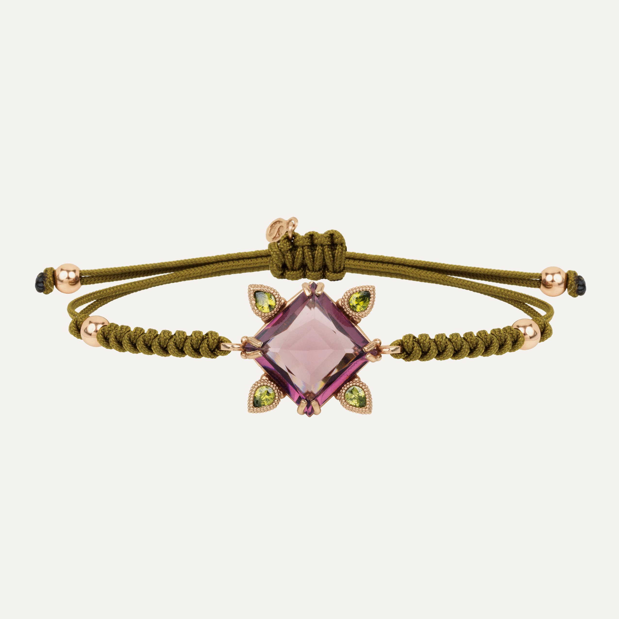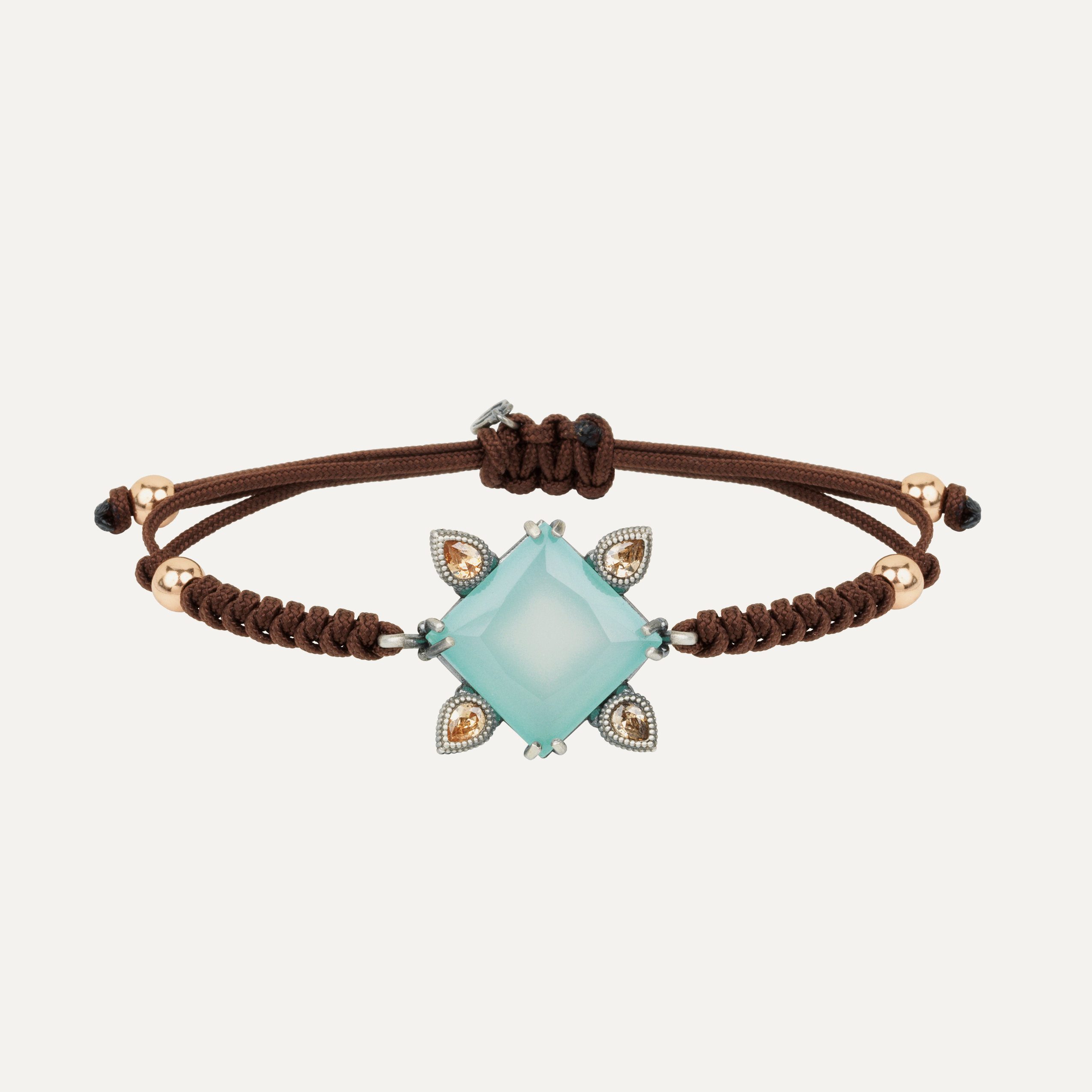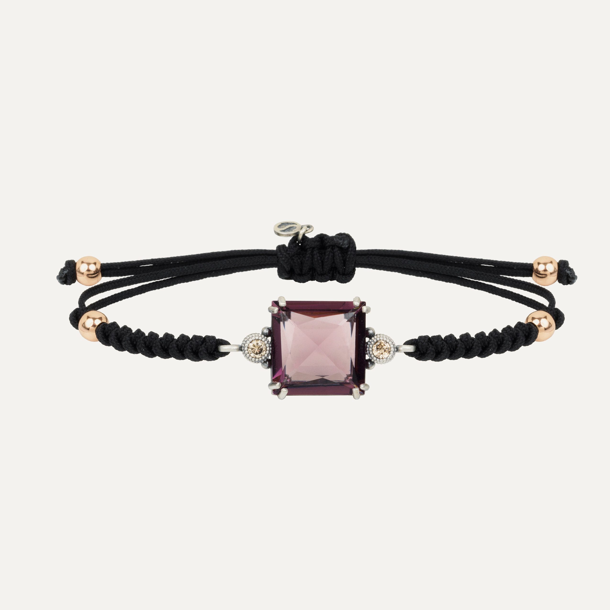 The Tamariu bracelet from Sunfield plays with the symmetries of its shapes and elegantly combines different tones and textures. It is assembled with a resistant black nylon thread and is composed of a central hexagonal motif of black rhodium-plated silver and 24 kt rose gold plated 17×17 mm adorned with champagne brilliant cut zircons. It is adjustable in size.