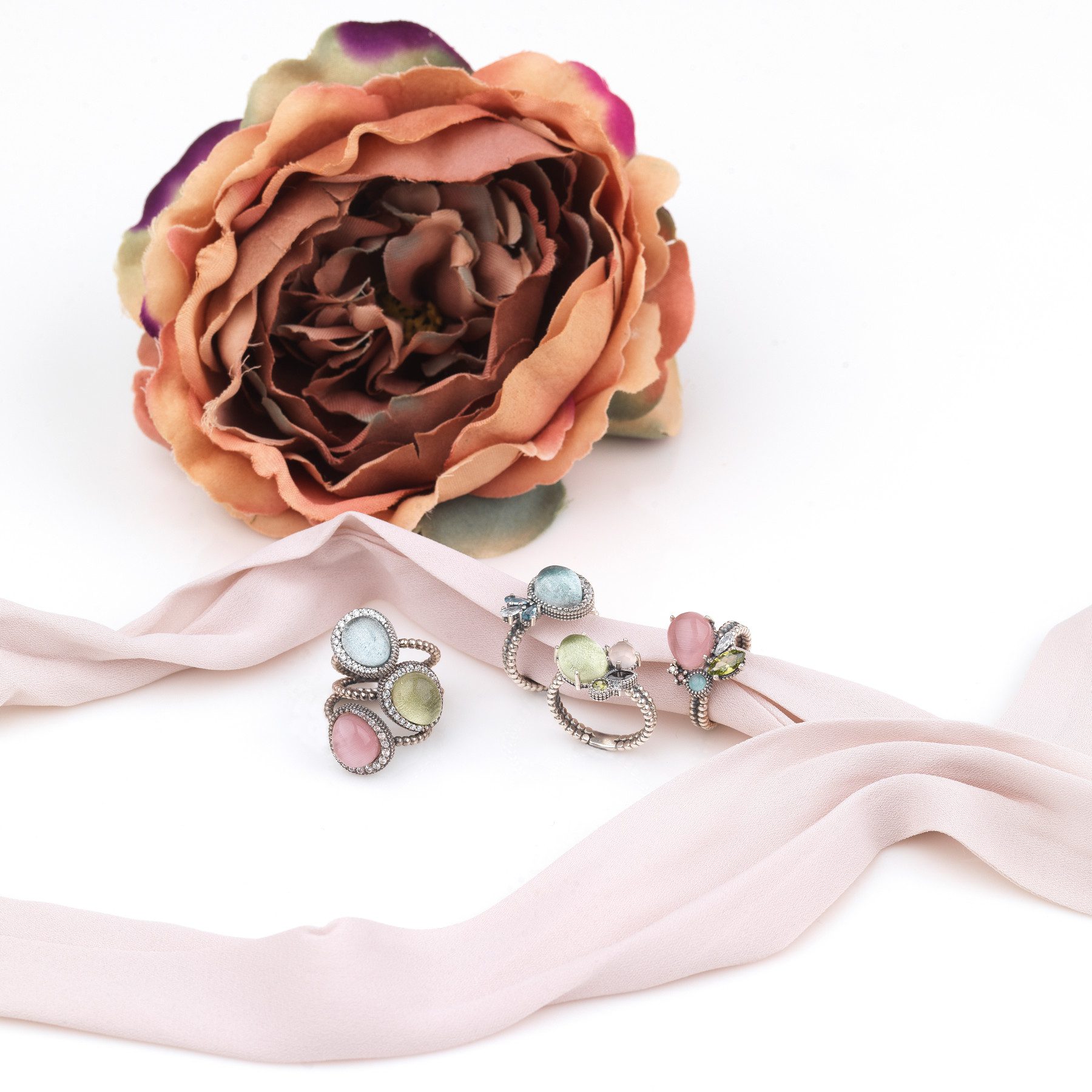 A simple and elegant silver ring that is the perfect detail for your oufits, both day to day and for a special occasion. It is handmade in sterling silver with antique finish and consists of a 5mm cabochon in opal blue, rose quartz or apple green to choose from, surrounded by zircons in different sizes to give it an irregular look that is fashionable in jewelry.