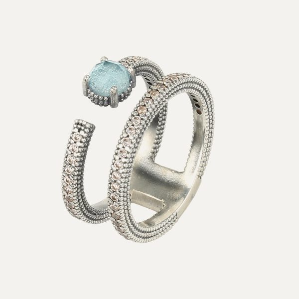 925 sterling silver ring with antique finish, aquamarine and cava and brilliant cut zirconia hand set.