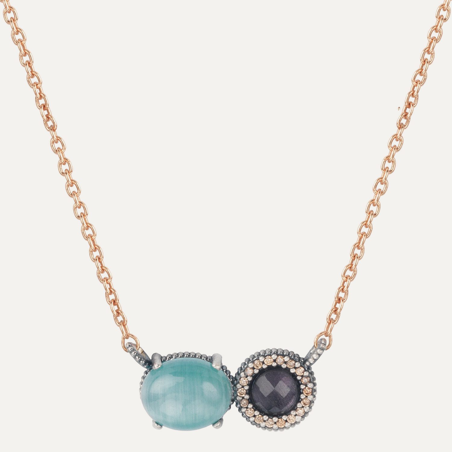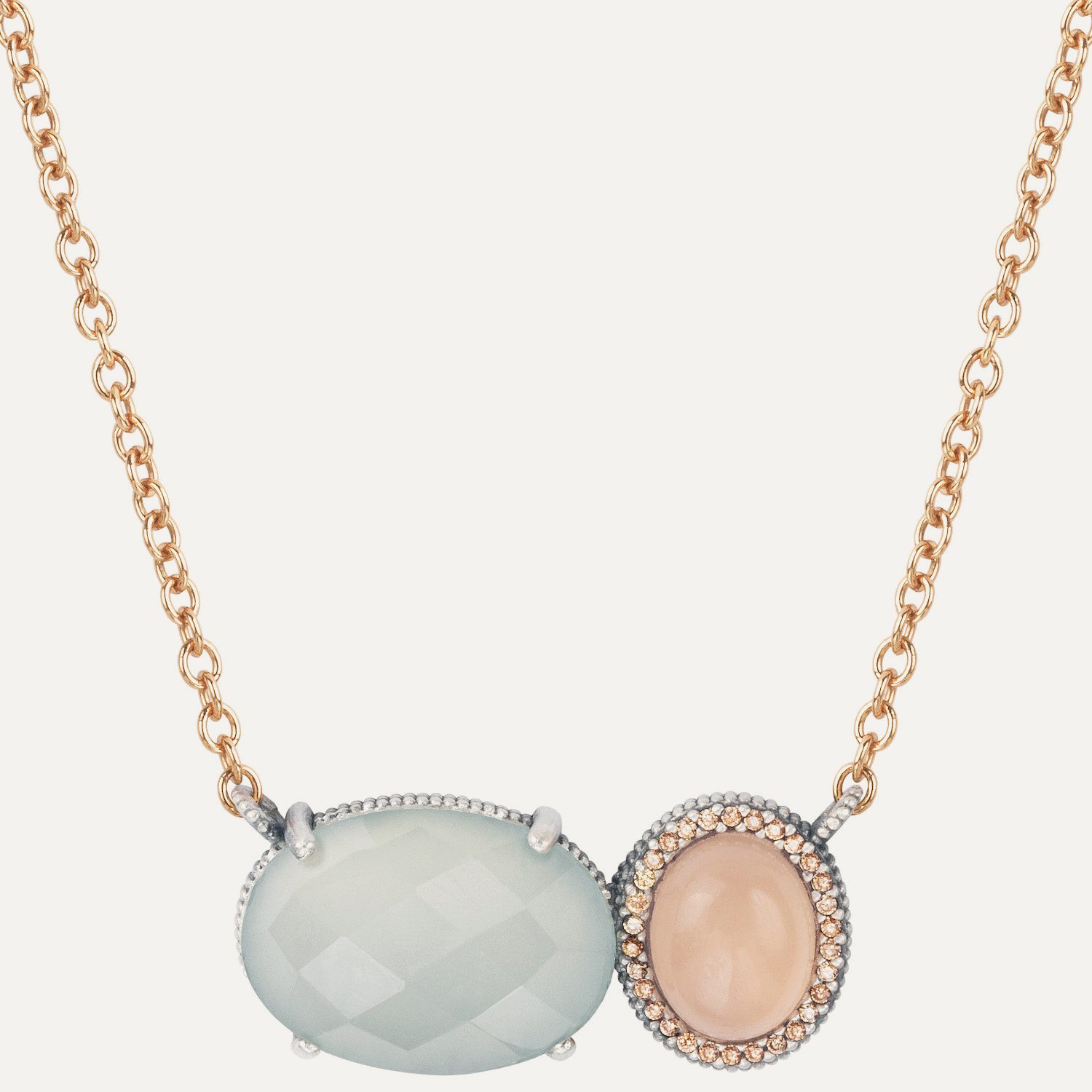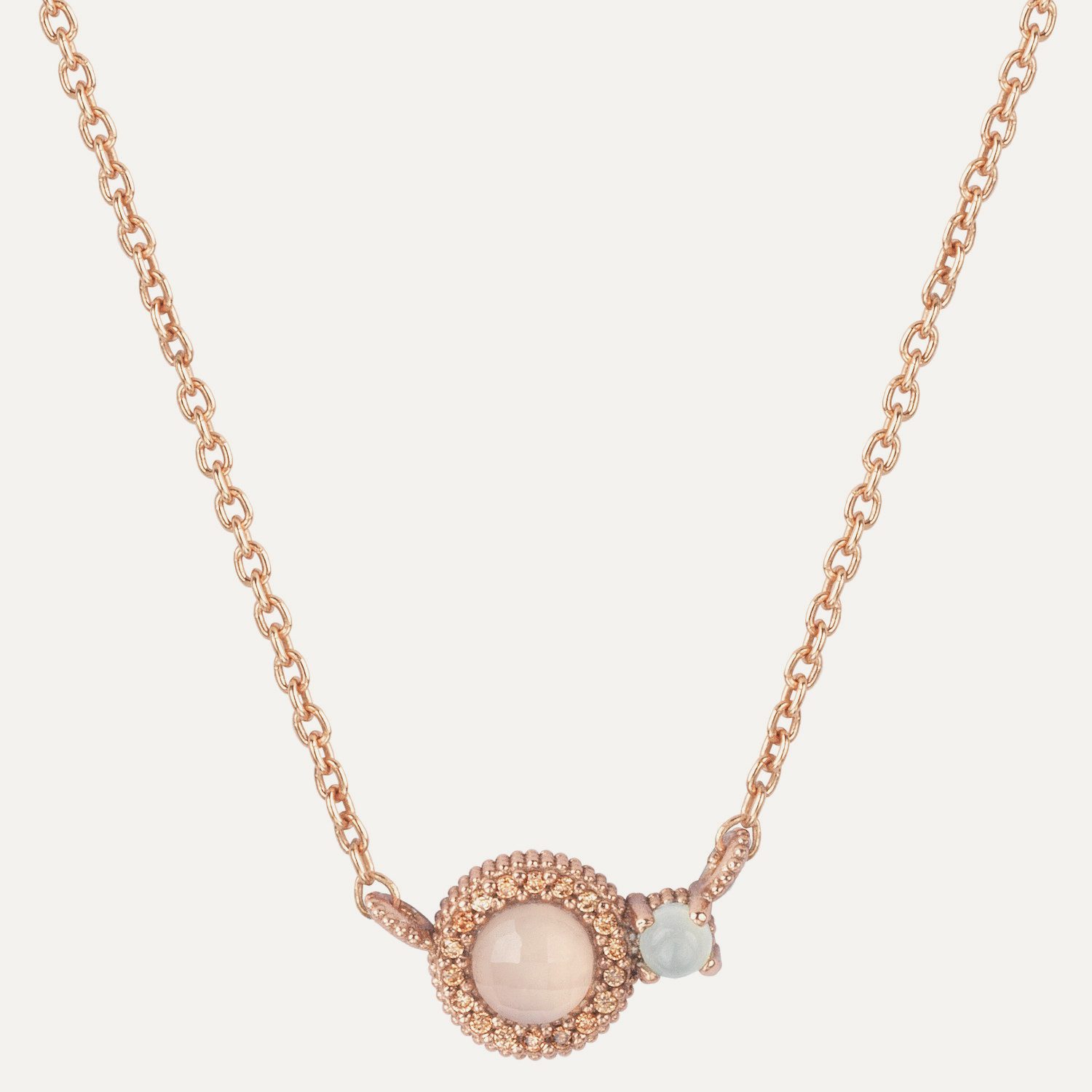 Pendant made of 925 sterling silver with 24kt rose gold plating, rose quartz, chalcedony and zirconia.
