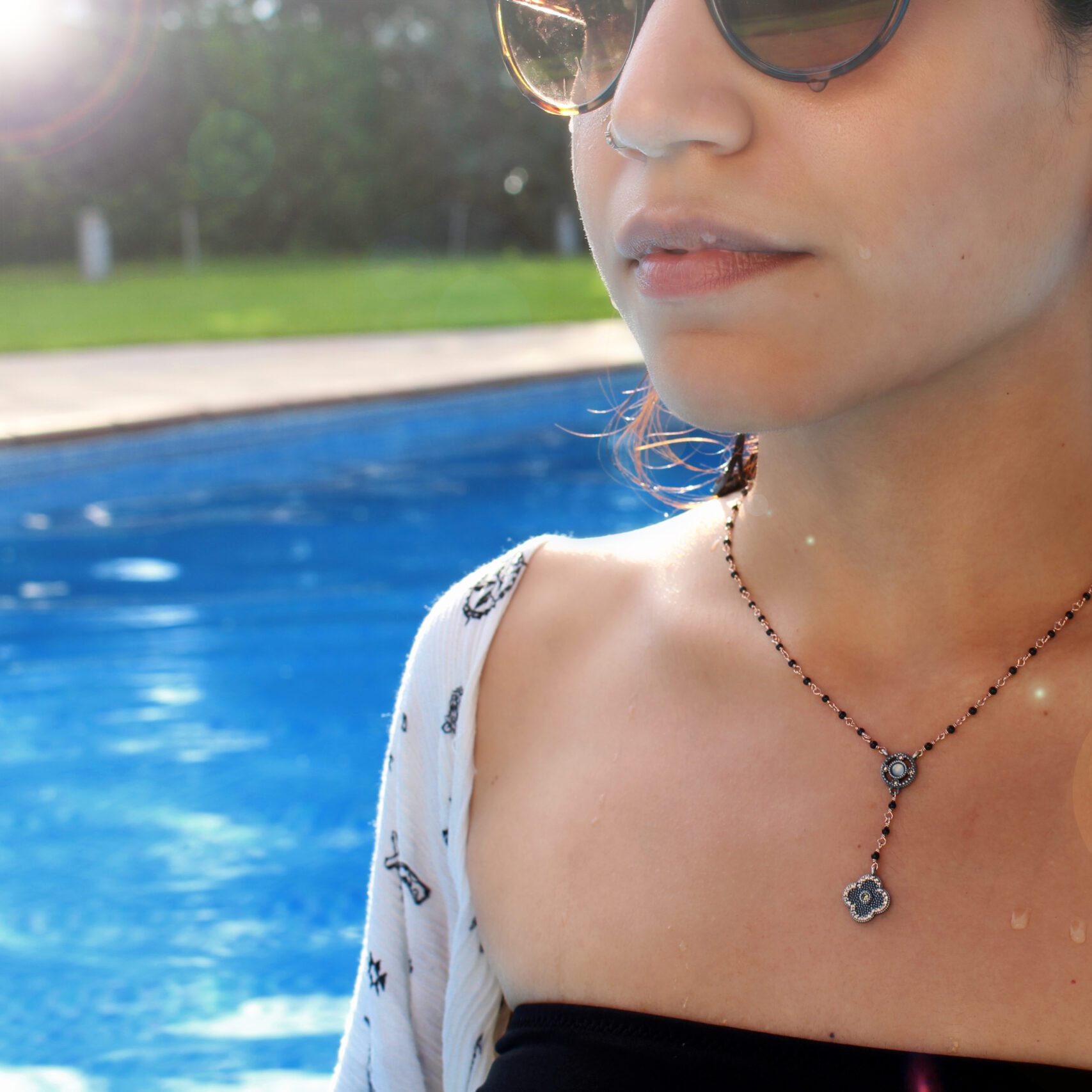 925 sterling silver pendant with antique finish, chalcedony, rose quartz and zirconia.